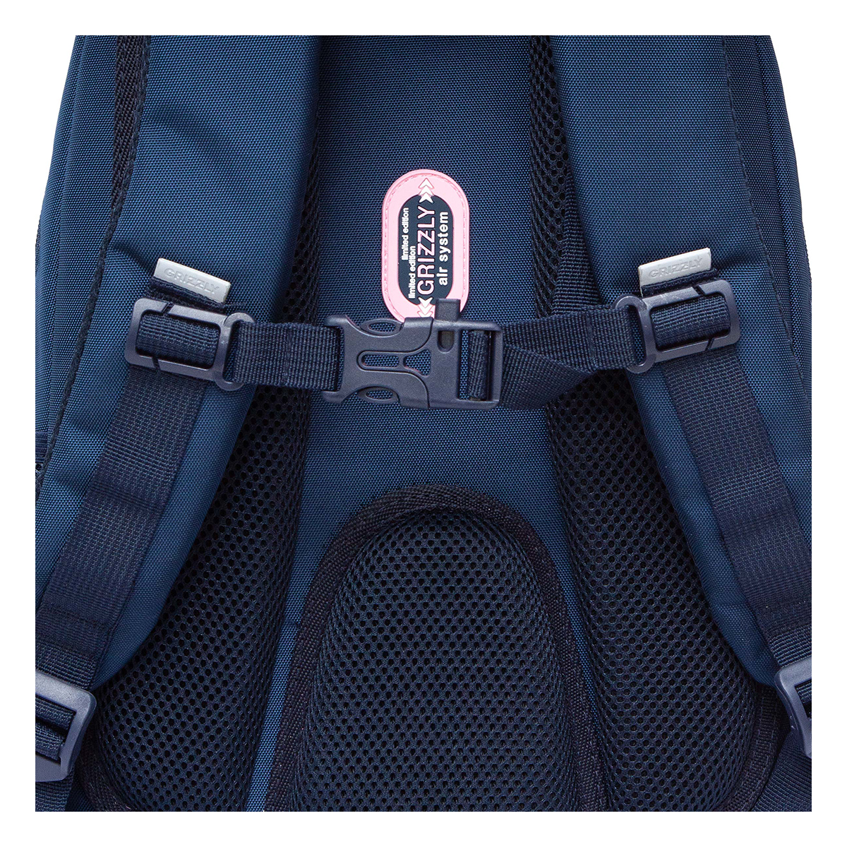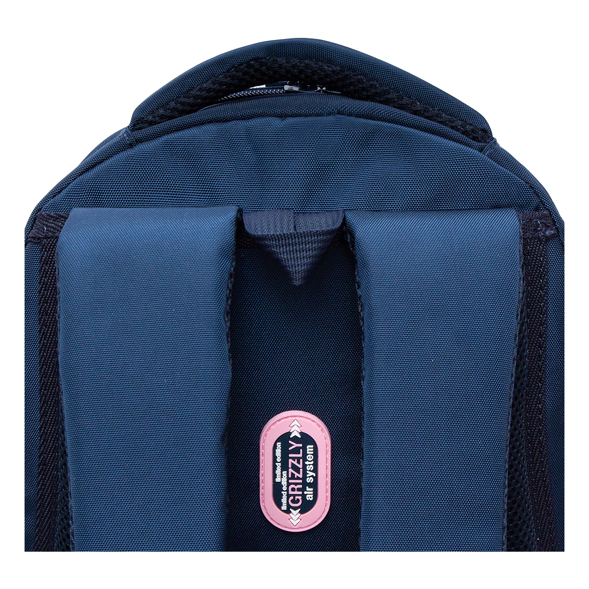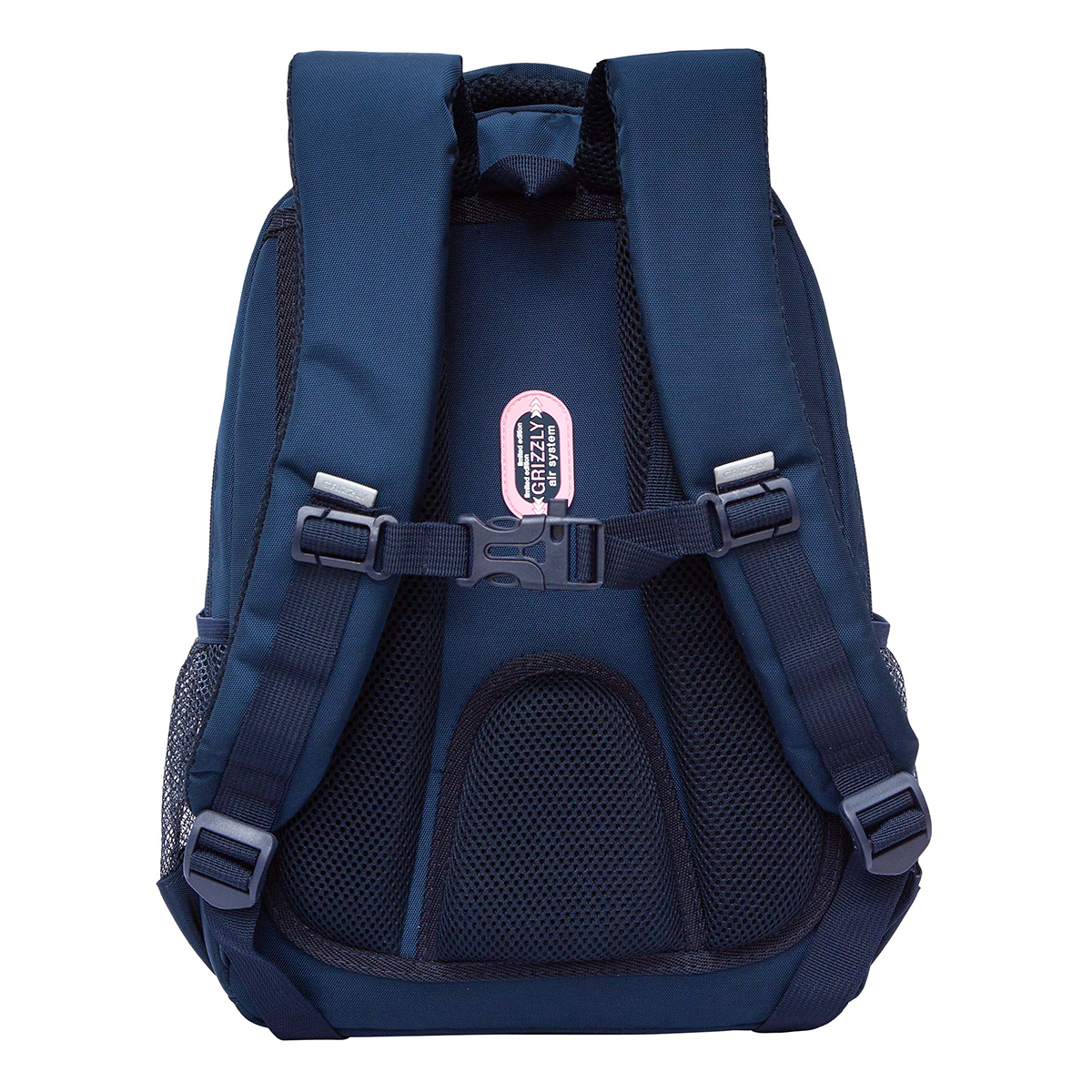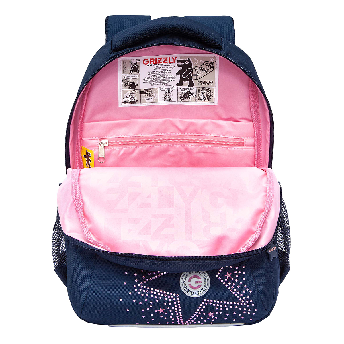 Школьный рюкзак GRIZZLY, три отделения, боковые карманы из сетки, внутренний карман для электронных устройств, внутренний составной пенал-органайзер, внутренний держатель для ключей - фастекс, жесткая анатомическая спинка, мягкая укрепленная ручка, нагрудная стяжка-фиксатор, петля для подвешивания, укрепленные лямки, помещается А4, светоотражающие элементы с четырех сторон
