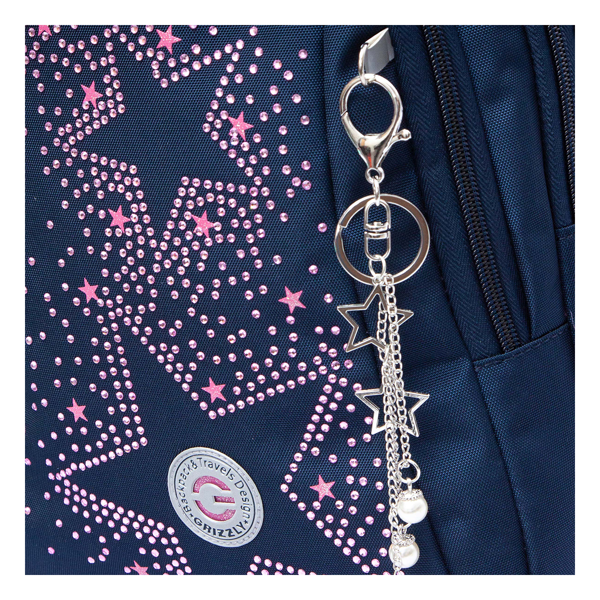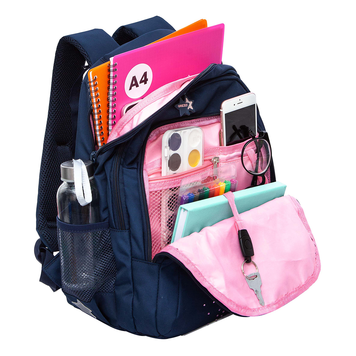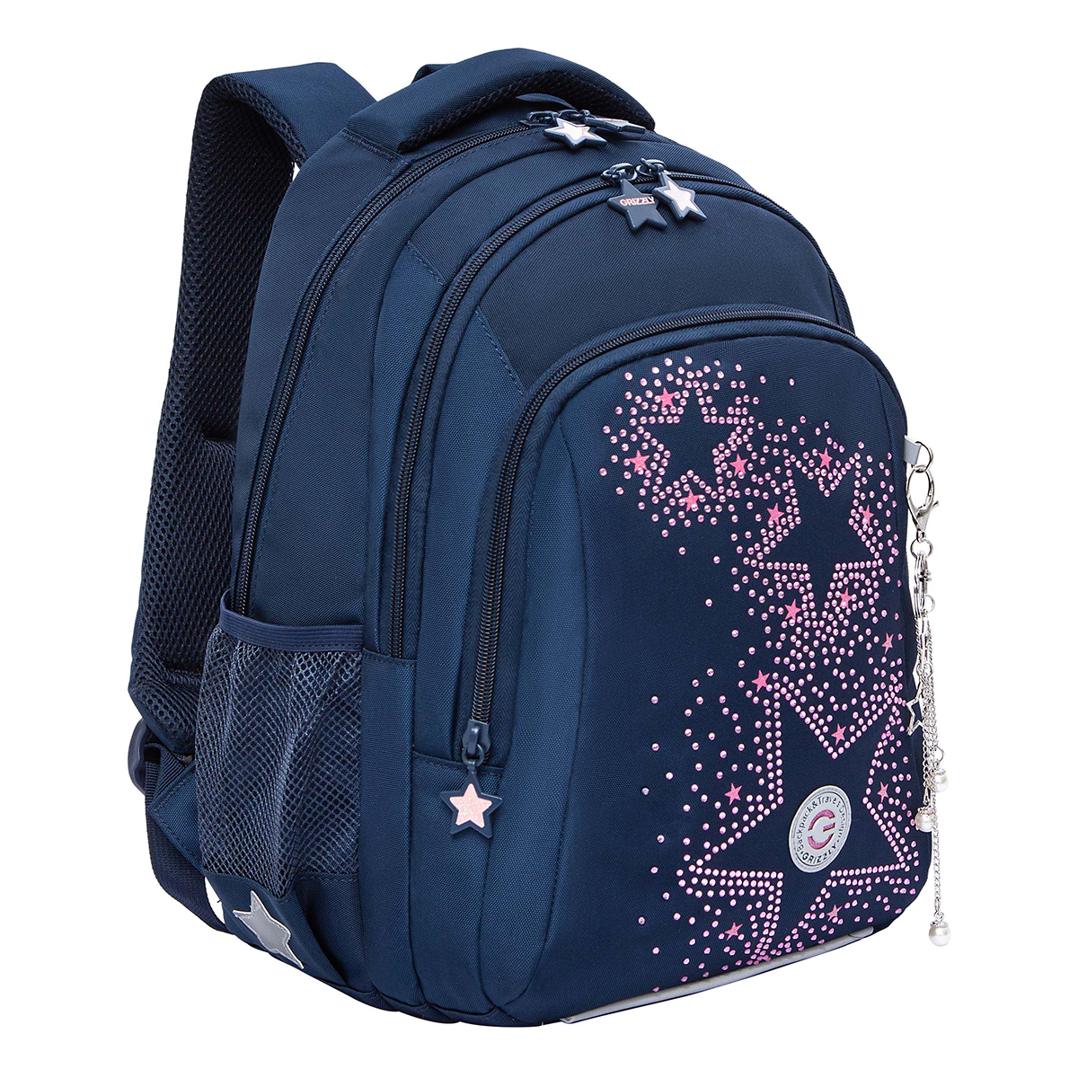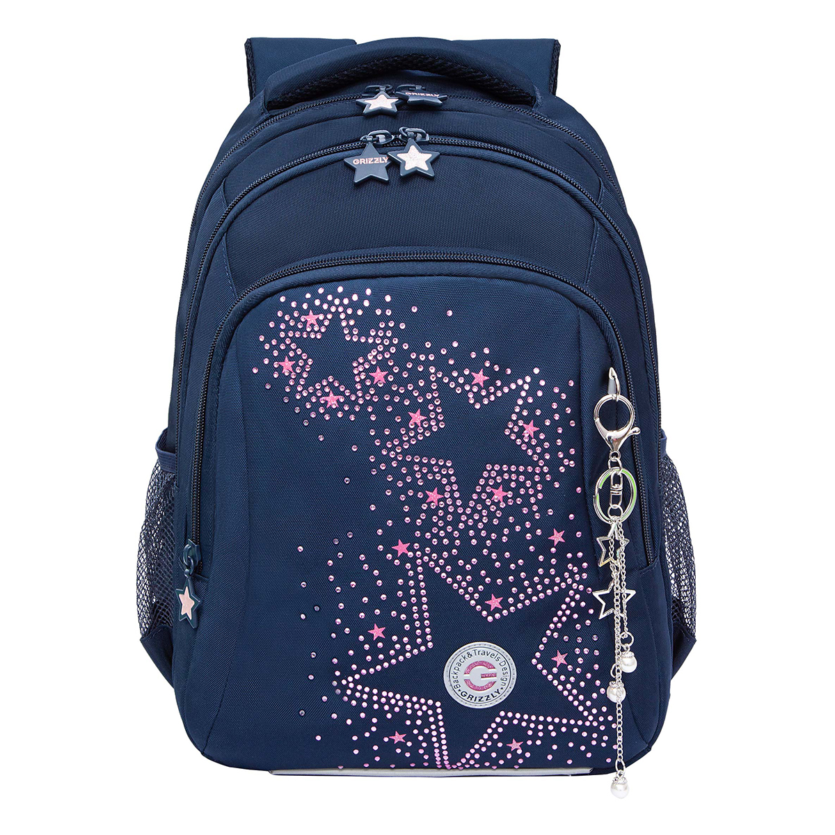 Школьный рюкзак GRIZZLY, три отделения, боковые карманы из сетки, внутренний карман для электронных устройств, внутренний составной пенал-органайзер, внутренний держатель для ключей - фастекс, жесткая анатомическая спинка, мягкая укрепленная ручка, нагрудная стяжка-фиксатор, петля для подвешивания, укрепленные лямки, помещается А4, светоотражающие элементы с четырех сторон