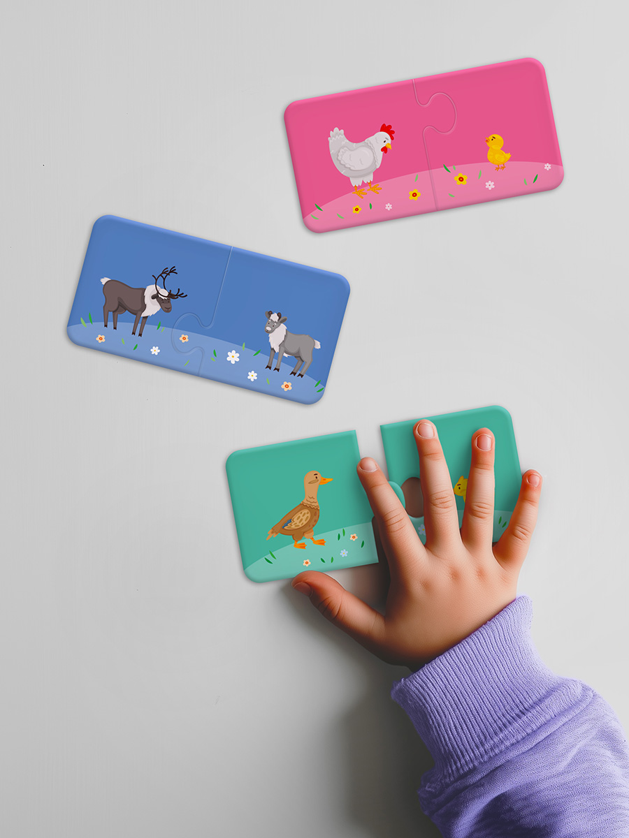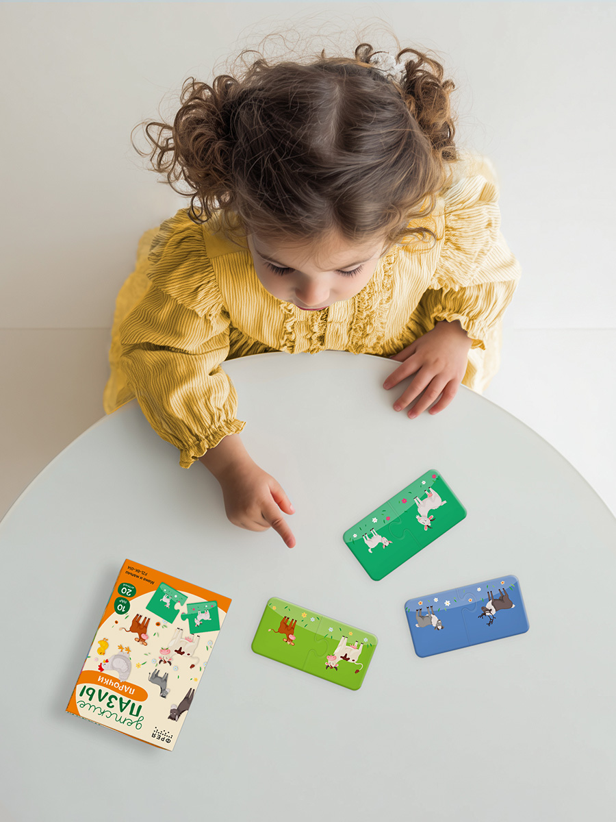 Наши беби-пазлы созданы специально для любознательных малышей: крупные детали удобно держать в ручке, а яркие изображения сразу привлекают внимание. Собирая пазлы, ребенок не просто играет — он развивает мелкую моторику, внимание, логику и речь. Парные пазлы, где нужно находить логические связи между двумя картинками, тренируют ассоциативное мышление и формируют навыки сопоставления. Набор содержит 10 пар пазлов, размером 13х6,5 см. Размер коробки: 12x17x4 см.