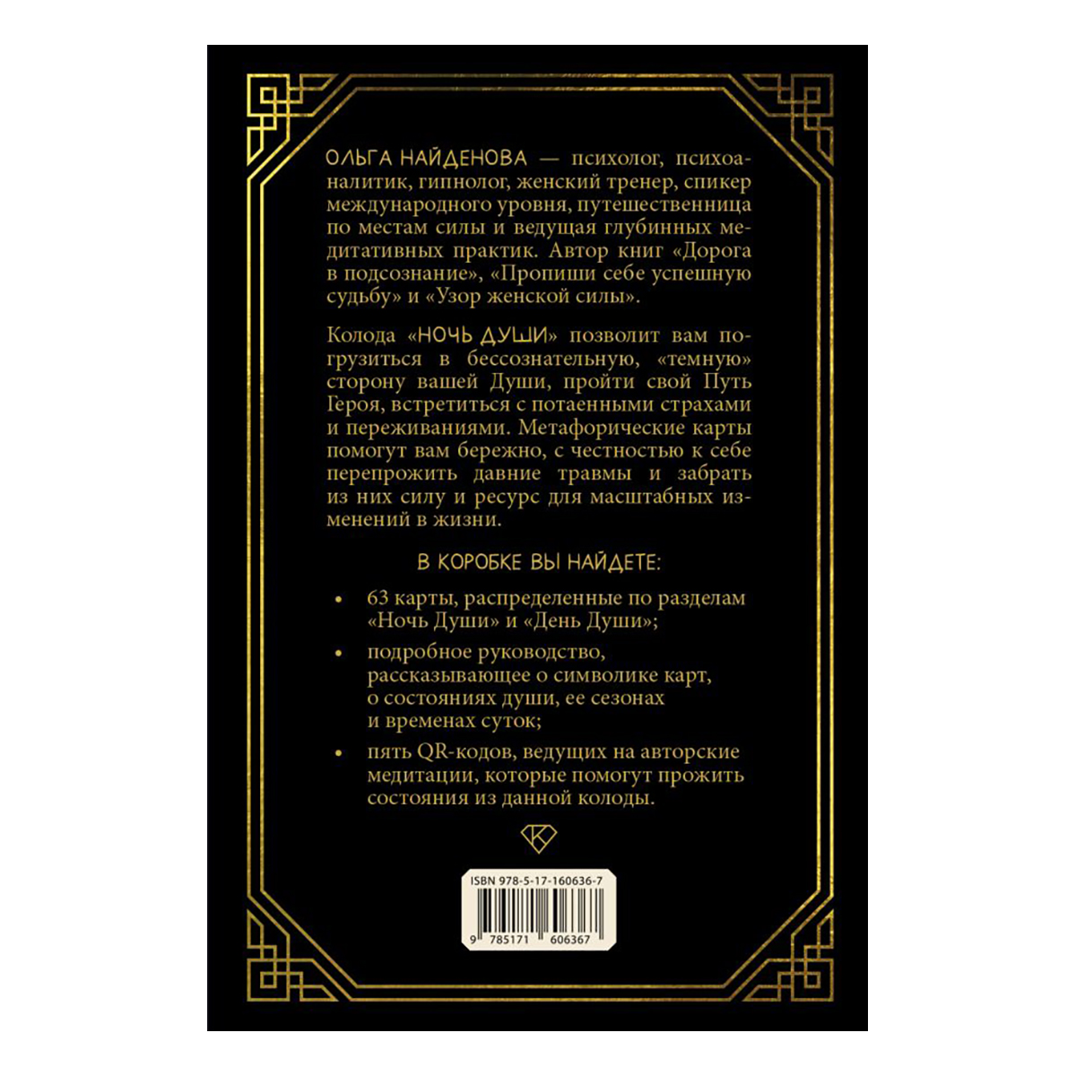Ольга Найдёнова — психолог, психоаналитик, гипнолог, женский тренер, спикер международного уровня, путешественница по местам силы и ведущая глубинных медитативных практик. Автор книг «Дорога в подсознание», «Пропиши себе успешную судьбу» и «Узор женской силы». Колода «Ночь Души» позволит вам погрузиться в бессознательную, «темную» сторону вашей Души, пройти свой Путь Героя, встретиться с потаенными страхами и переживаниями. Метафорические карты помогут вам бережно, с честностью к себе перепрожить давние травмы и забрать из них силу и ресурс для масштабных изменений в жизни. В коробке вы найдете: - 63 карты, распределенные по разделам «Ночь Души» и «День Души»; - подробное руководство, рассказывающее о символике карт, о состояниях души, ее сезонах и временах суток; - пять QR-кодов, ведущих на авторские медитации, которые помогут прожить состояния из данной колоды.