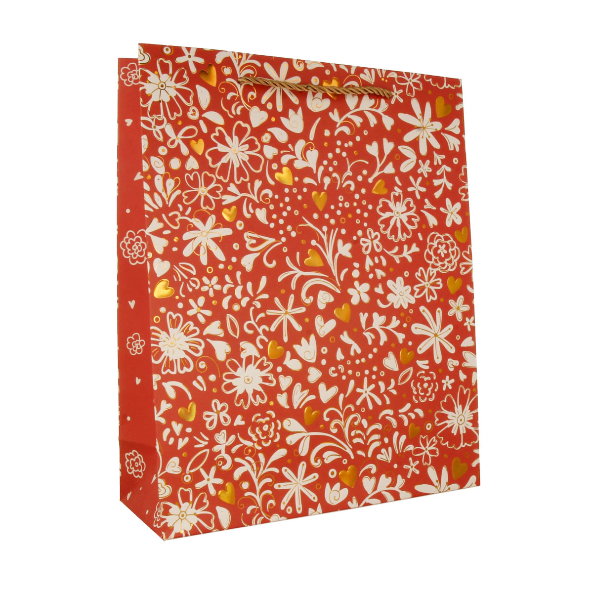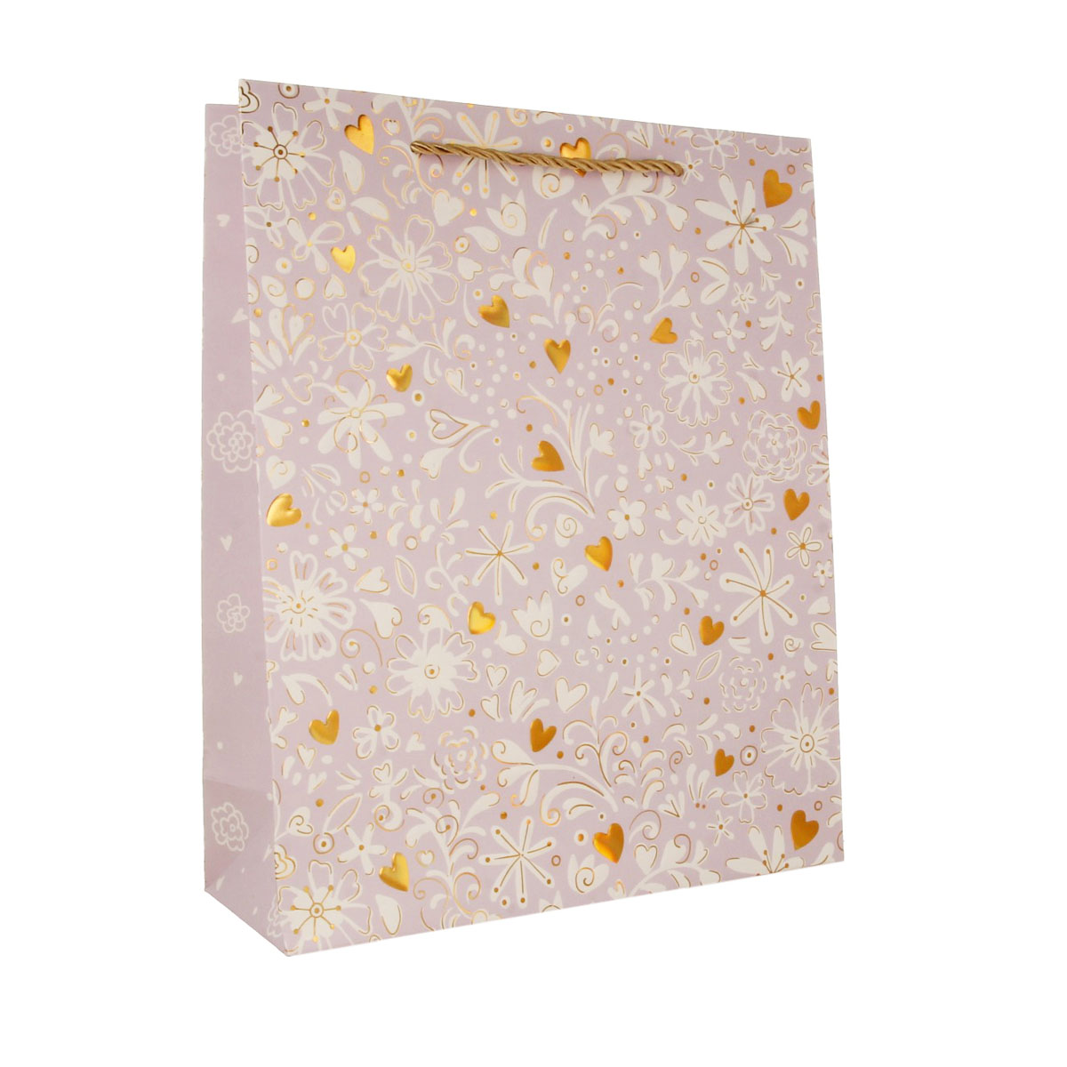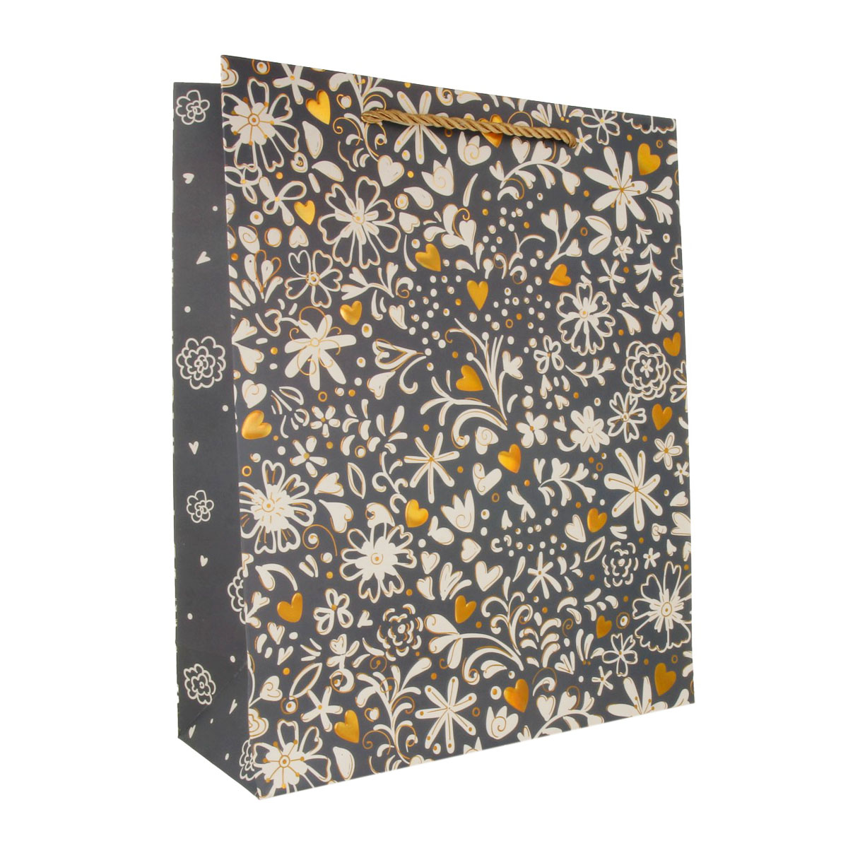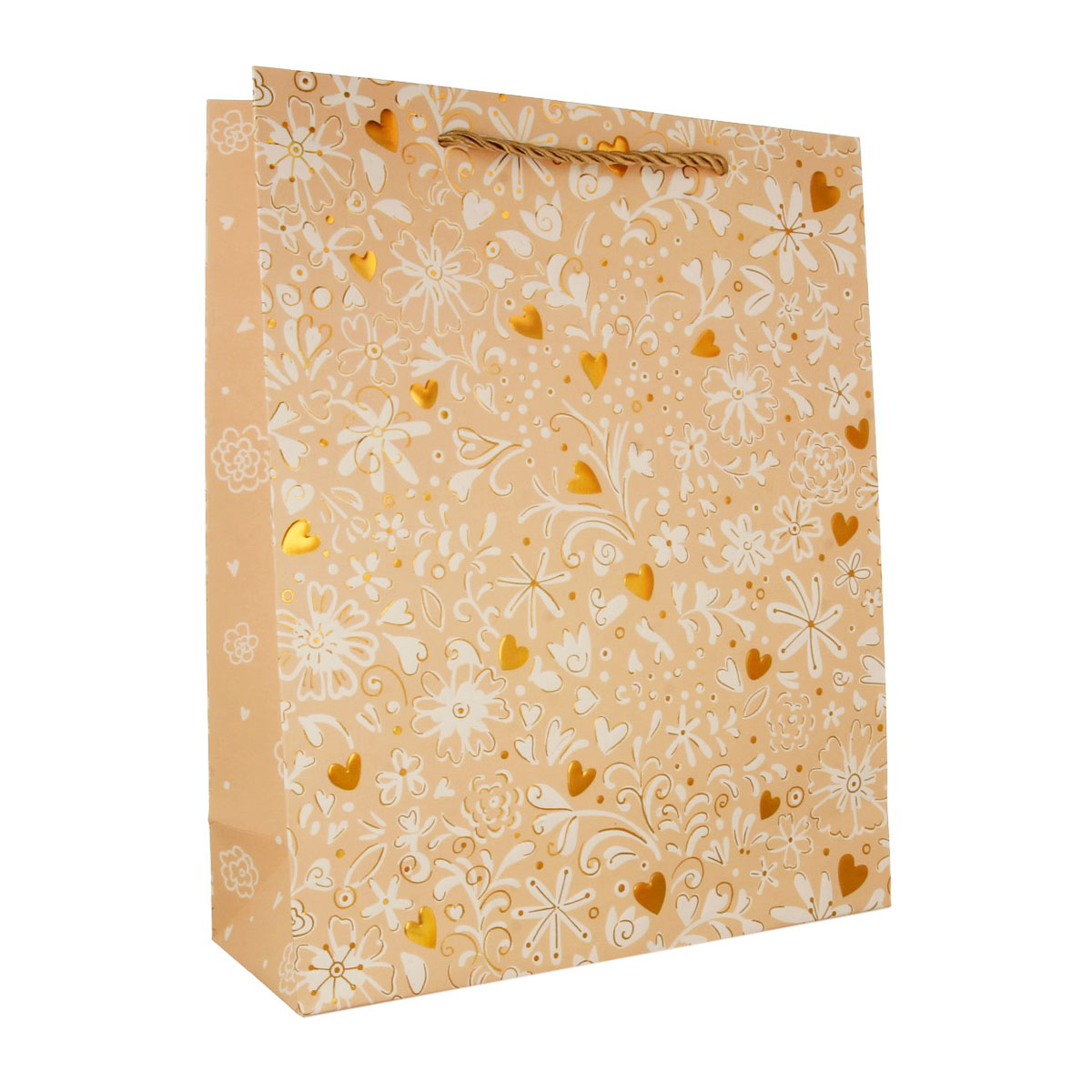 Пакет подарочный 26 х 32 х 12 см с рисунком "цветы и сердечки" с золотым тиснением L7163