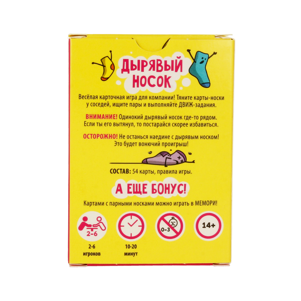 Веселая карточная игра для компании! Тяните карты-носки у соседей, ищите пары и выполняйте ДВИЖ-задания. ВНИМАНИЕ! Одинокий вонючий носок где-то рядом. Если ты его вытянул, то постарайся скорее избавиться. ОСТОРОЖНО! Не останься наедине с наедине с дырявым носком. Это будет вонючий проигрыш! Игра ПОДХОДИТ ДЛЯ ВСЕХ от детей до взрослых.