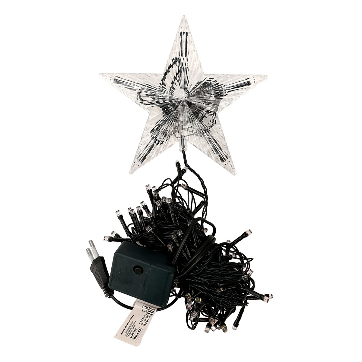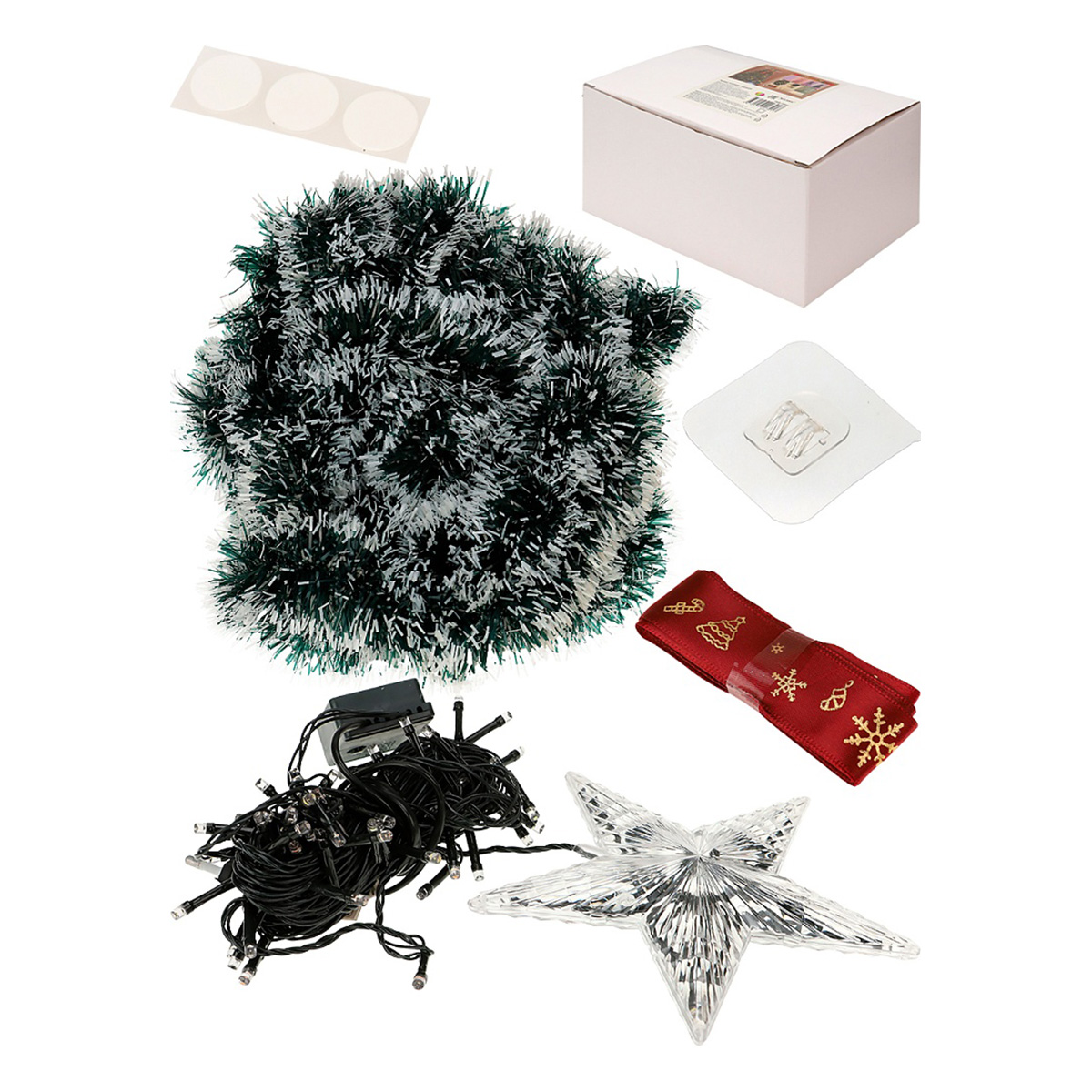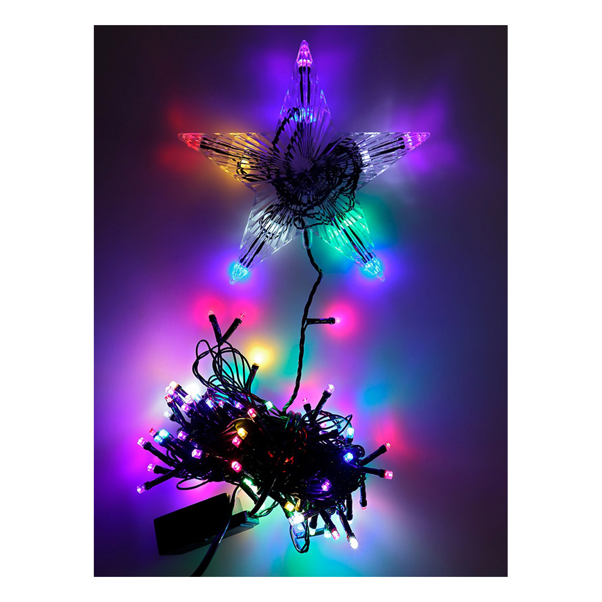 Гирлянда с верхушкой никого не оставит равнодушным! Она поможет создать теплую и уютную атмосферу в доме в новогоднее время года. Такая гирлянда отлично подходит для украшения елки, окно или стены. Также ее можно использовать в качестве ночника. Размер: 9 м. Количество ламп: 100 шт. Свет: мульти. Количество режимов: 8. Материал: металл, пластик, LED, нить шпагат. Особенности: 100 LED пятизвездочная зеленая линия длиной 9 м. с 8 функциями, 3 м. * 1 шт. веревки, 2 м. * 1 шт. шелковая лента, 3 шт. клеевых точек, 30 шт. крючков, мишура - 9 м. Упаковка: цветная коробка.
