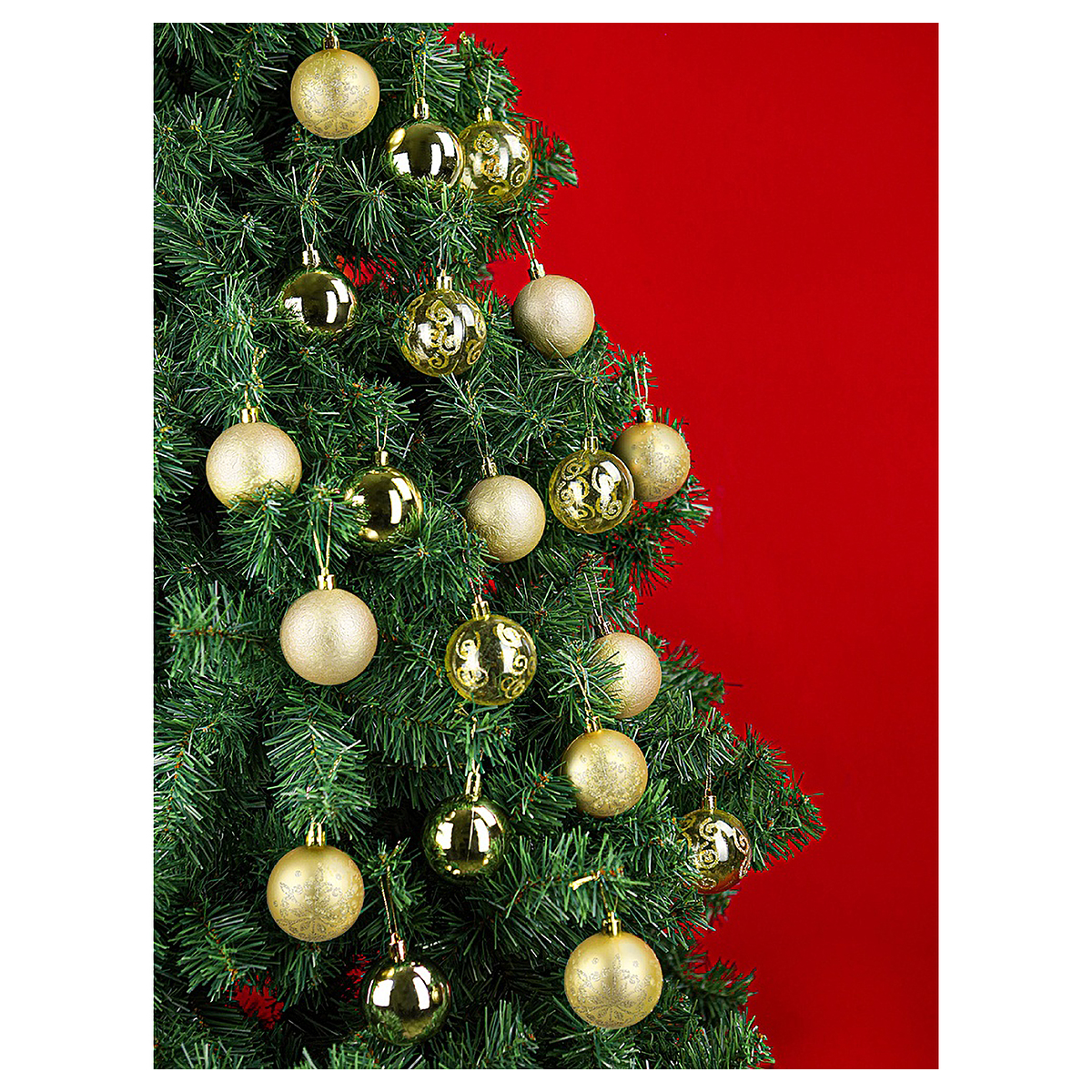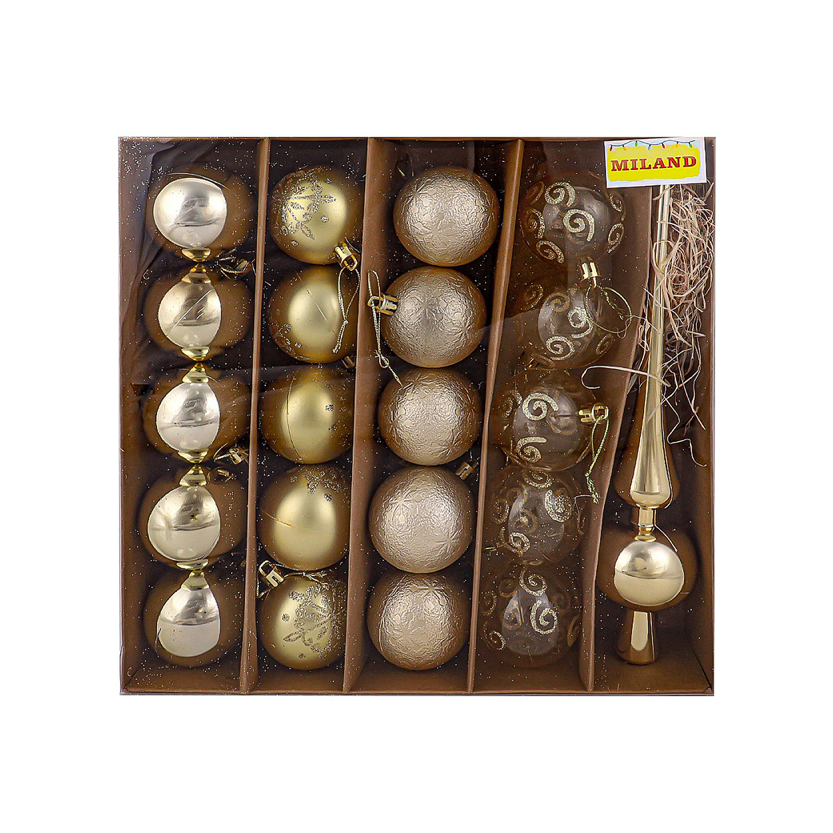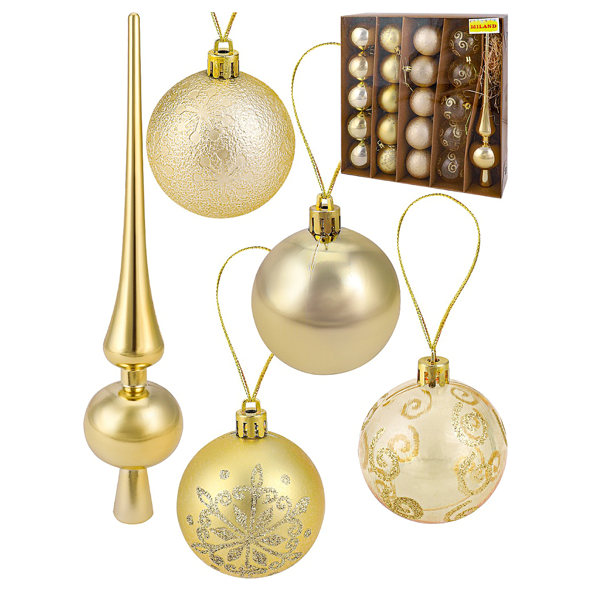 Ёлочные шары — незаменимый декор, который помогает создавать невероятно уютную атмосферу Нового Года! Они эффектно выделяются на фоне хвои, придавая оформлению праздничный вид. Игрушки выполнены из пластика, что невероятно практично. Если в вашем доме есть дети или питомцы, вам не придётся беспокоиться о сохранности подвесок! Размер шаров: 6 см. Цвет: золотой. В наборе: 20 шаров, 1 верхушка.