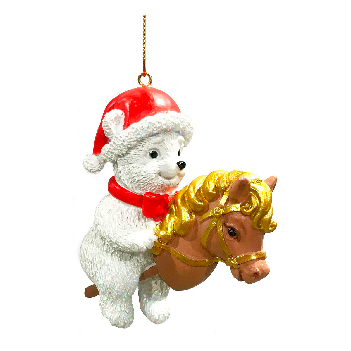 Эта елочная игрушка – настоящее произведение искусства! Милый медвежонок верхом на лошадке, украшенный новогодним колпачком и красным шарфом, выполнен с невероятной детализацией и станет центром внимания на вашей елке. Игрушка изготовлена из современного и технологичного материала - полирезины. Размер: 5 х 8,5 х 6 см.