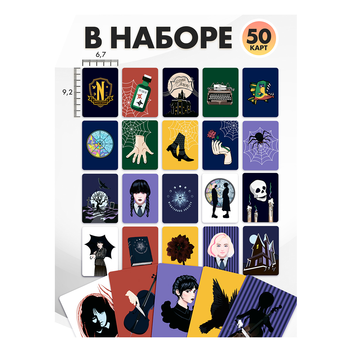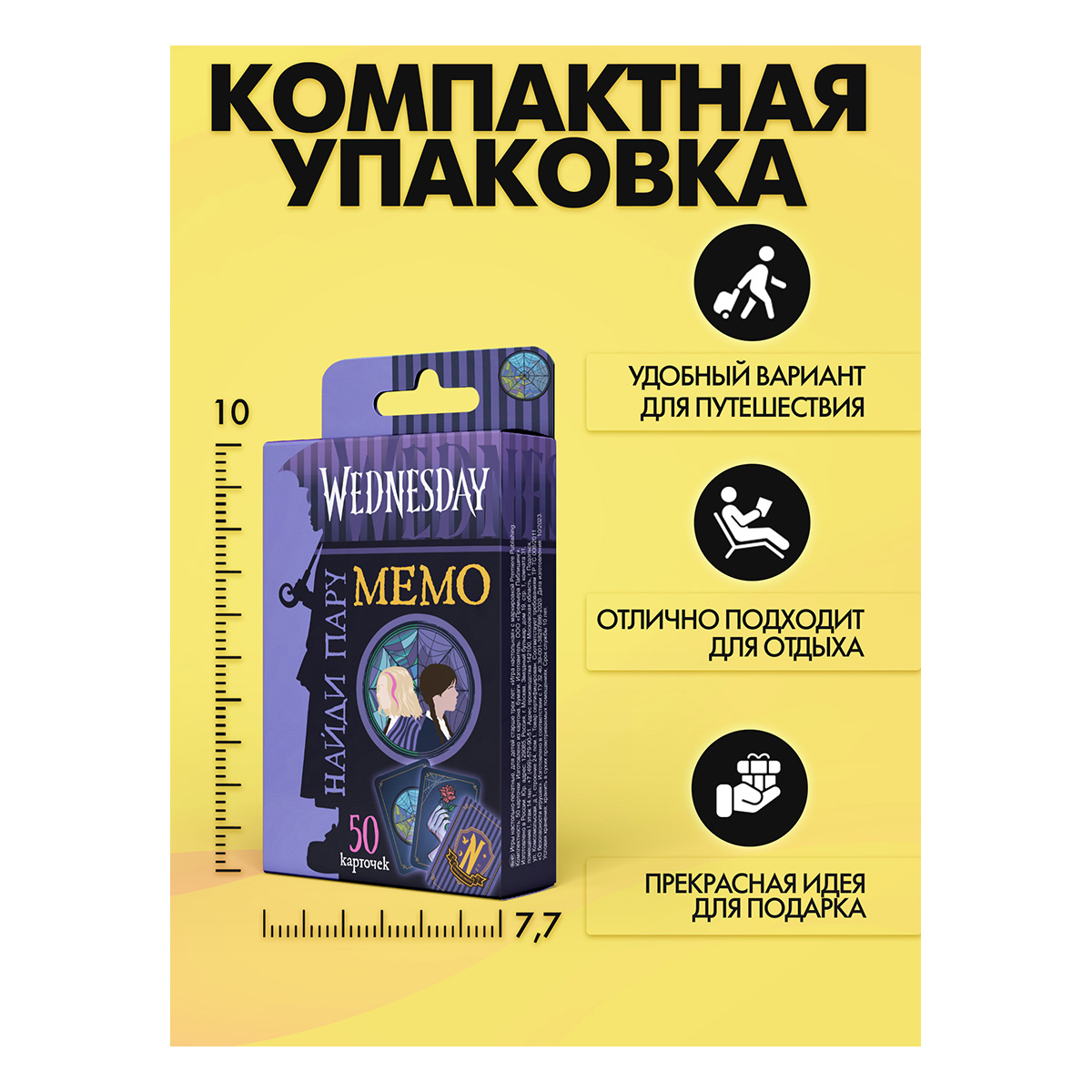 Серия компактных настольных игр «Мемо» – это настоящая находка как для детей, так и для родителей. Эта простая и занимательная игра развивает у ребенка: внимательность, память, мышление. Отличительная особенность данной игры - персонажи популярного сериала "Уэнсдей". Удобно брать в гости и в дорогу. Идеальный подарок любителям сериала "Уэнсдей"! Состав: 50 карт [6,7х9,2 см], в упаковке [7,5х10 см] с европодвесом