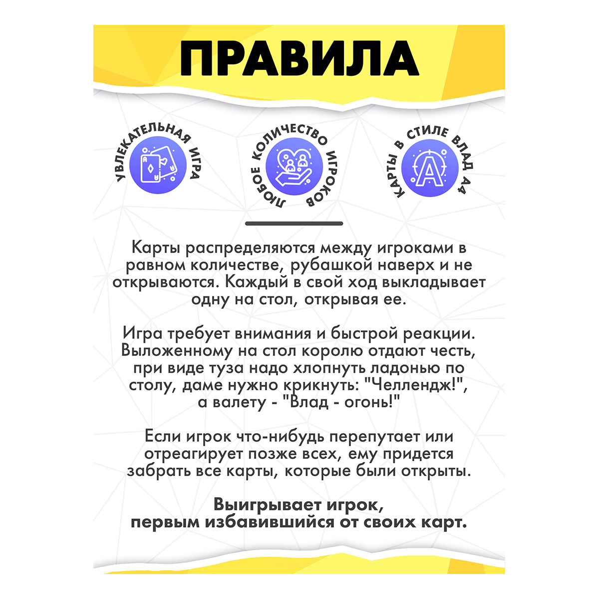 Серия компактных настольных игр от Влад А4 – это настоящая находка как для детей, так и для родителей. "Челлендж" - эта простая и занимательная игра развивает : реакцию и внимание. Отличительная особенность данной игры - узнаваемые образы мира Влада А4. Универсальная колода из 36 игральных карт, в оригинальных мастях бренда, позволяет играть во все известные игры в карты. Удобно брать в гости и в дорогу. Идеальный подарок фанатам Влад А4! Состав: 36 карт [6,7х9,2 см], инструкция, в упаковке [7,5х10 см] с европодвесом