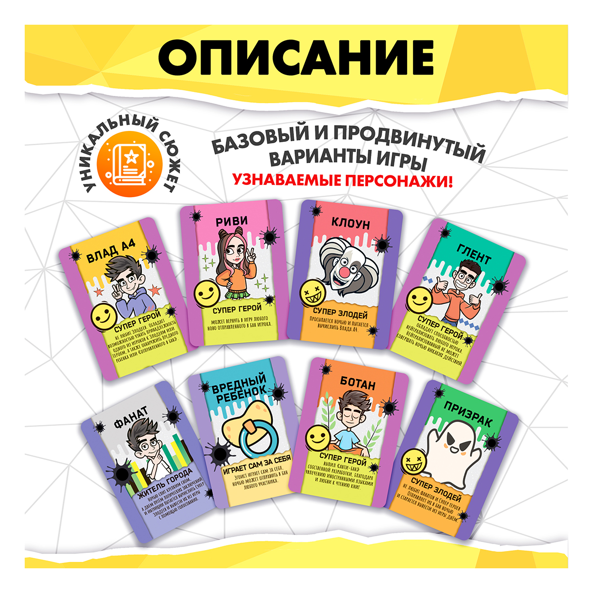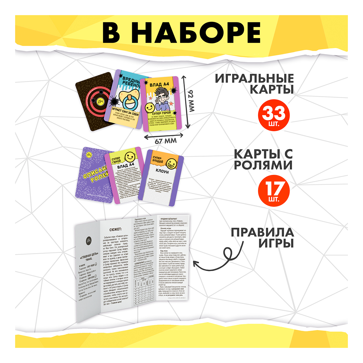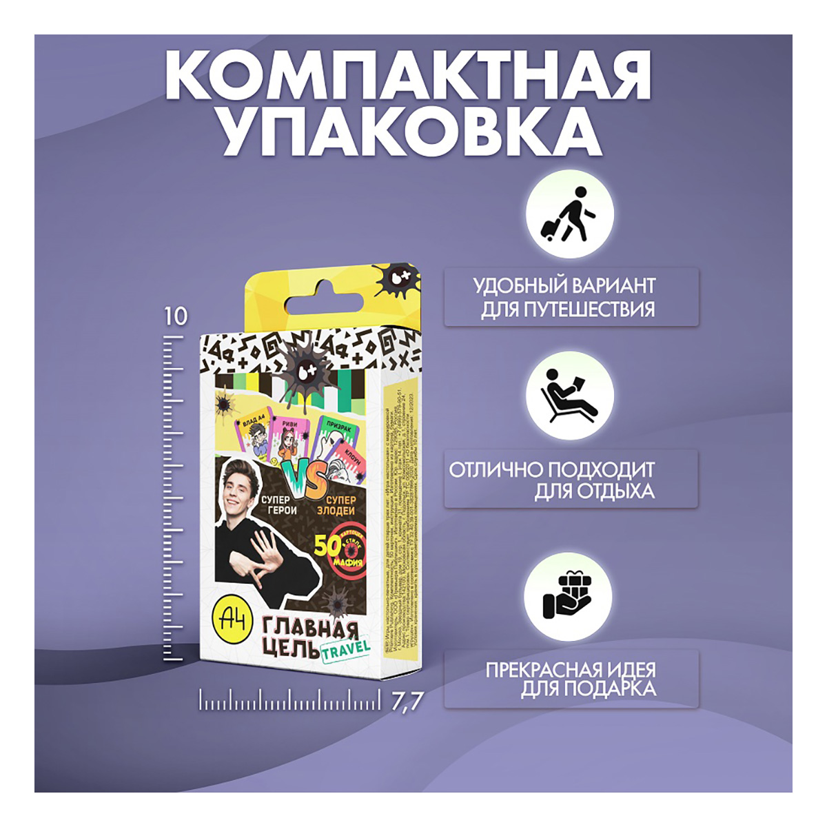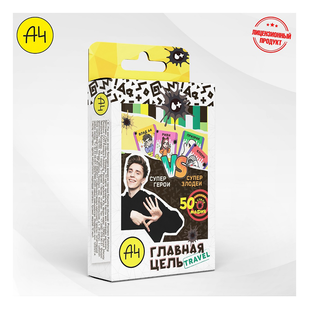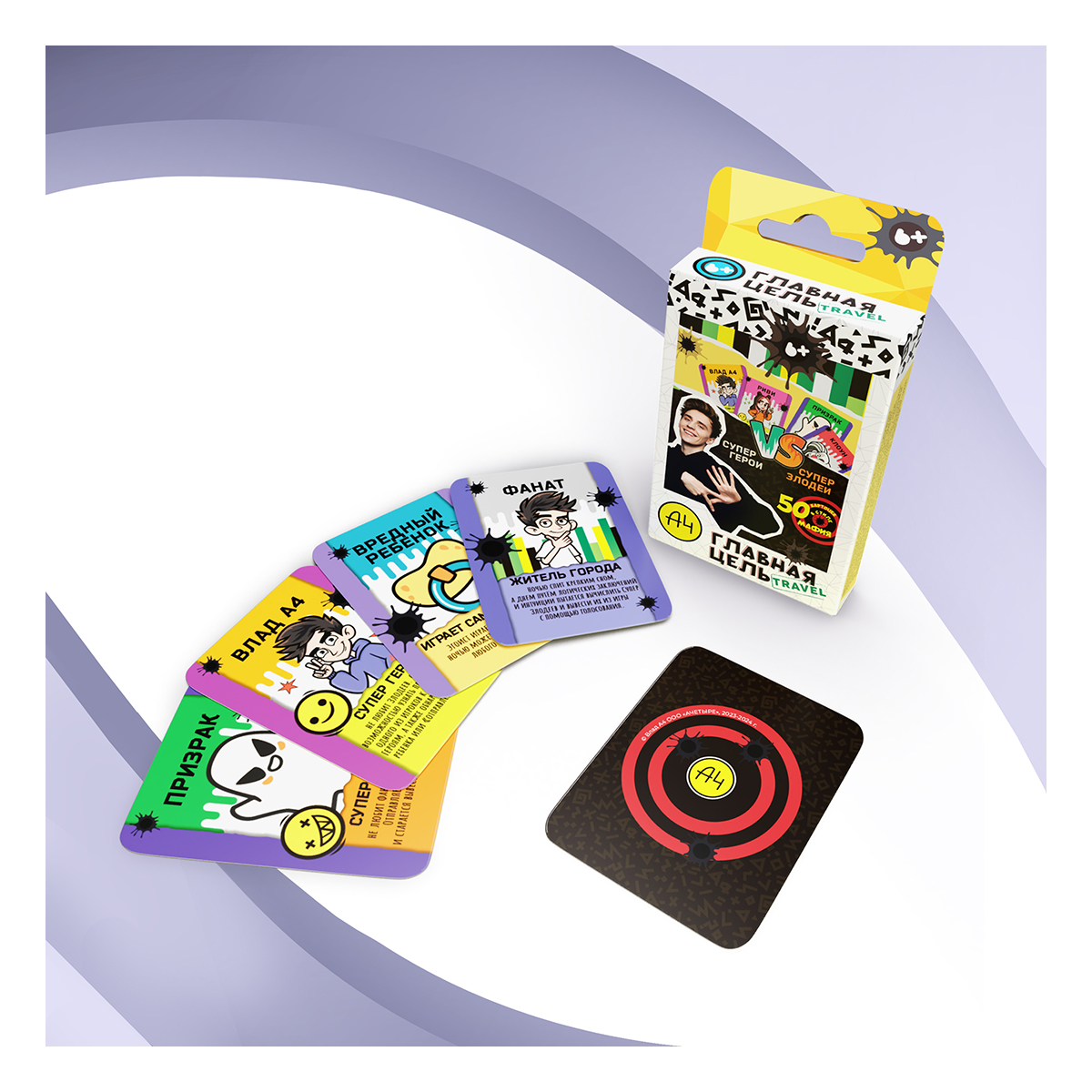 Серия компактных настольных игр Главная цель Трэвел от Влад А4 - уникальная разработка игры в стиле мафия. Подходит, как новичкам, так и знатокам игры. Узнаваемые персонажи, знакомые правила. Развивает внимательность, логическое мышление, умение убедительно говорить и внимательно слушать. раскрывает лидерские, дипломатические и аналитические качества, необходимые детям для реализации себя в коллективе. Набор карт имеет 2 варианта игры - для новичков и знатоков. Главная цель Трэвел. Идеальный подарок фанатам Влада А4 ! 50 карт [6,7х9,2 см], инструкция, в упаковке [7,5х10 см] с европодвесом