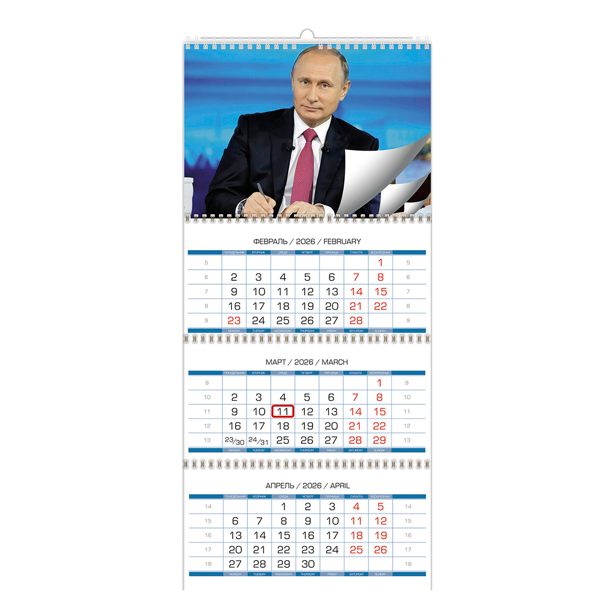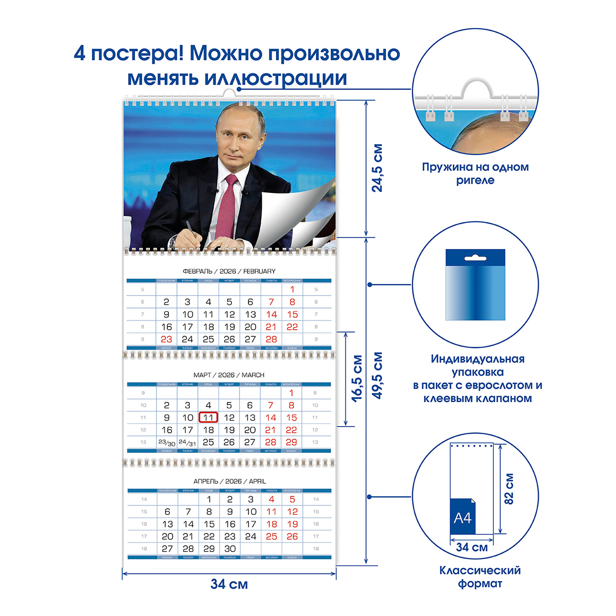 Календарь квартальный настенный 3-х блочный, 4 сменных постера 340 х 240 мм, мелованная бумага 130 гр/м2, 4+0, 3 календарных блока 340х160 мм, мелованная бумага 105 гр/м2, 4+0, 4 пружины, 1 ригель, курсор, подложка - картон одностороннего мелования 250 гр/м2, место для рекламы не предусмотрено, индивидуальная упаковка в пакет с еврослотом и клеевым клапаном. Уникальный квартальный вариант с 4 красочными портретами президента Российской Федерации. В официальной обстановке и на отдыхе Владимир Владимирович неизменно выглядит элегантно и подтянуто. Этот календарь – отличное решение для корпоративного подарка!