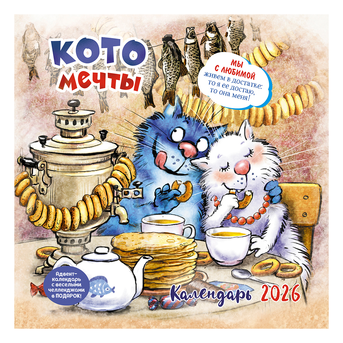 Календарь-органайзер настенный перекидной, 14 листов, мелованная бумага, блок 115 гр/м2, обложка 200 гр/м2, глянцевая ламинация, 4+4, крепление - скоба, индивидуальная упаковка в пакет с клеевым клапаном, с верхним еврослотом, вкладка из гофрокартона. Внутрь вложен адвент-календарь – отдельный лист со стирающимся слоем, под которым спрятаны задания для подготовки к Новому году на каждый день декабря, на задней обложке подарок-сюрприз: карманный календарь, который можно вырезать, размер в сложенном виде 290x290 мм, в развернутом виде 290х580 мм, возможно место для рекламы 290х70 мм. Яркий календарь-органайзер с иллюстрациями всенародно любимых синих котов известной художницы Рины Зенюк. Обаятельные котики с удовольствием – и юмором! – делятся своими мыслями и секретами чудесного настроения.