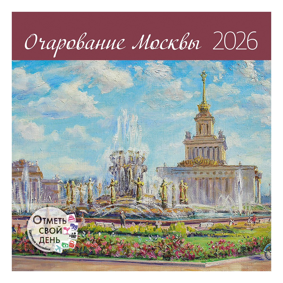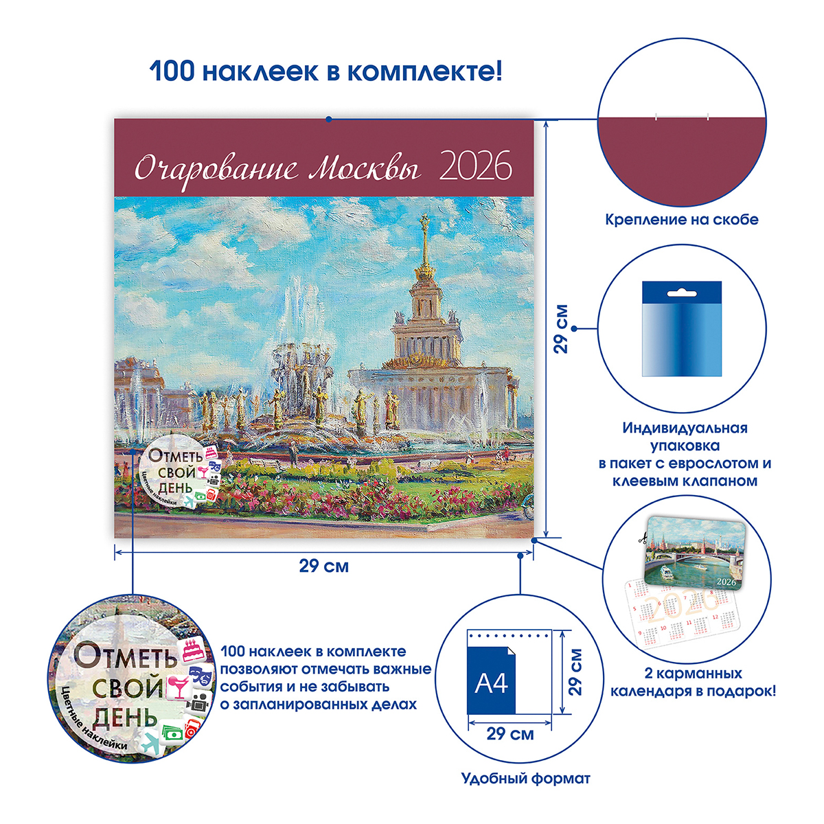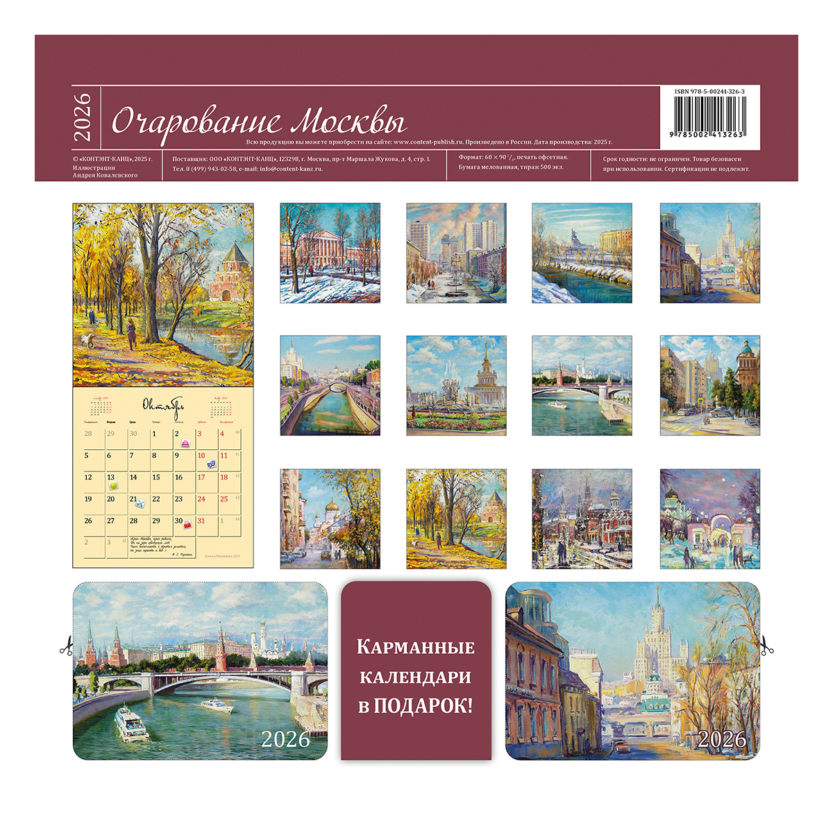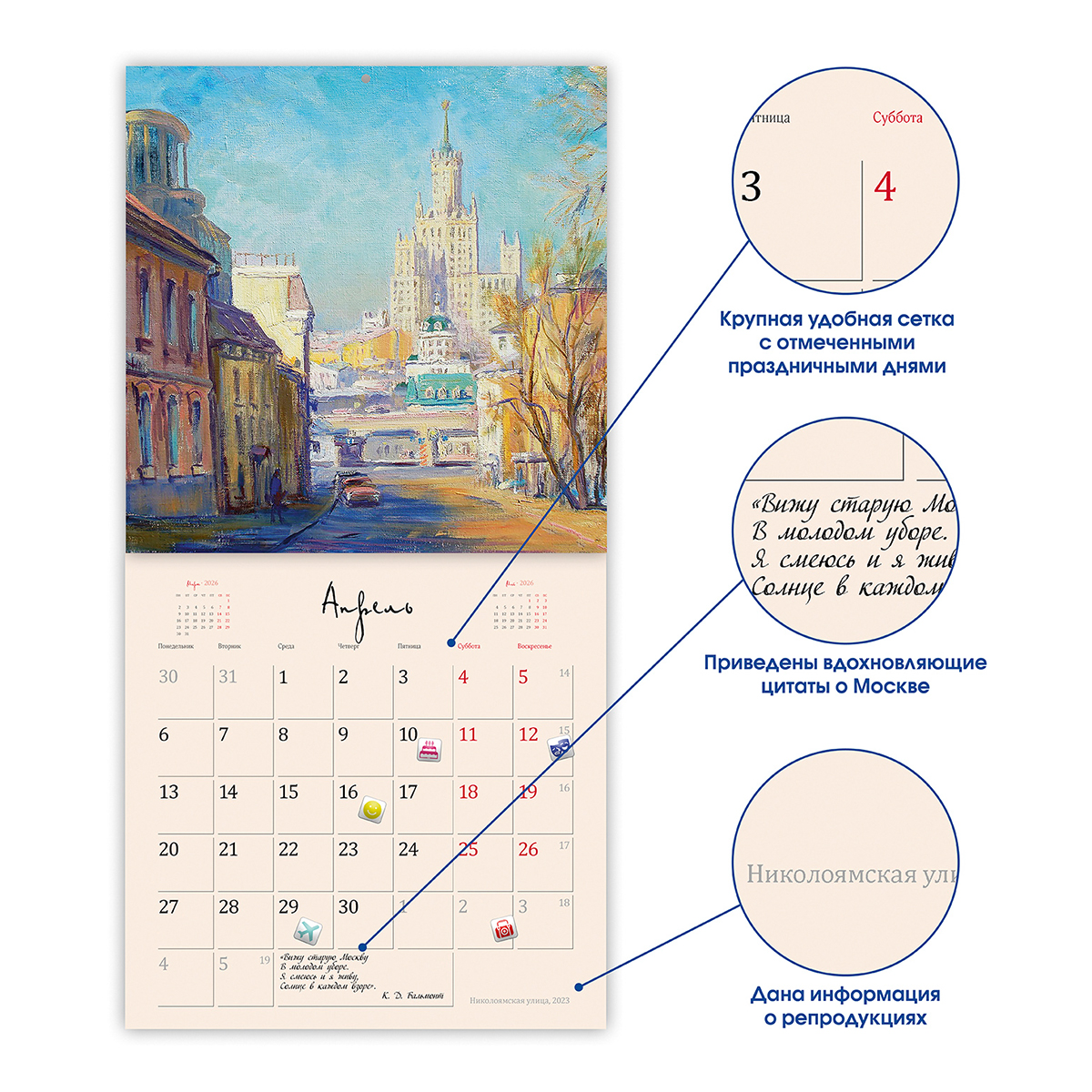 Календарь-органайзер настенный перекидной, 14 листов, мелованная бумага, блок 115 гр/м2, обложка 200 гр/м2, глянцевая ламинация, 4+4, крепление - скоба, индивидуальная упаковка в пакет с клеевым клапаном, с верхним еврослотом, вкладка из гофрокартона, внутрь вложен лист с наклейками 210*210 на все случаи жизни, на задней обложке подарок-сюрприз: два карманных календаря, которые можно вырезать, размер в сложенном виде 290x290 мм, в развернутом виде 290х580 мм, возможно место для рекламы 290х70 мм. Самые красивые места Москвы оживают на картинах Андрея Ковалевского. Это не просто календарь, а настоящее путешествие по улочкам и проспектам. В каждой детали бесконечная любовь к живописным уголкам столицы. Все картины сопровождаются цитатами великих писателей и поэтов, очарованных Москвой.