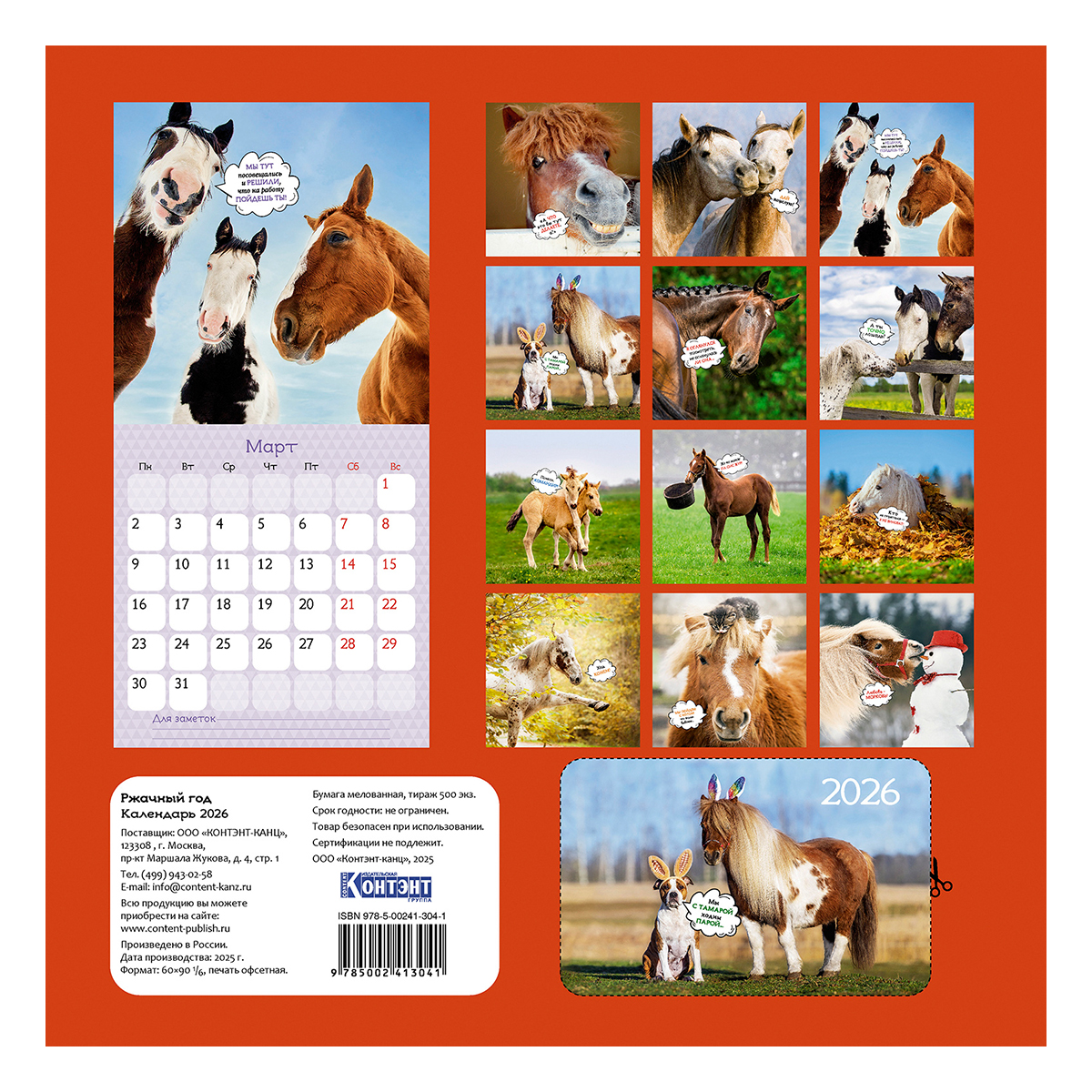 Календарь-органайзер настенный перекидной, 14 листов, мелованная бумага, блок 115 гр/м2, обложка 200 гр/м2, глянцевая ламинация, 4+4, крепление - скоба, индивидуальная упаковка в пакет с клеевым клапаном, с верхним еврослотом, вкладка из гофрокартона. Внутрь вложен адвент-календарь – отдельный лист со стирающимся слоем, под которым спрятаны задания для подготовки к Новому году на каждый день декабря, на задней обложке подарок-сюрприз: карманный календарь, который можно вырезать, размер в сложенном виде 290x290 мм, в развернутом виде 290х580 мм, возможно место для рекламы 290х70 мм. Наши лошадки уже радуются, что наступает их год! Веселый и беззаботный календарь со смешными фразами и фотографиями нелепых лошадей поднимет настроение на весь год. Заряжайтесь бодростью и позитивом вместе с коняшками.