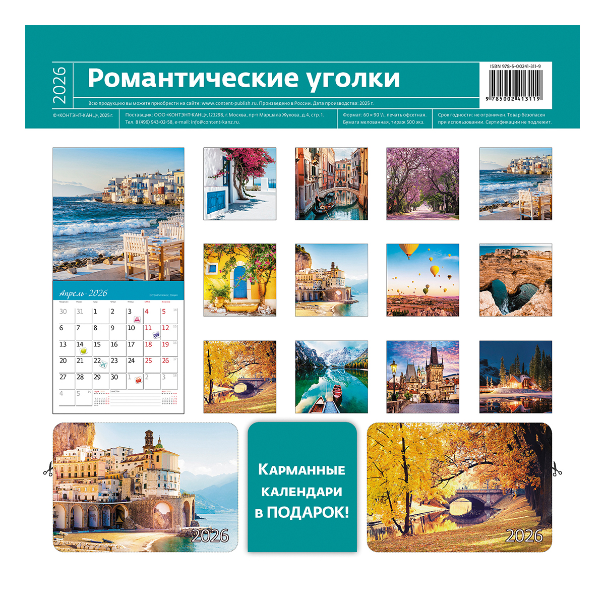 Календарь-органайзер настенный перекидной, 14 листов, мелованная бумага, блок 115 гр/м2, обложка 200 гр/м2, глянцевая ламинация, 4+4, крепление - скоба, индивидуальная упаковка в пакет с клеевым клапаном, с верхним еврослотом, вкладка из гофрокартона, внутрь вложен лист с наклейками 210*210 на все случаи жизни, на задней обложке подарок-сюрприз: два карманных календаря, которые можно вырезать, размер в сложенном виде 290x290 мм, в развернутом виде 290х580 мм, возможно место для рекламы 290х70 мм. Существуют места, будто созданные для влюбленных! Очаровательная подборка уютных фотопейзажей позволит романтику внутри вас предаться мечтам в скрытом от посторонних глаз дворике, пройтись по увитым диким виноградом улочкам или отдохнуть на кованой скамейке под ласковыми лучами солнца.