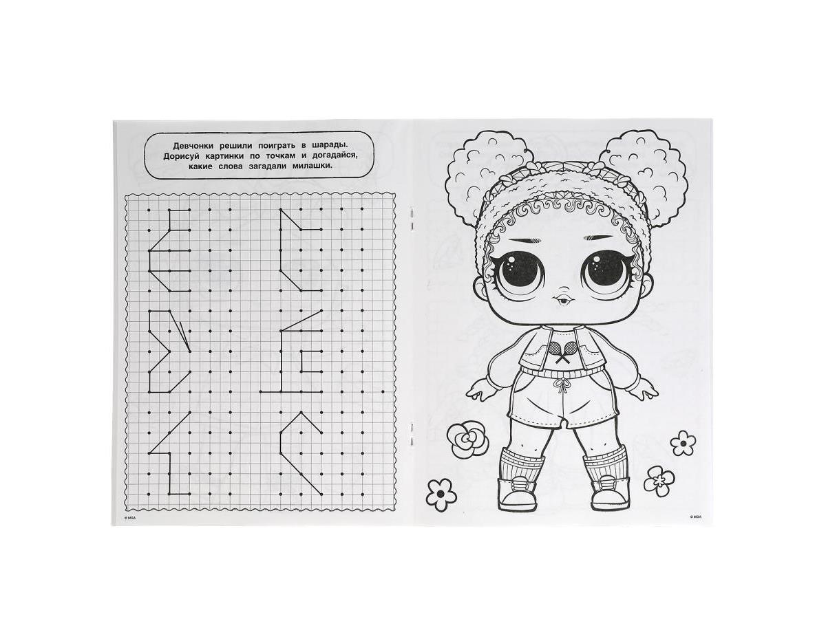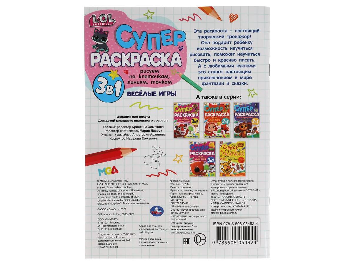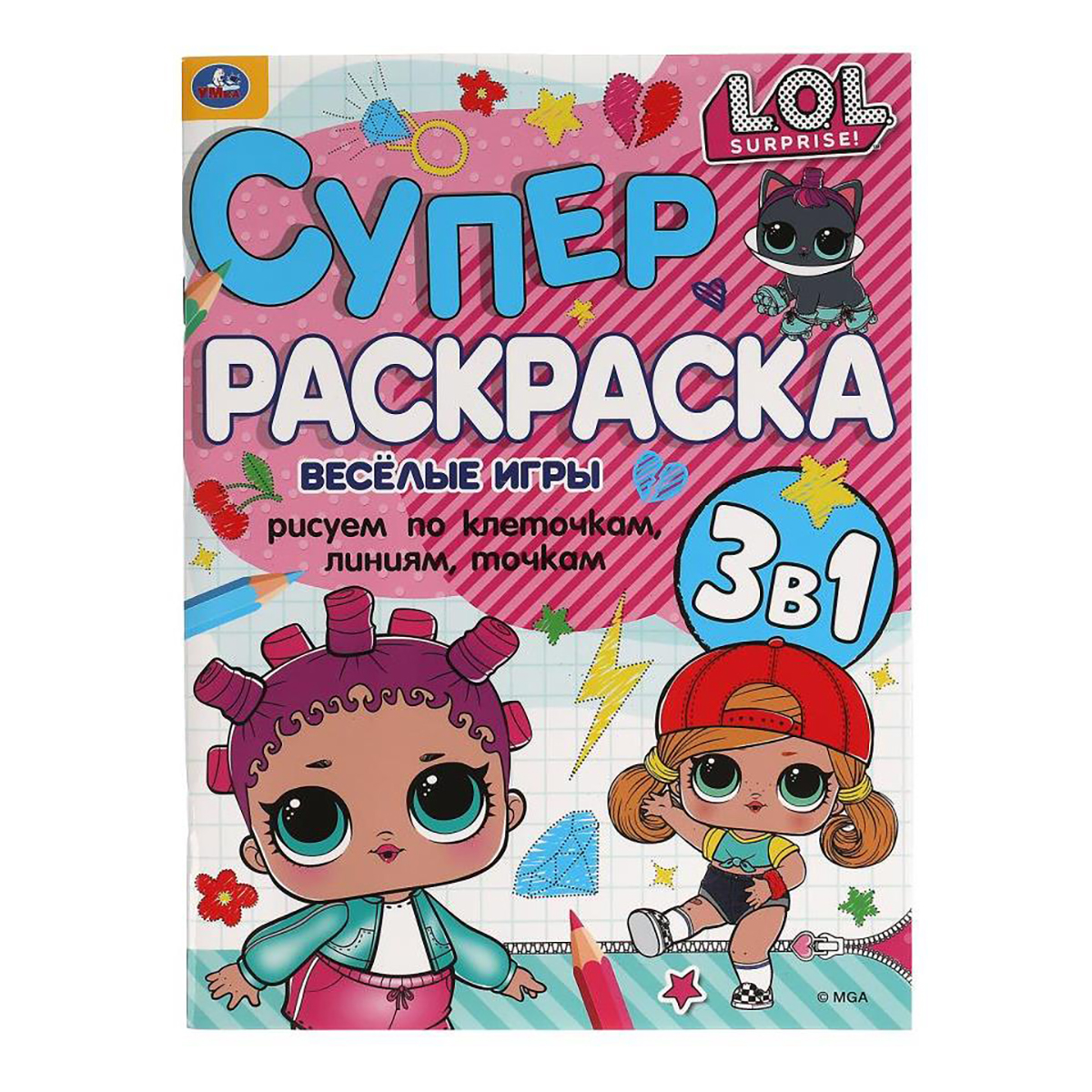 Супер-раскраска 3 в 1 «ЛОЛ. Весёлые игры» ТМ «УМка» станет отличным подарком для маленьких поклонников модных куколок: - картинки для раскрашивания с чётким контуром - занимательные задания: рисуем по клеточкам, линиям, точкам - любимые персонажи
