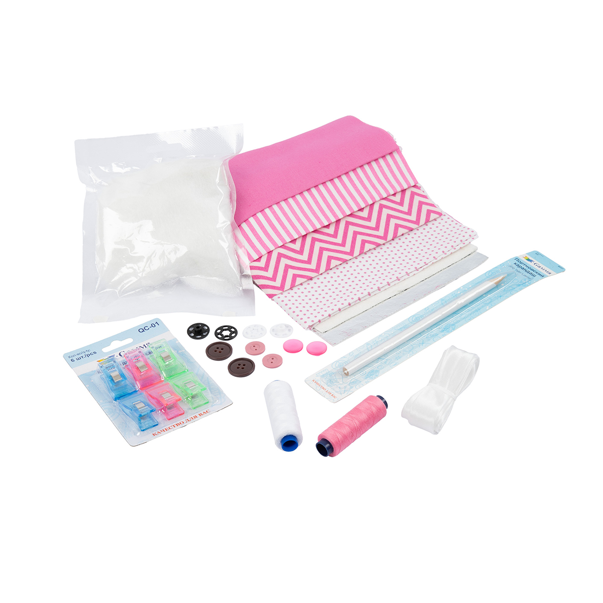 В набор входит: - ткань /100% хлопок/ размер 36х36 см - 4 шт - комплект пуговиц, пришивных кнопок: пуговицы на 4 отверстия - 2 шт. пуговицы на 2 отверстия - 2 шт. пуговицы на ножке - 2 шт. кнопки пришивные - 2 пары - нитки швейные /100% полиэстер/ 183 м - 2 шт. - папка-конверт на zip-молнии - 1 шт. - наполнитель для прихваток [70% вата льняная, 30% волокно вискозное] с металлизированной пленкой 16 х 16 см - 2 шт - клипсы для фиксации [пластик] - 6 шт. - карандаш портновский - 1 шт. -синтепух [100% полиэфир] 15 гр - 1 шт. -косая бейка [100% полиэстер] 1,5 м - 1 шт