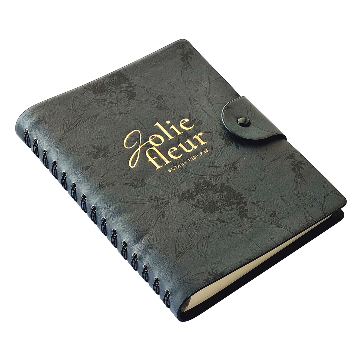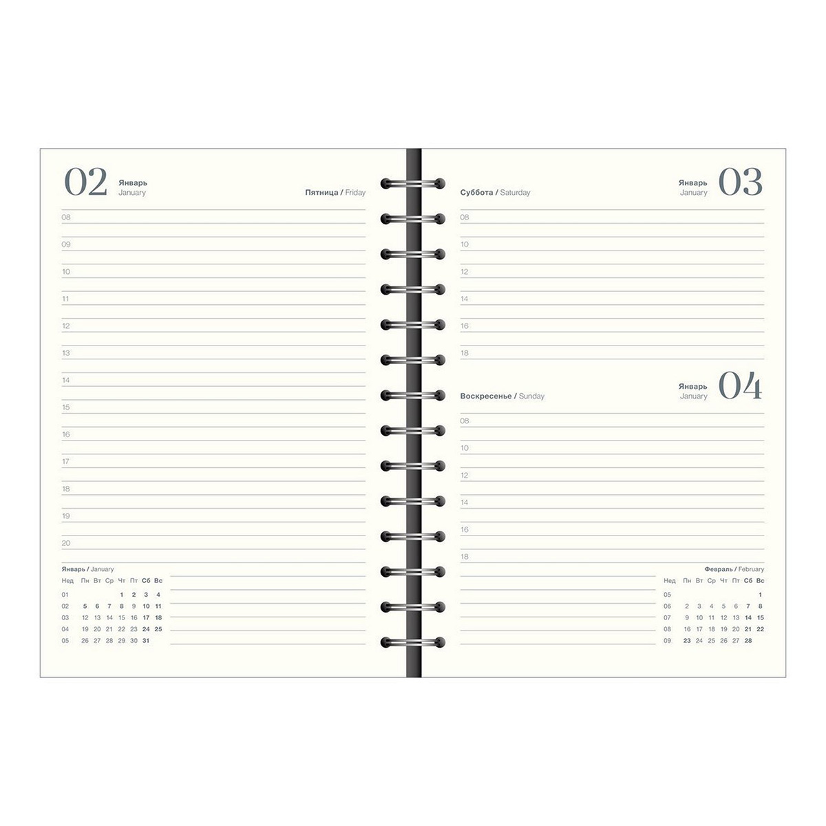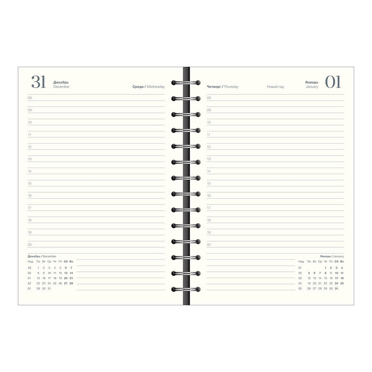 Обложка - мягкая, полускрытая спираль, гладкая искусственная кожа с печатью по материалу, скругленные уголки, цвет - черный. Блок - датированный, 320 стр., бумага: слоновая кость, прямые уголки, 70 г/м2, печать 1+1. Особенности: тиснение золотой фольгой, клапан на кнопке.