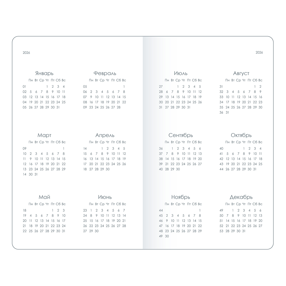 Обложка: картон 230 г/м2, печать 4+4, ламинация, микротекстурирование. Скрепка. Внутренний блок: датированный еженедельник, неделя на одной странице, бумага 65 г/м2, печать 1+1.