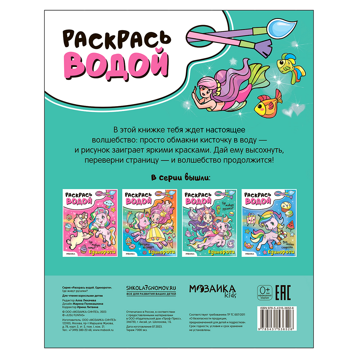 Где живут русалки? {Раскрась водой. Единороги}, водная раскраска Вместе с героями книжки «Где живут русалки?» серии «Раскрась водой. Единороги» ребенок отправится в увлекательное путешествие в подводный мир. С русалками и единорогами точно не заскучаешь! А стоит лишь обмакнуть кисточку в воду и провести по рисунку, как сказочный мир заиграет новыми красками. Водные раскраски отлично подходят для развития творческого мышления.