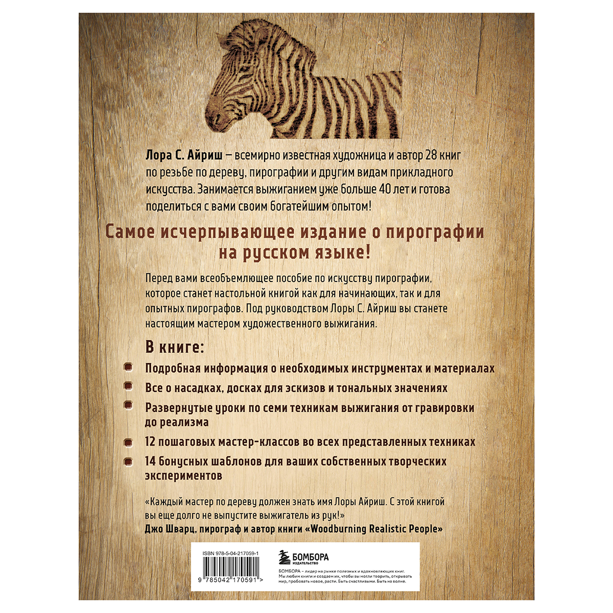 Самое исчерпывающее издание о пирографии на русском языке! В книге собраны ценнейшие советы о подборе необходимых инструментов и материалов, подробная информация о насадках и температурных режимах, развернутые уроки по семи техникам выжигания, 12 пошаговых мастер-классов во всех представленных техниках, а также бонусные шаблоны для ваших собственных творческих экспериментов!