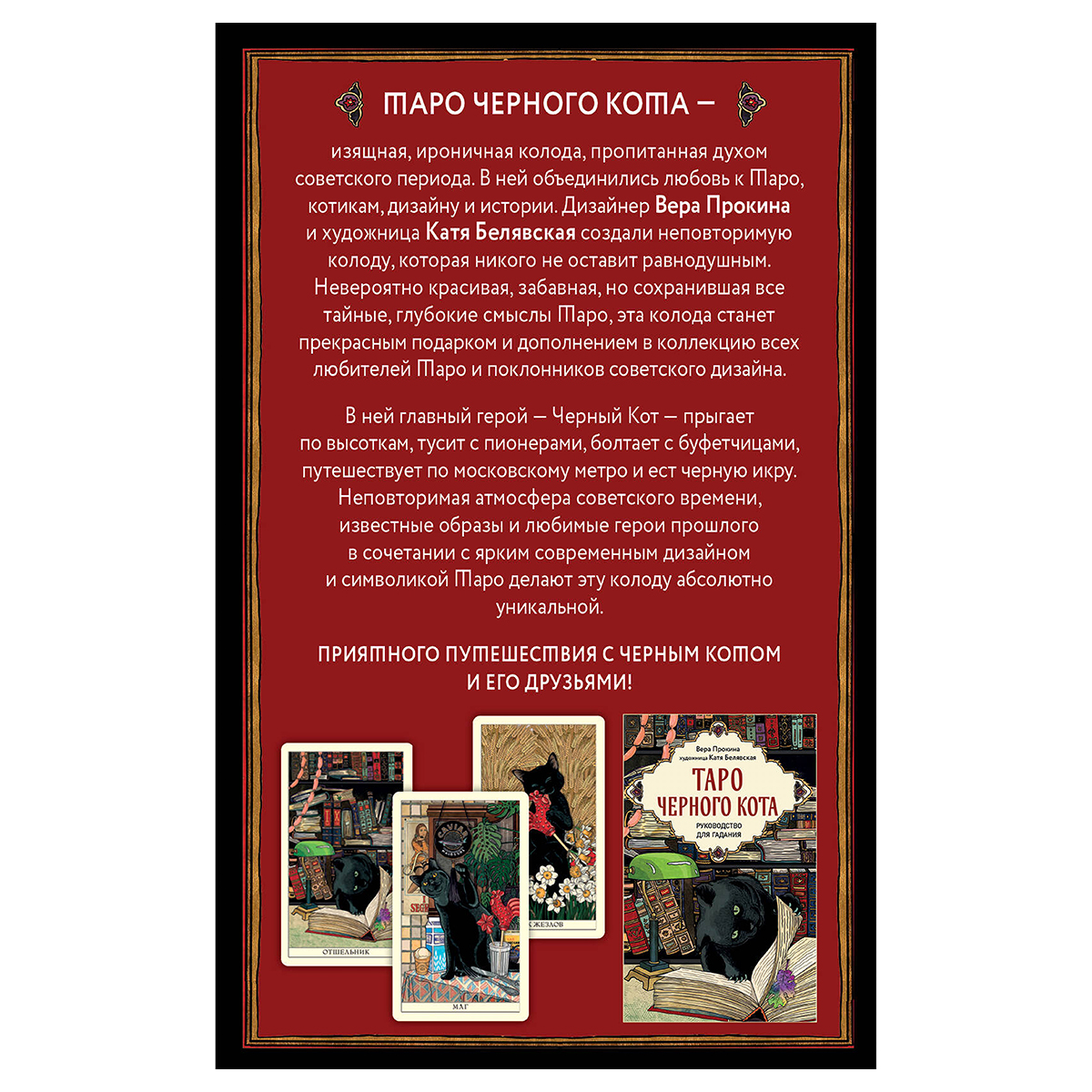 Очень стильная, яркая, ироничная колода, вдохновленная советским дизайном. В ней сочетается любовь к котикам, дизайну, истории и таро. Художница Екатерина Белявская и дизайнер Вера Прокина создали неповторимую коллекционную колоду таро для тонких ценителей дизайнерских вещей. Главный герой колоды- легендарный Черный кот, который тусит с пионерами, болтает с буфетчицами, ест черную икру и путешествует по московскому метро. Неповторимая атмосфера, ирония, великолепные иллюстрации в сочетании с символикой Таро Уэйта делает эту колоду абсолютно уникальной.