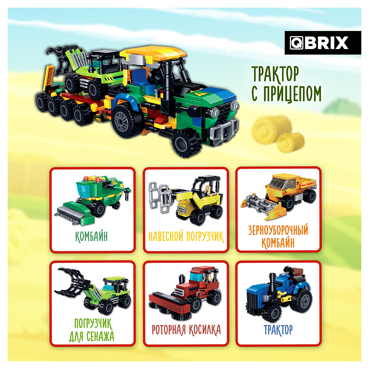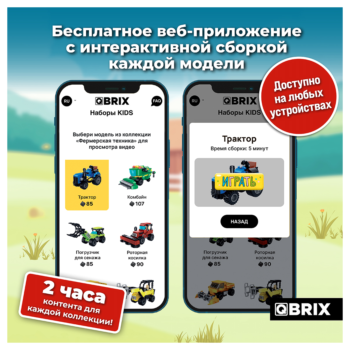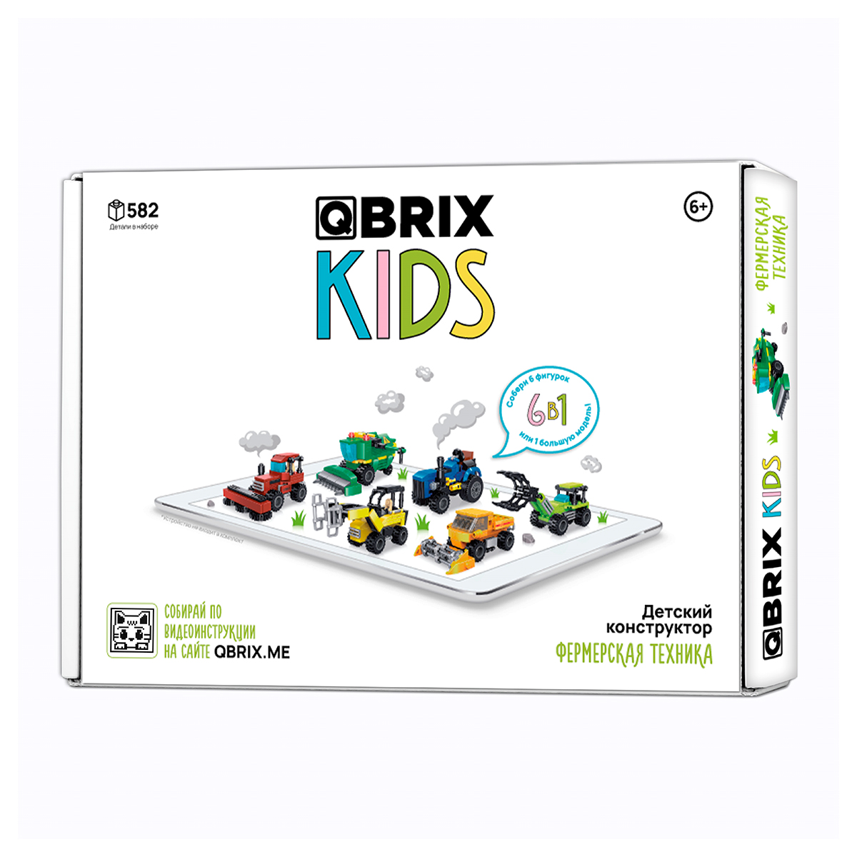 QBRIX KIDS — серия ярких детских конструкторов о мире животных, роботах, машинках и не только. В каждом наборе ребёнка ждут прикольные фигурки, которые он может собрать с помощью понятной видеоинструкции с интересными фактами о каждой из них. Видеоинструкции можно смотреть с любого устройства: телефона, планшета или компьютера. Также в каждый набор вложены бумажные инструкции с понятными схемами сборки. В наборе «Фермерская техника» ребёнка ждут: трактор, погрузчик для сенажа, комбайн, роторная косилка, зерноуборочный комбайн, навесной погрузчик, либо один большой трактор с прицепом. Ребёнок может собрать либо 6 маленьких фигурок, либо 1 большую модель. Благодаря удобной компактной упаковке, набор можно взять в дорогу и играть вместе с ребёнком. Конструктор изготовлен из качественного пластика, поэтому совершенно безопасен для детей. Играйте в удовольствие и собирайте всю коллекцию всей семьёй!