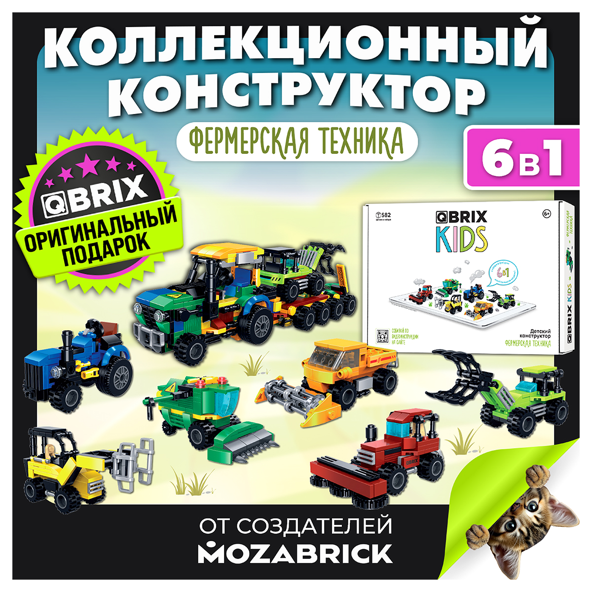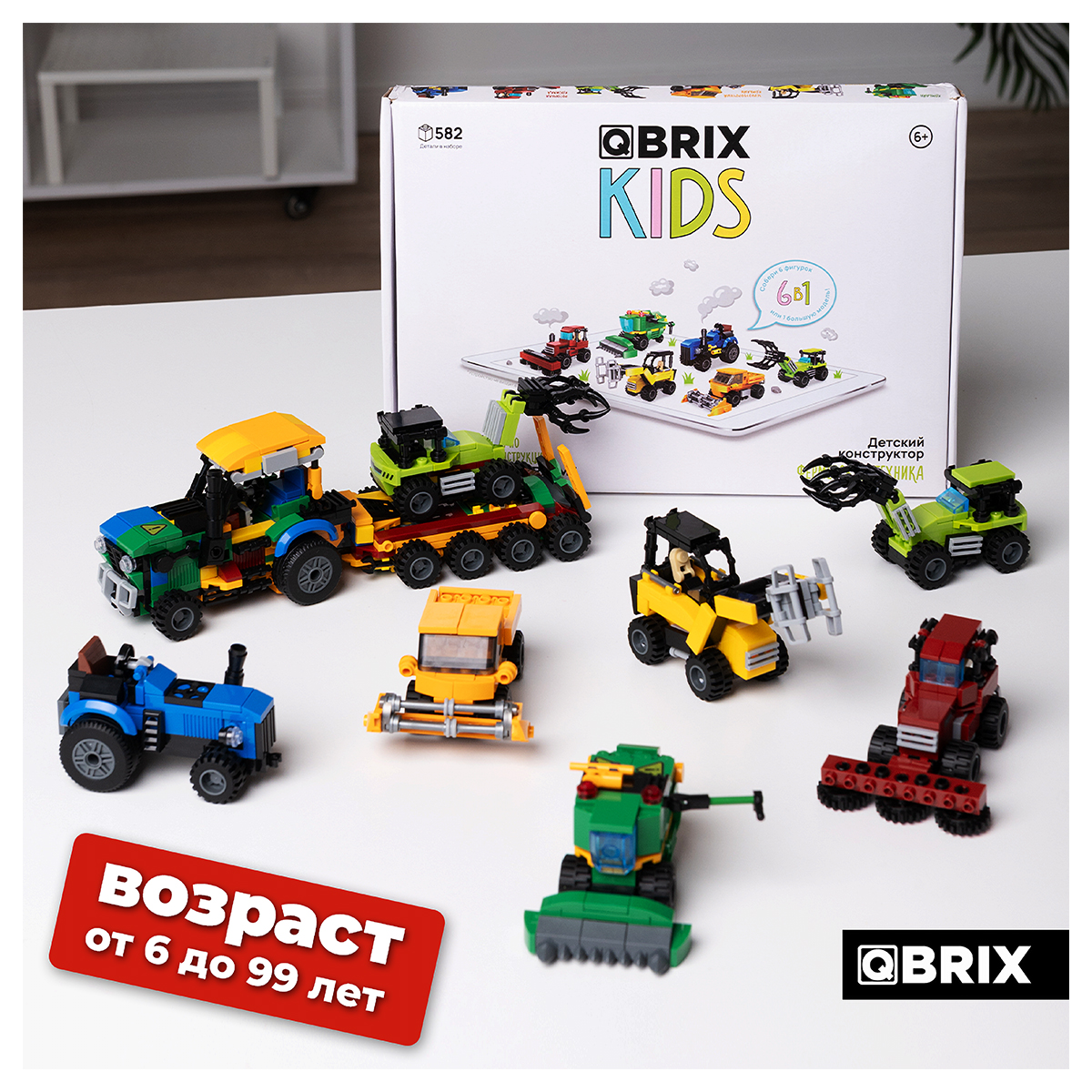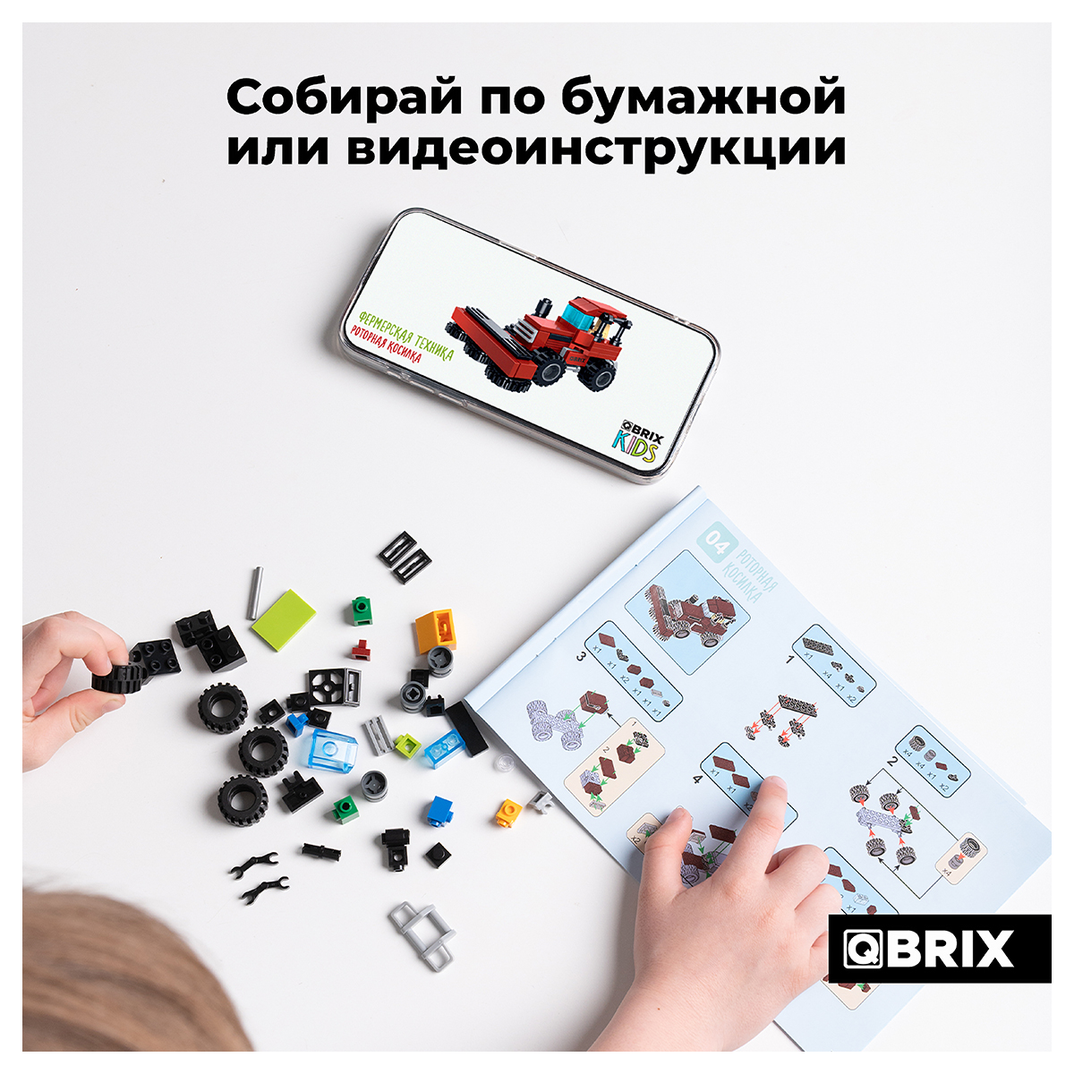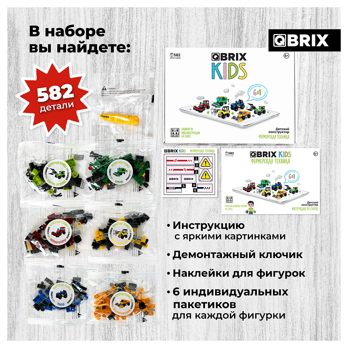 QBRIX KIDS — серия ярких детских конструкторов о мире животных, роботах, машинках и не только. В каждом наборе ребёнка ждут прикольные фигурки, которые он может собрать с помощью понятной видеоинструкции с интересными фактами о каждой из них. Видеоинструкции можно смотреть с любого устройства: телефона, планшета или компьютера. Также в каждый набор вложены бумажные инструкции с понятными схемами сборки. В наборе «Фермерская техника» ребёнка ждут: трактор, погрузчик для сенажа, комбайн, роторная косилка, зерноуборочный комбайн, навесной погрузчик, либо один большой трактор с прицепом. Ребёнок может собрать либо 6 маленьких фигурок, либо 1 большую модель. Благодаря удобной компактной упаковке, набор можно взять в дорогу и играть вместе с ребёнком. Конструктор изготовлен из качественного пластика, поэтому совершенно безопасен для детей. Играйте в удовольствие и собирайте всю коллекцию всей семьёй!