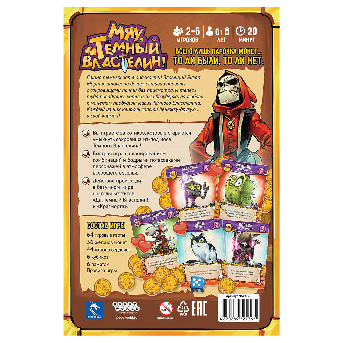 Башня тёмных чар в опасности! Зловещий Ригор Мортис отбыл по делам, оставив подвалы с сокровищами почти без присмотра. И теперь туда повадились котики, чью безудержную любовь к монетам пробудила магия Тёмного Властелина. Каждый из них непрочь спасти денежку-другую... в свой карман! Вы играете за котиков, которые стараются умыкнуть сокровища из-под носа Тёмного Властелина! Быстрая игра с планированием комбинаций и бодрыми потасовками персонажей в атмосфере всеобщего веселья.