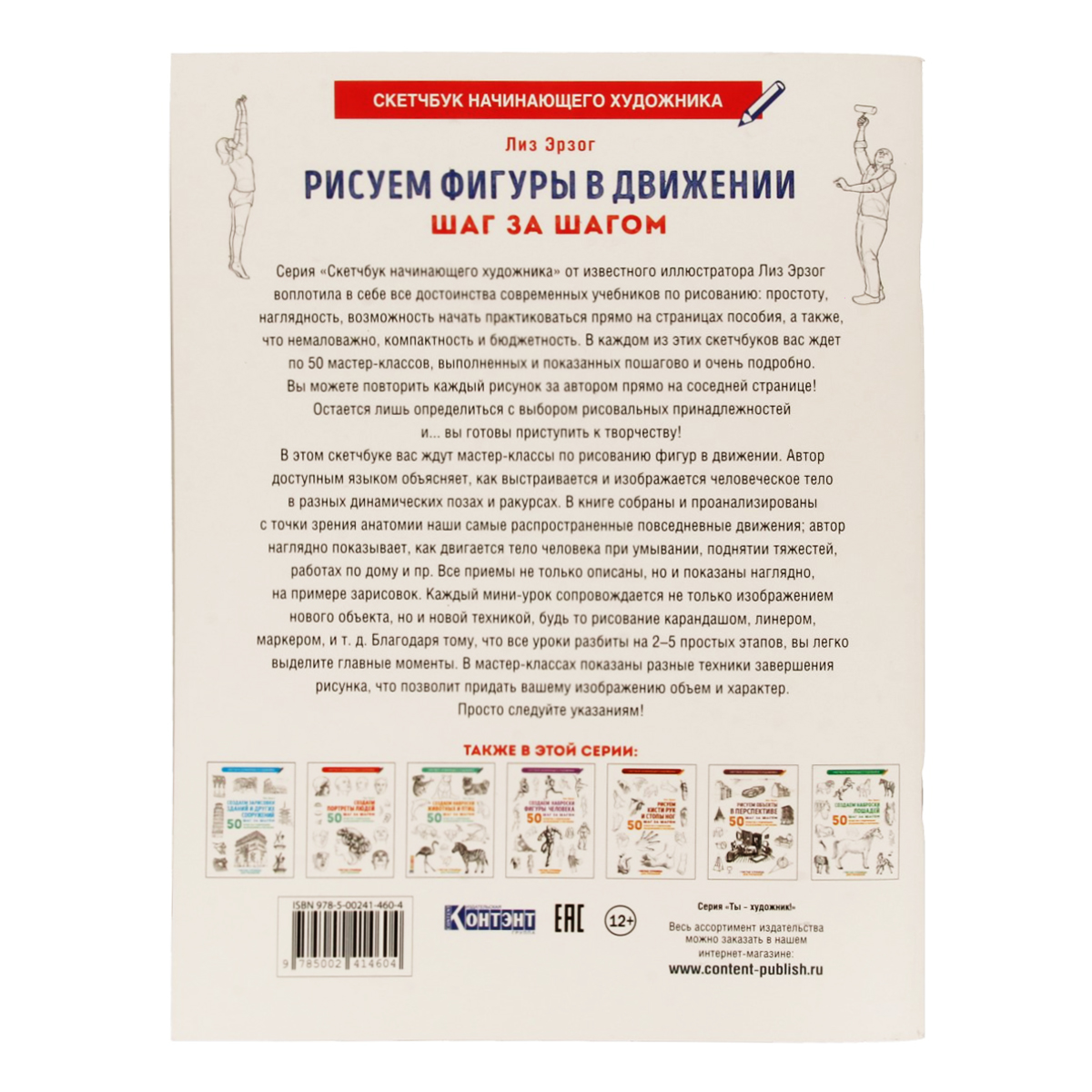 Серия «Скетчбук начинающего художника» от известного иллюстратора Лиз Эрзог воплотила в себе все достоинства современных учебников по рисованию: простоту, наглядность, возможность начать практиковаться прямо на страницах пособия, а также, что немаловажно, компактность и бюджетность. В каждом из этих скетчбуков вас ждет по 50 мастерклассов, выполненных и показанных пошагово и очень подробно. Вы можете повторить каждый рисунок за автором прямо на соседней странице! Остается лишь определиться с выбором рисовальных принадлежностей и... вы готовы приступить к творчеству! В этом скетчбуке вас ждут мастер-классы по рисованию фигур в движении. Автор доступным языком объясняет, как выстраивается и изображается человеческое тело в разных динамических позах и ракурсах. В книге собраны и проанализированы с точки зрения анатомии наши наиболее распространенные повседневные движения; автор наглядно показывает, как двигается тело человека при умывании, поднятии тяжестей, работах по дому и пр.