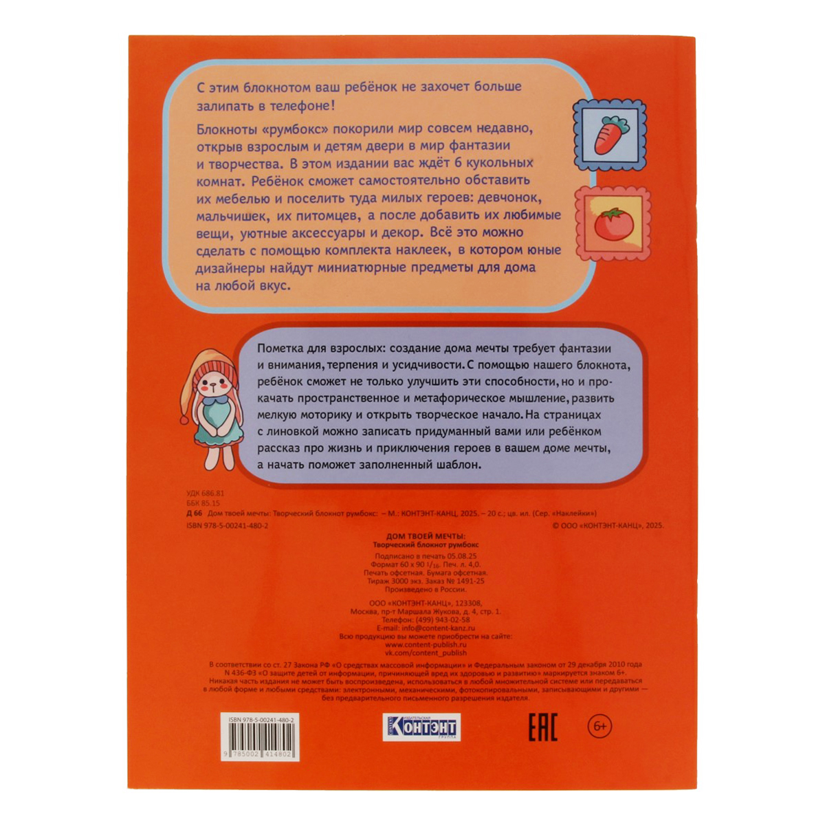 С ЭТИМ БЛОКНОТОМ ВАШ РЕБЁНОК НЕ ЗАХОЧЕТ БОЛЬШЕ ЗАЛИПАТЬ В ТЕЛЕФОНЕ! Блокноты «румбокс» покорили мир совсем недавно, открыв взрослым и детям двери в мир фантазии и творчества. В этом издании вас ждёт 6 кукольных комнат. Ребёнок сможет самостоятельно обставить их мебелью и поселить туда милых героев: девчонок, мальчишек, aксессуары и декор. Всё это можно сделать с помощью комплекта наклеек, в котором юные дизайнеры найдут миниатюрные предметы для дома на любой вкус. Наклейки можно вклеивать в анкету, а можно украшать ими блокноты, обложки, пеналы, тетрадки, планшеты, смартфоны и т. д.