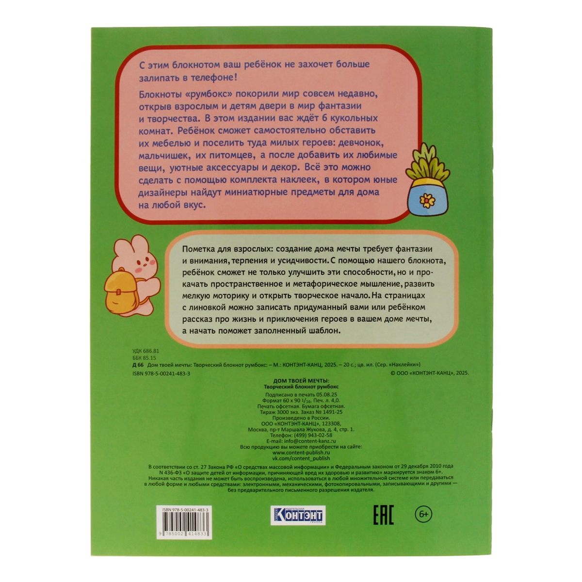 С ЭТИМ БЛОКНОТОМ ВАШ РЕБЁНОК НЕ ЗАХОЧЕТ БОЛЬШЕ ЗАЛИПАТЬ В ТЕЛЕФОНЕ! Блокноты «румбокс» покорили мир совсем недавно, открыв взрослым и детям двери в мир фантазии и творчества. В этом издании вас ждёт 6 кукольных комнат. Ребёнок сможет самостоятельно обставить их мебелью и поселить туда милых героев: девчонок, мальчишек, aксессуары и декор. Всё это можно сделать с помощью комплекта наклеек, в котором юные дизайнеры найдут миниатюрные предметы для дома на любой вкус. Наклейки можно вклеивать в анкету, а можно украшать ими блокноты, обложки, пеналы, тетрадки, планшеты, смартфоны и т. д.