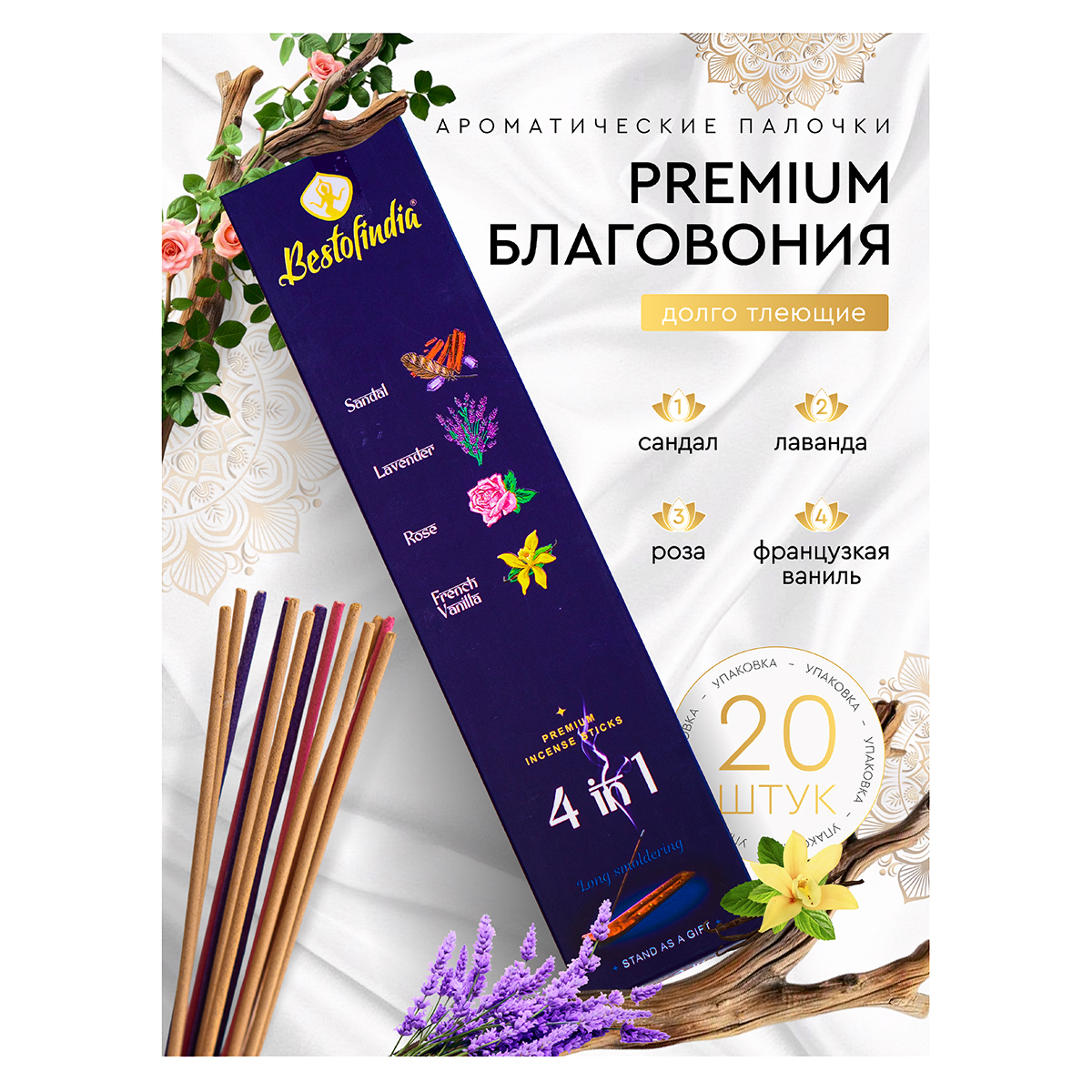 "Bestofindia" Ароматические палочки 4 в 1 с подставкой 20 шт. Сандал, Лаванда, Роза, Французская ваниль BST02714