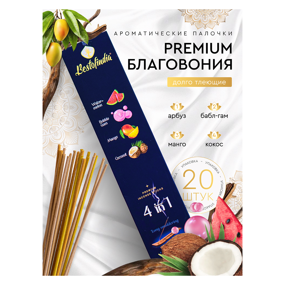 Натуральные индийские благовония Bestofindia. 20 шт. больших аромапалочек 30см + подарок подставка [лыжа]. Изготовлены из высококачественных и натуральных компонентов. Погрузитесь в атмосферу уюта с нашими аромапалочками, которые станут неотъемлемой частью вашего дома. Этот стильный и элегантный аксессуар создан для тех, кто ценит натуральные ароматы и хочет наполнить свое пространство спокойствием и гармонией. Наш набор благовоний является идеальным подарком на 8 марта любимой женщине. Используя аромадиффузор, вы сможете наслаждаться волшебными запахами сандала, лаванды, пачули и вишни, которые создают неповторимую ауру в каждой комнате. Набор включает в себя палочки Анти-стресс, которые удобно размещаются на подставке, обеспечивая стойкий аромат на долгое время. Ароматические палочки легко вписываются в любой интерьер и добавляют изысканный штрих в декор. Благовония обеспечивают комфорт и способствуют расслаблению, создавая идеальные условия для медитации или просто отдыха после трудного дня. Погрузитесь в мир ароматов и создайте свой уютный уголок, где каждый вдох будет приносить радость и умиротворение. Обладают нежным ароматом и благотворными свойствами. Ароматерапия занимает значительное место в аюрведе и шаг за шагом становится составляющей медицины. Считается, что сеансы ароматерапии поддерживают гармонию, помогают избежать негатива, борются с бессонницей, снимают беспокойство, нервное напряжение, депрессии, стресс, избавляют от бессонницы, восстанавливают объективность психики, помогает обрести адекватность и самодостаточность, избавиться от апатии, вялости, замедленной реакции, ложных самооценок. Подставка изготовлена из мангового дерева.