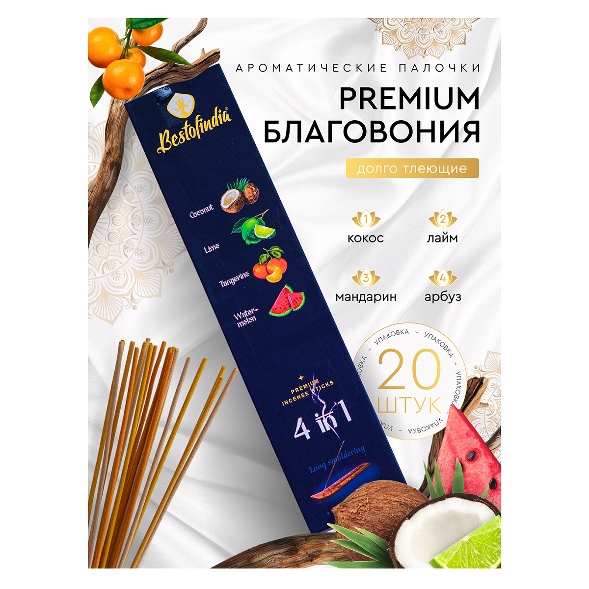 "Bestofindia" Ароматические палочки 4 в 1 с подставкой 20 шт. Кокос, Лайм, Мандарин, Арбуз BST02717