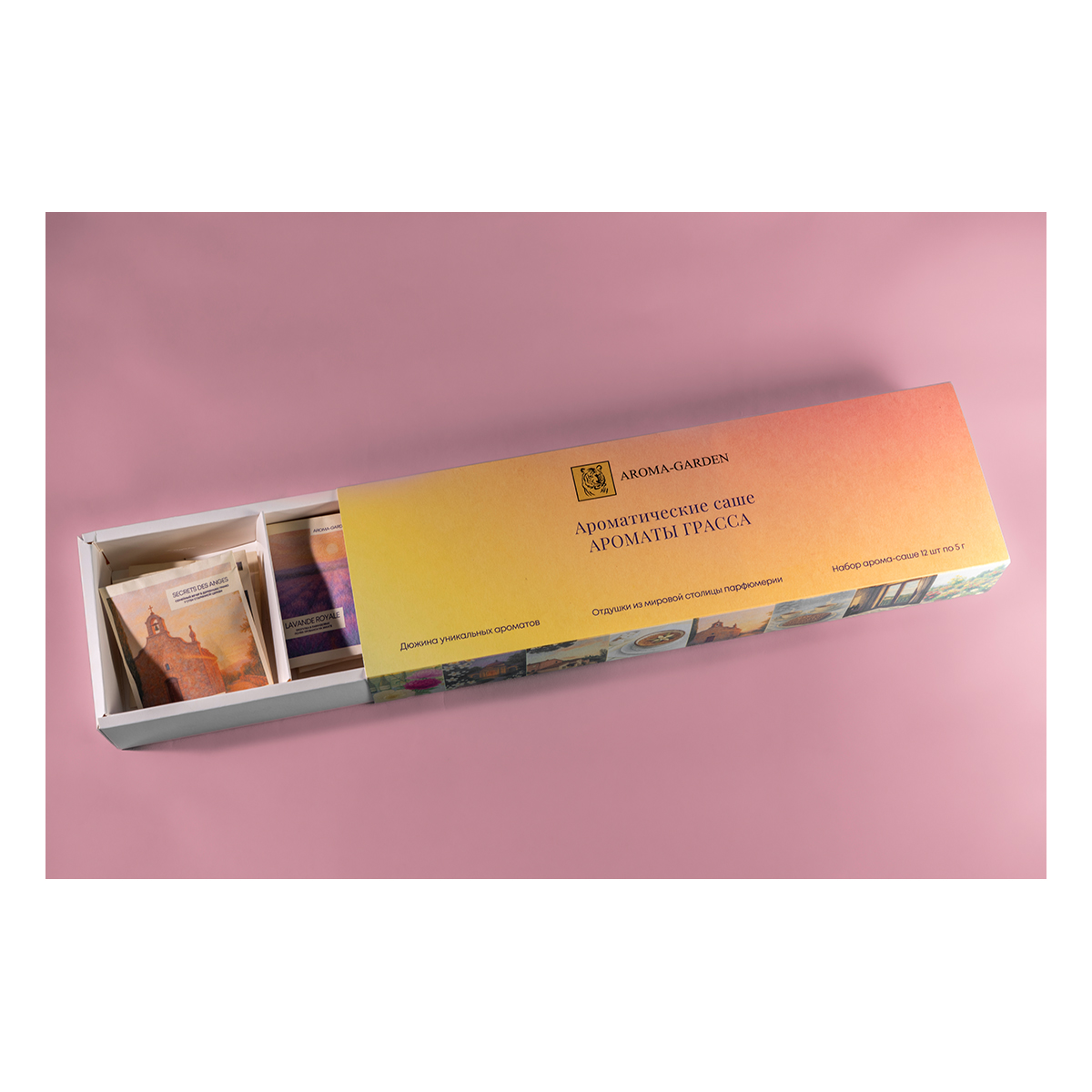 Набор подарочный из 12 ароматических саше,изготовленных по технологии AROMA-TOUCH в дизайнерской коробке-слайдере с 4 отделениями, по 3 саше в каждом. Аромат каждого арома-саше ассоциируется с отдельным местом или историей, о чем написано коротко на упаковке и на общей сопроводительной открытке, которая прилагается к каждому набору. Двенадцать французских ароматов из сердца парфюмерной столицы мира Грааса.Каждый запах-это страница из дневника. где записаны самые яркие мгновения путешествия по Лазурному берегу и не только