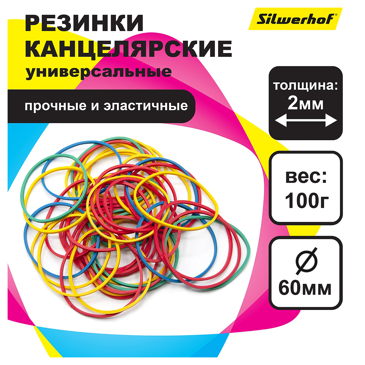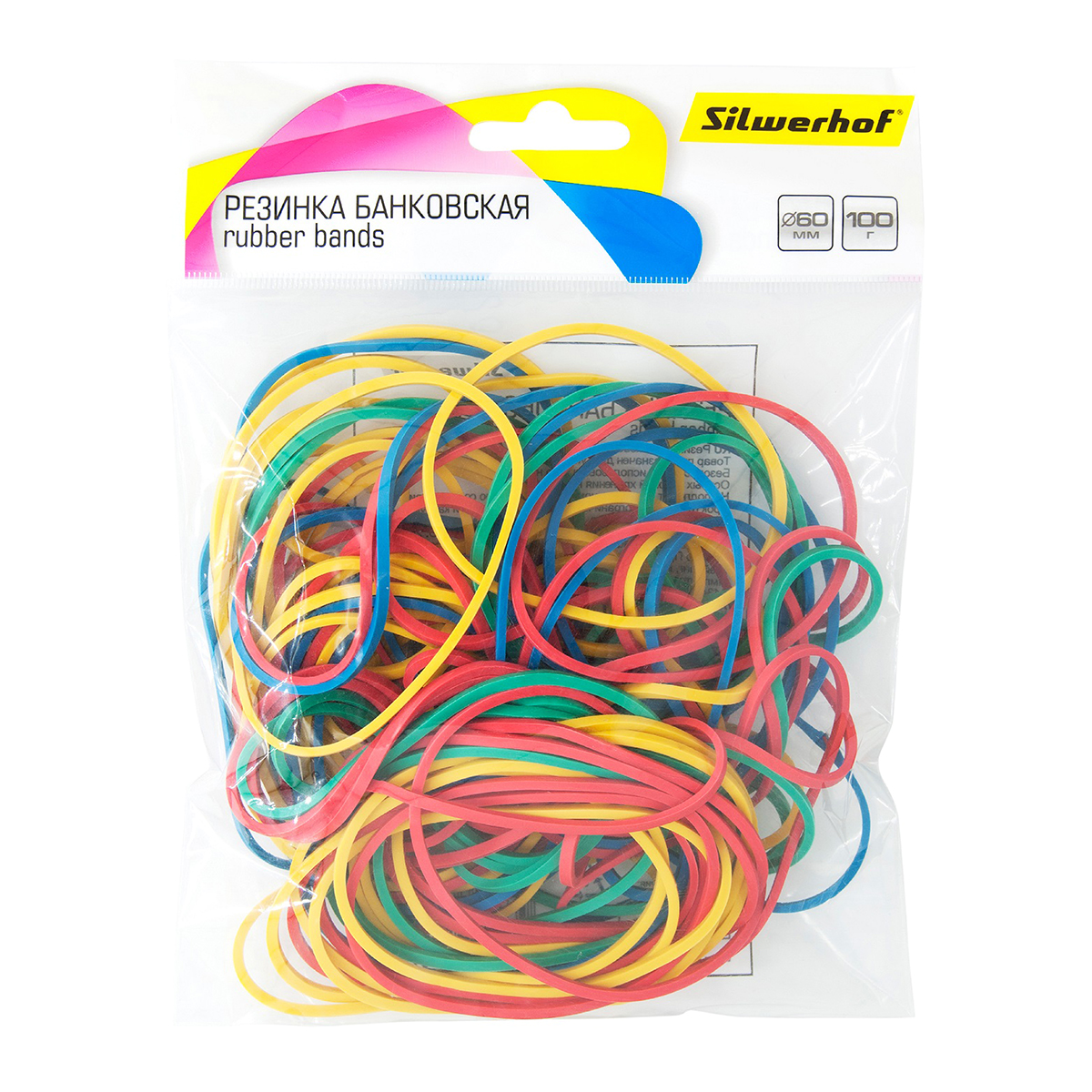 Резинки для купюр Silwerhof 100 грамм, ассорти. Предназначены для фасовки и упаковки денежных купюр и мелких предметов. Канцелярские резинки имеют толщину 2 мм. и равномерный цвет. Плотные и хорошо тянутся.
