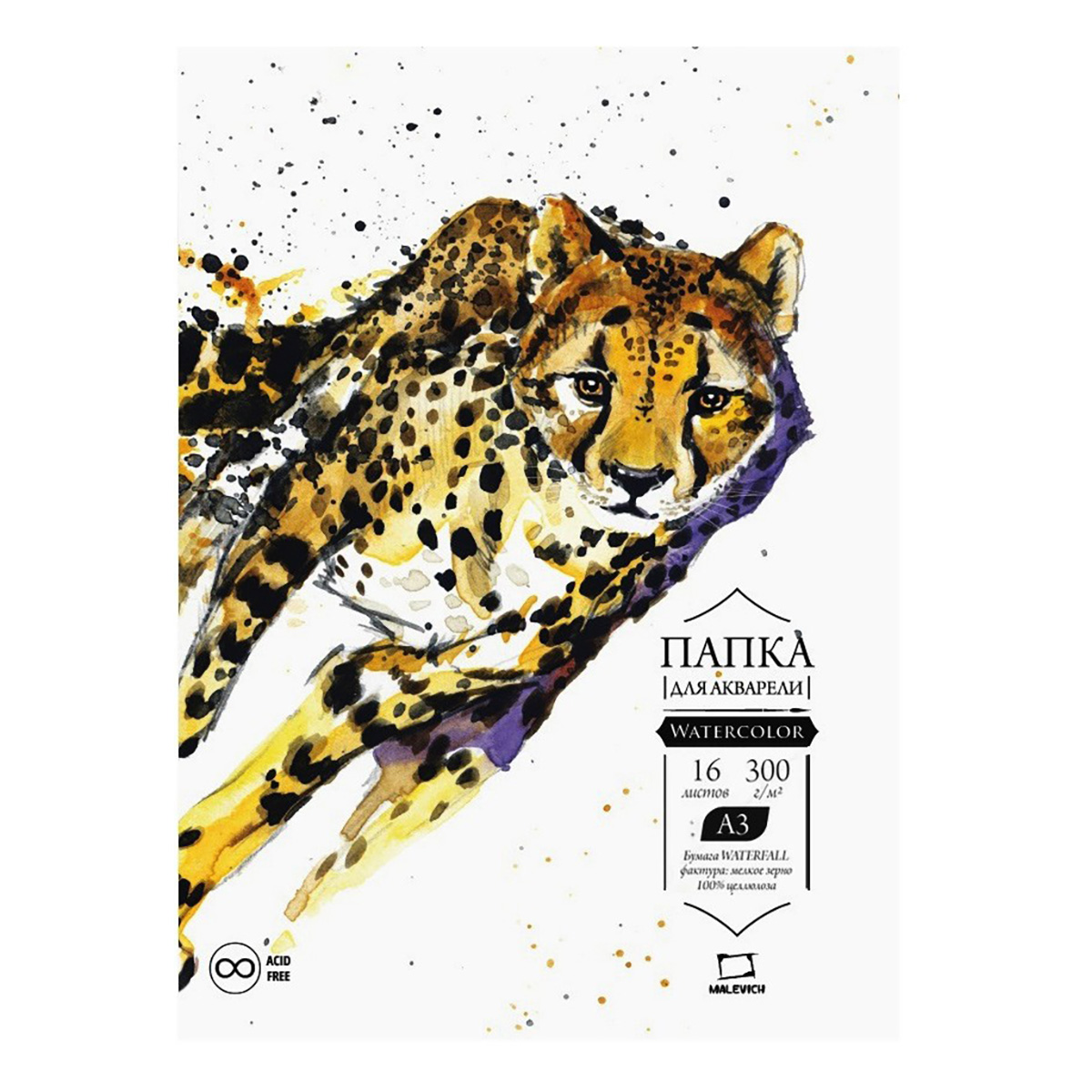 Папка для акварели Малевичъ "Waterfall", 300 г/м, А3, 16л. Профессиональная бумага для акварели плотностью 300 г/м с мелким зерном из 100% альфа целлюлозы натурального белого цвета. Из бумаги удален лигнин [woodpulp paper], за счет чего бумага не стареет, не желтеет и сохраняет рисунок на долгие годы. Обеспечивает равномерную акварельную заливку, впитывает воду, но при этом слабо деформируется, стойка к вымыванию. Не съедает цвет, оставляя яркие цвета неизменными. Без кислот. Бумага формата А3, в папке 16 листов.