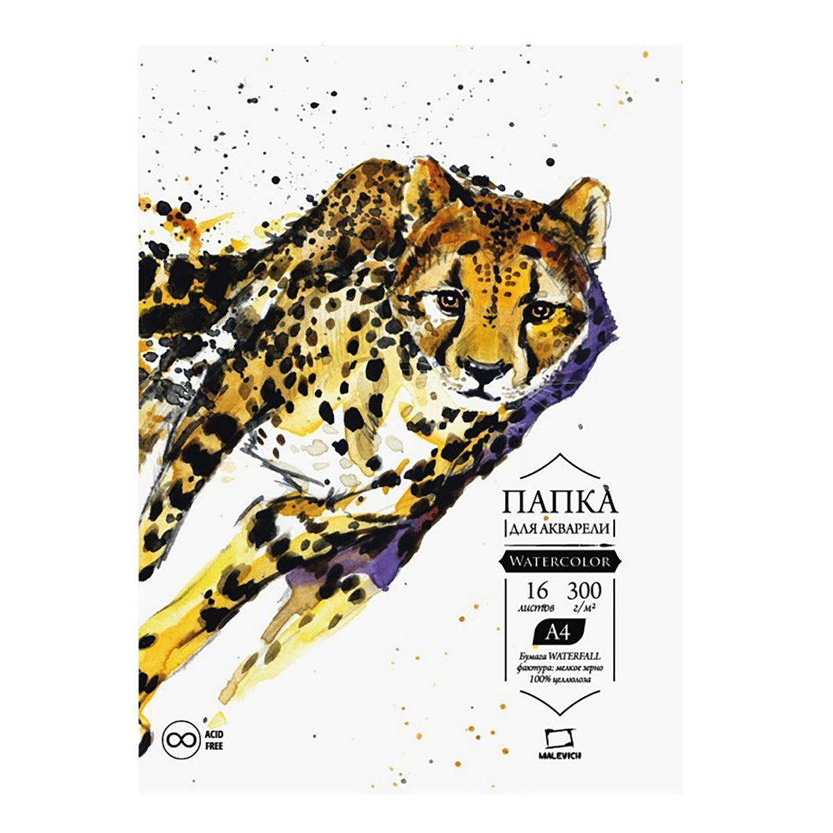 Папка для акварели Малевичъ "Waterfall", 300 г/м, А4, 16л. Профессиональная бумага для акварели плотностью 300 г/м с мелким зерном из 100% альфа целлюлозы натурального белого цвета. Из бумаги удален лигнин [woodpulp paper], за счет чего бумага не стареет, не желтеет и сохраняет рисунок на долгие годы. Обеспечивает равномерную акварельную заливку, впитывает воду, но при этом слабо деформируется, стойка к вымыванию. Не съедает цвет, оставляя яркие цвета неизменными. Без кислот. Бумага формата А4, в папке 16 листов.