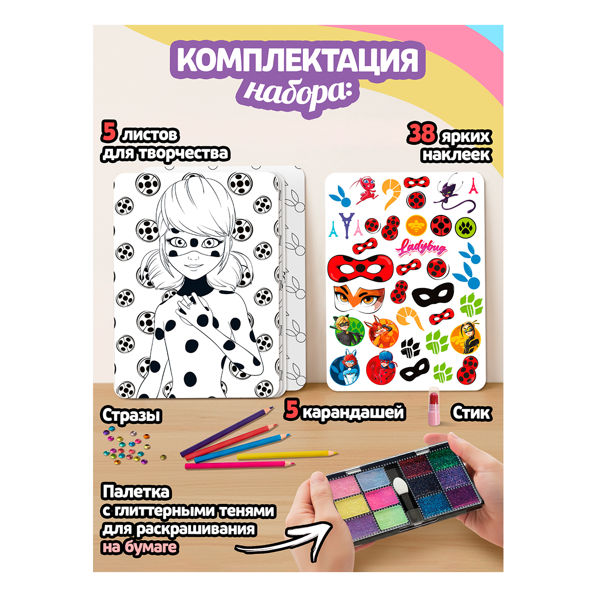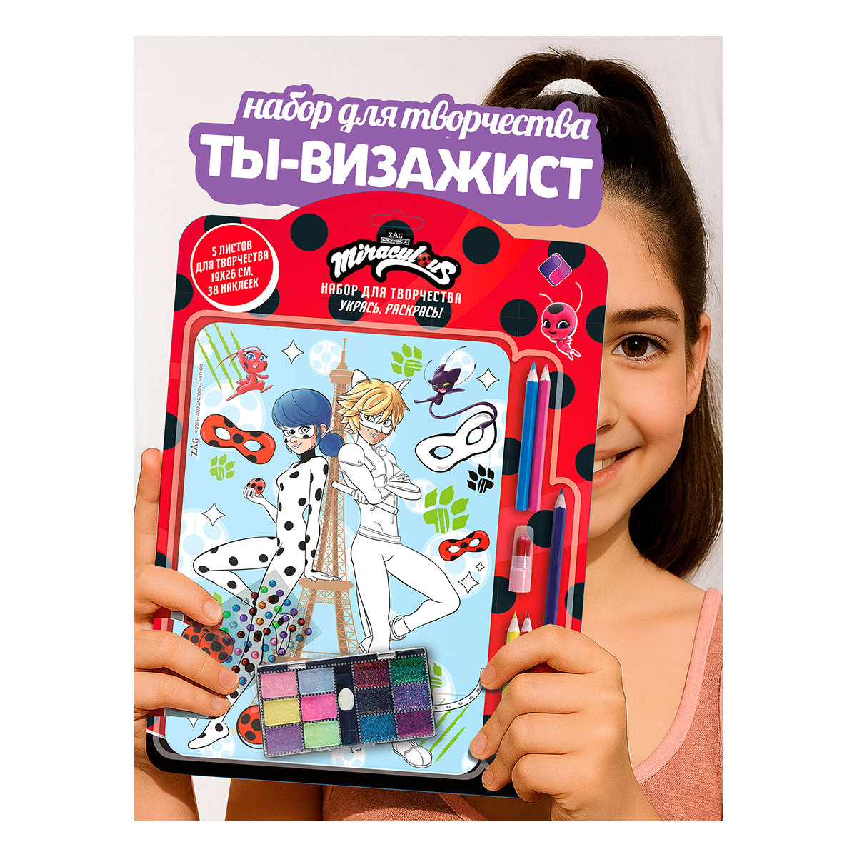 Набор для творчества "Укрась!Раскрась" с Леди Баг - отличный подарок для девочки. В комплекте 5 больших карточек для раскрашивания, палетка [имитация теней для век] из 12 цветов + кисточка, 1 стик в виде помады, стразы, карандаши и лист наклеек с аксессуарами. Используйте палетку и стик для создания ярких образов, смешивай и сочетай цвета. Затем укрась его эффектными наклейками и стразами, чтобы завершить образ — дерзай!Состав набора: - 5 картинок для раскрашивания 19*26 см + 1 лист наклеек 19*26 см, 5 карандашей, палетка сухих красок 12 цветов, стик, стразы Упаковка: блистер 25,5*35 см