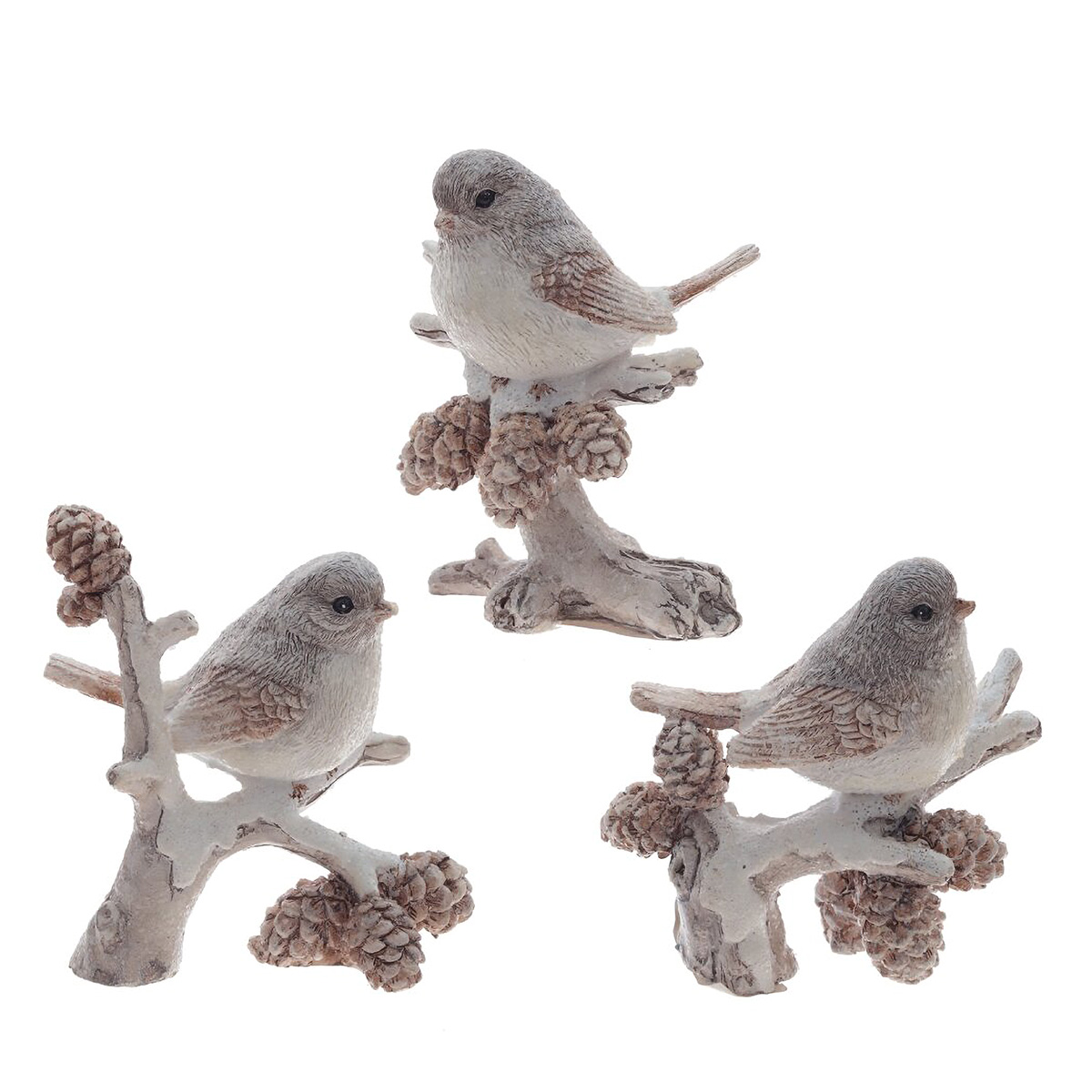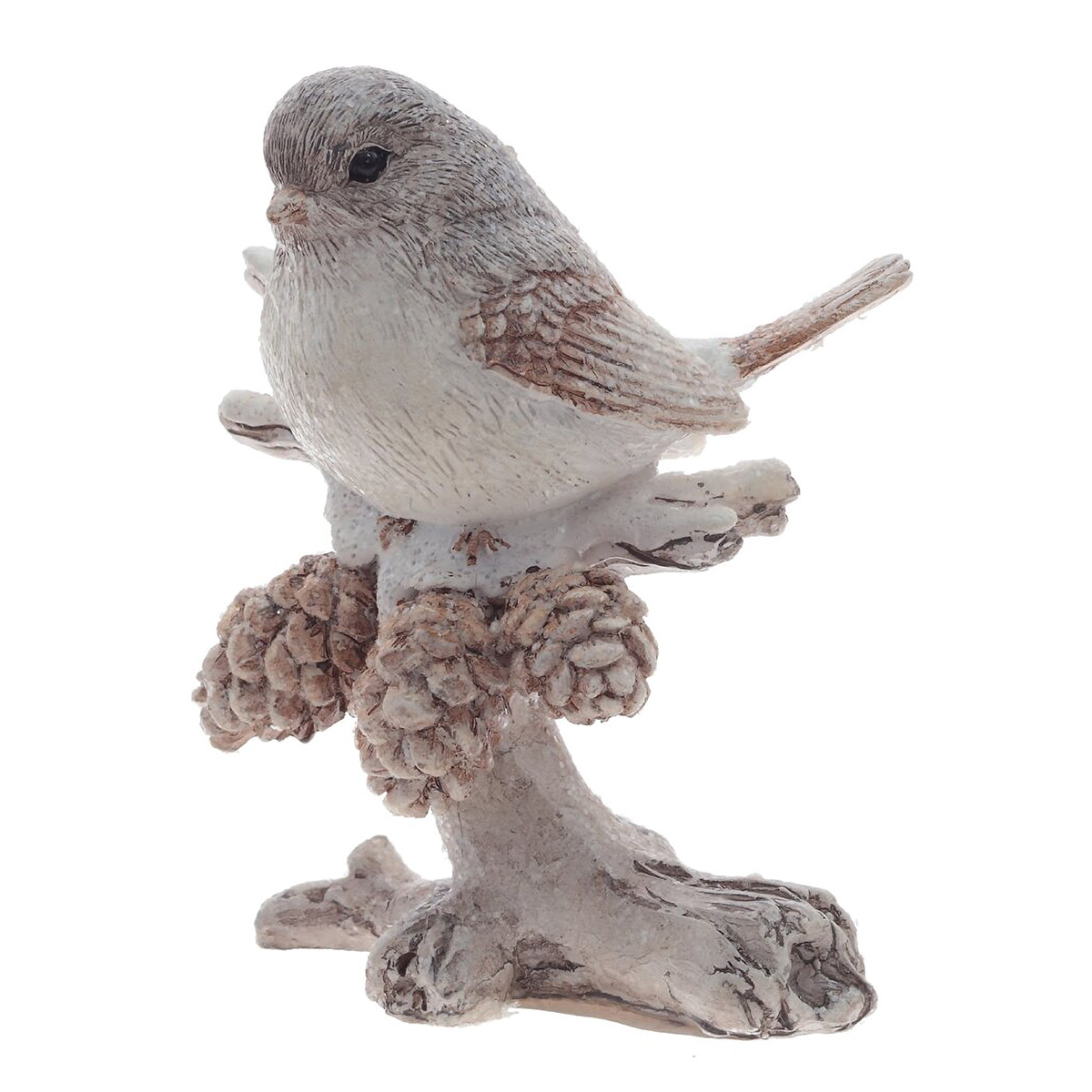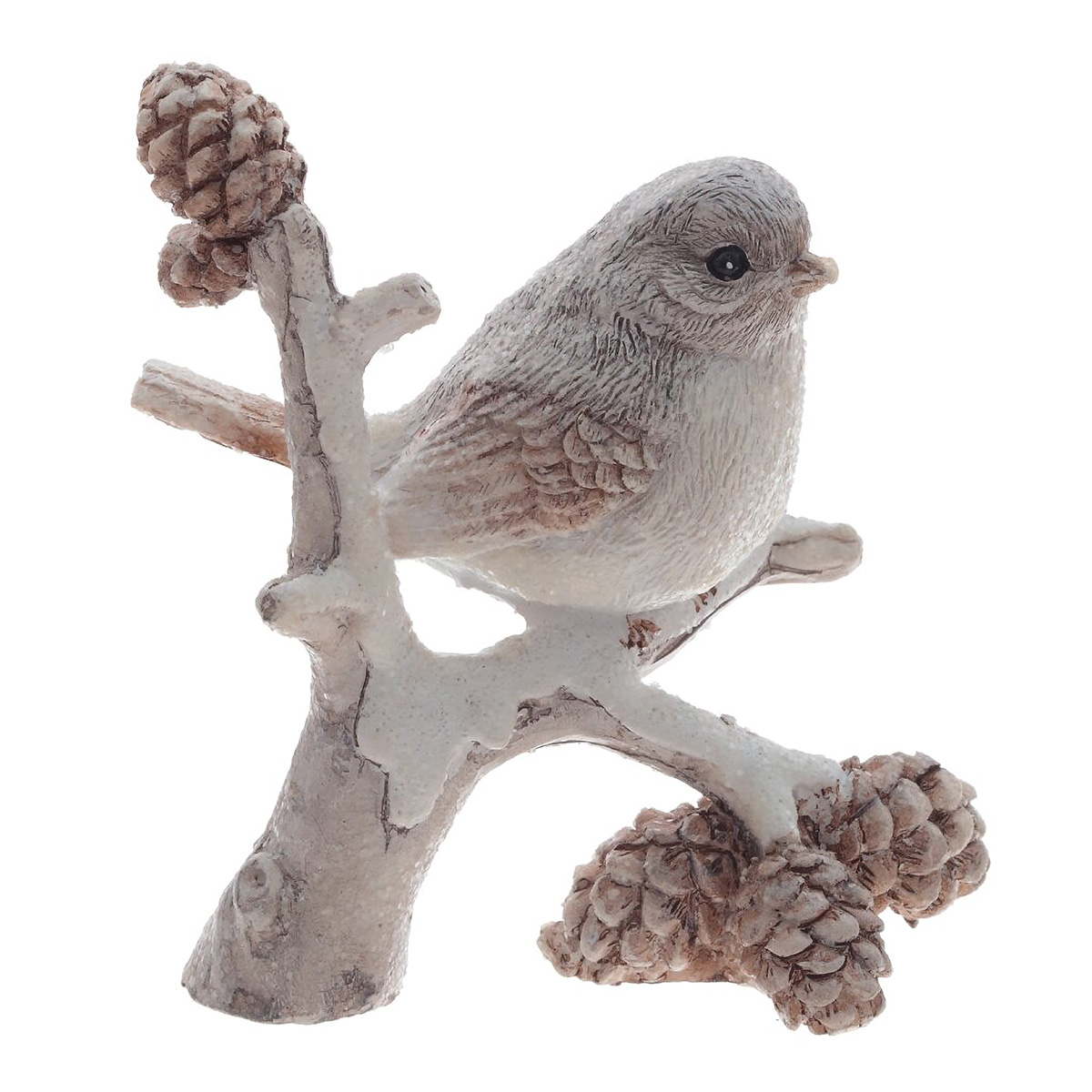 811063Фигурка декоративная "Птичка", L9 W5,5 H8,5 см, 3в.Декоративная фигурка из полимерных материалов изображает милую птичку, сидящую на изогнутой ветке с детально проработанными шишками. Легкая матовая патина создает эффект припорошенного снегом зимнего леса, а фактура перьев и коры выглядит естественно и объёмно. Устойчивая основа в виде корня надежно держит изделие на полке или каминной полке. Нейтральные серо-бежевые тона гармонично впишутся в сканди, эко или классический интерьер. Фигурка станет аккуратным акцентом для гостиной, спальни или прихожей, уместна в новогодних композициях и как приятный подарок. Представлено в трех вариантах.