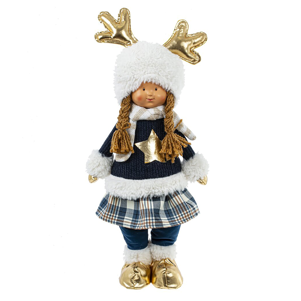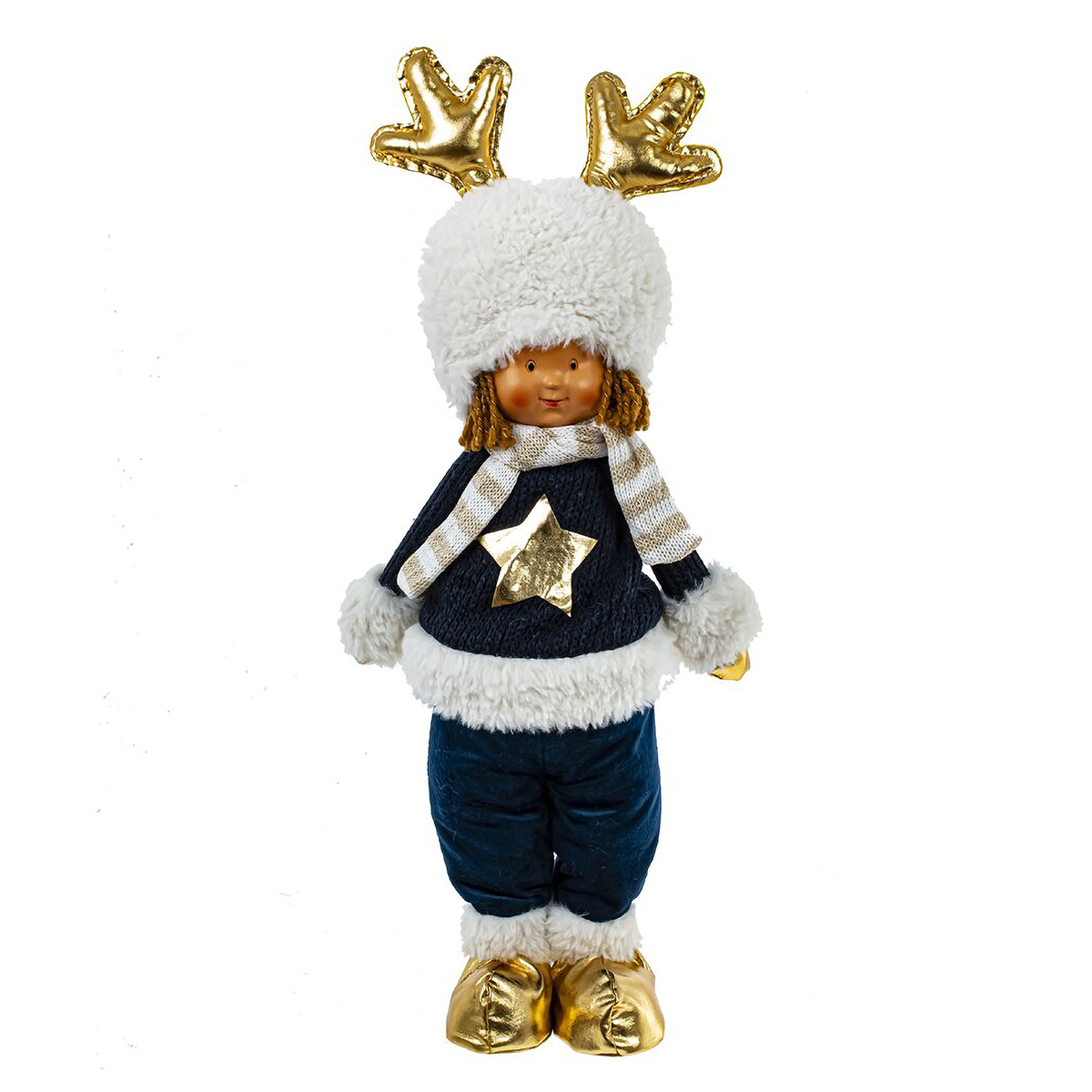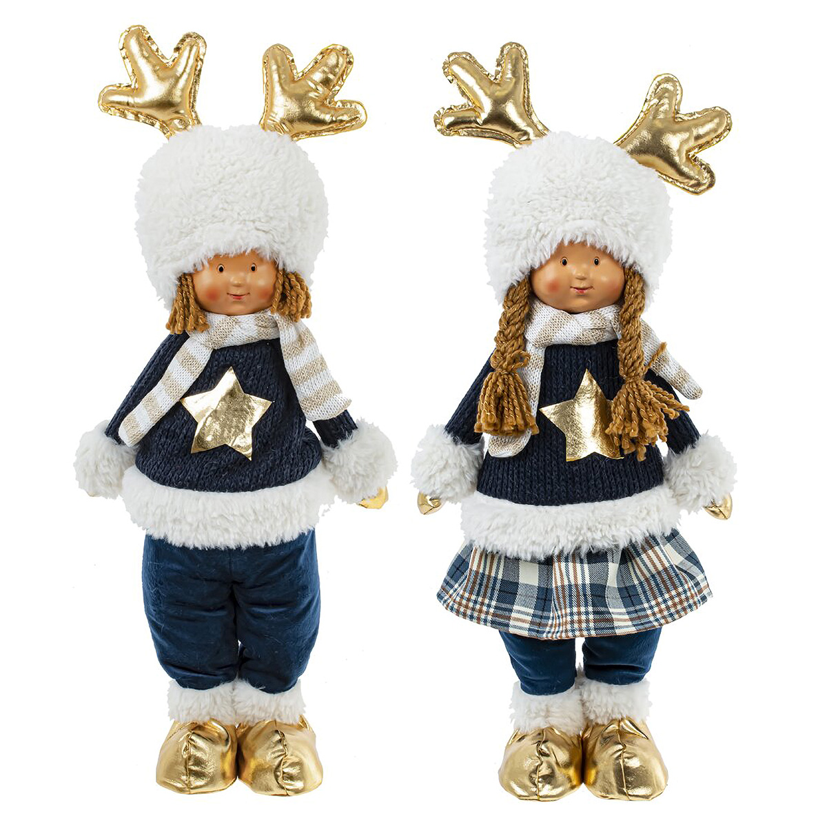 813345Игрушка набивная "Мальчик, Девочка", L20 W12 H49/42 см, 2в.Игрушка набивная "Мальчик, Девочка" — это очаровательная интерьерная кукла, высотой 50 см. Мальчик и девочка одеты в стильные синие бархатные костюмы, дополненные зимними аксессуарами, такими как шарфик и белая меховая шапочка с золотыми рожками оленя, которые придают им особый шарм. Золотые ботиночки и золотая звездочка на груди гармонично дополняют образ. Эти игрушки прекрасно смотрятся вместе, создавая праздничную атмосферу в интерьере. Каждый из них станет не только милым украшением, но и символом дружбы и тепла. Цена указана за одно изделие. Без возможности выбора дизайна при заказе через интернет-магазин.
