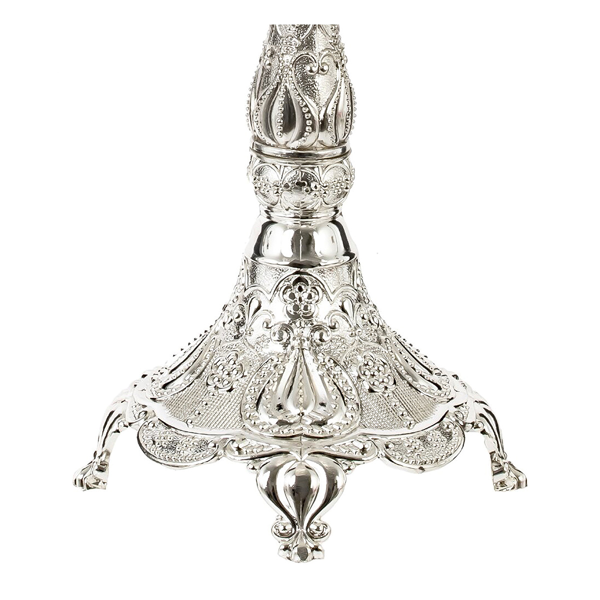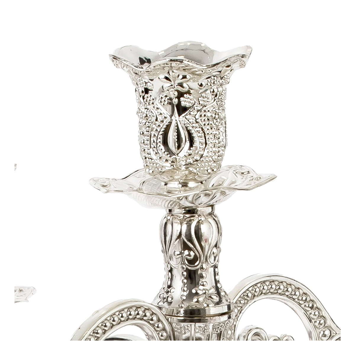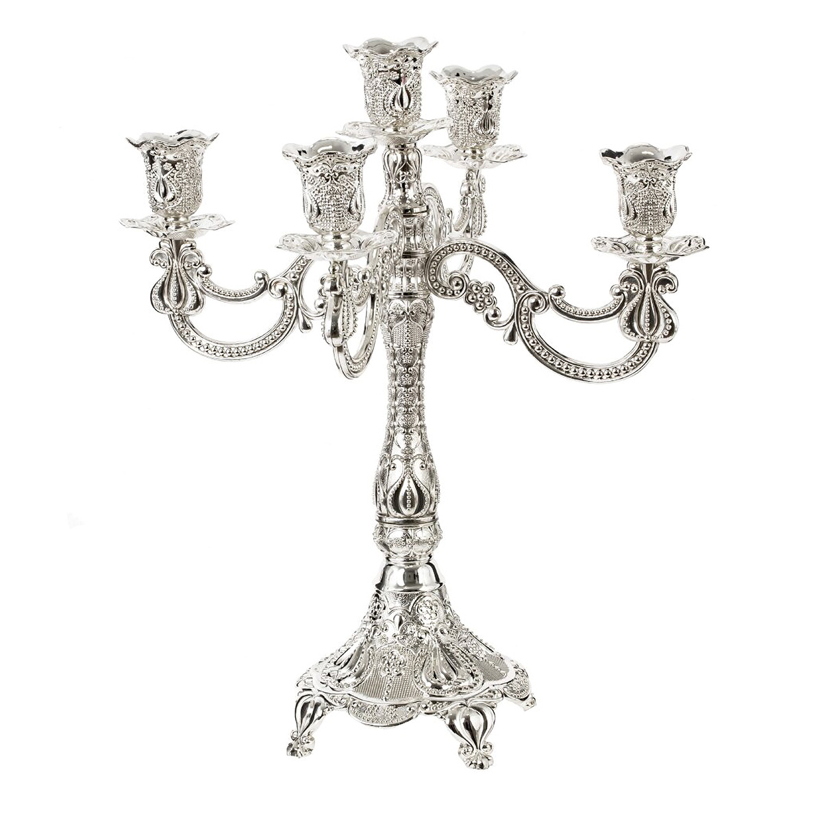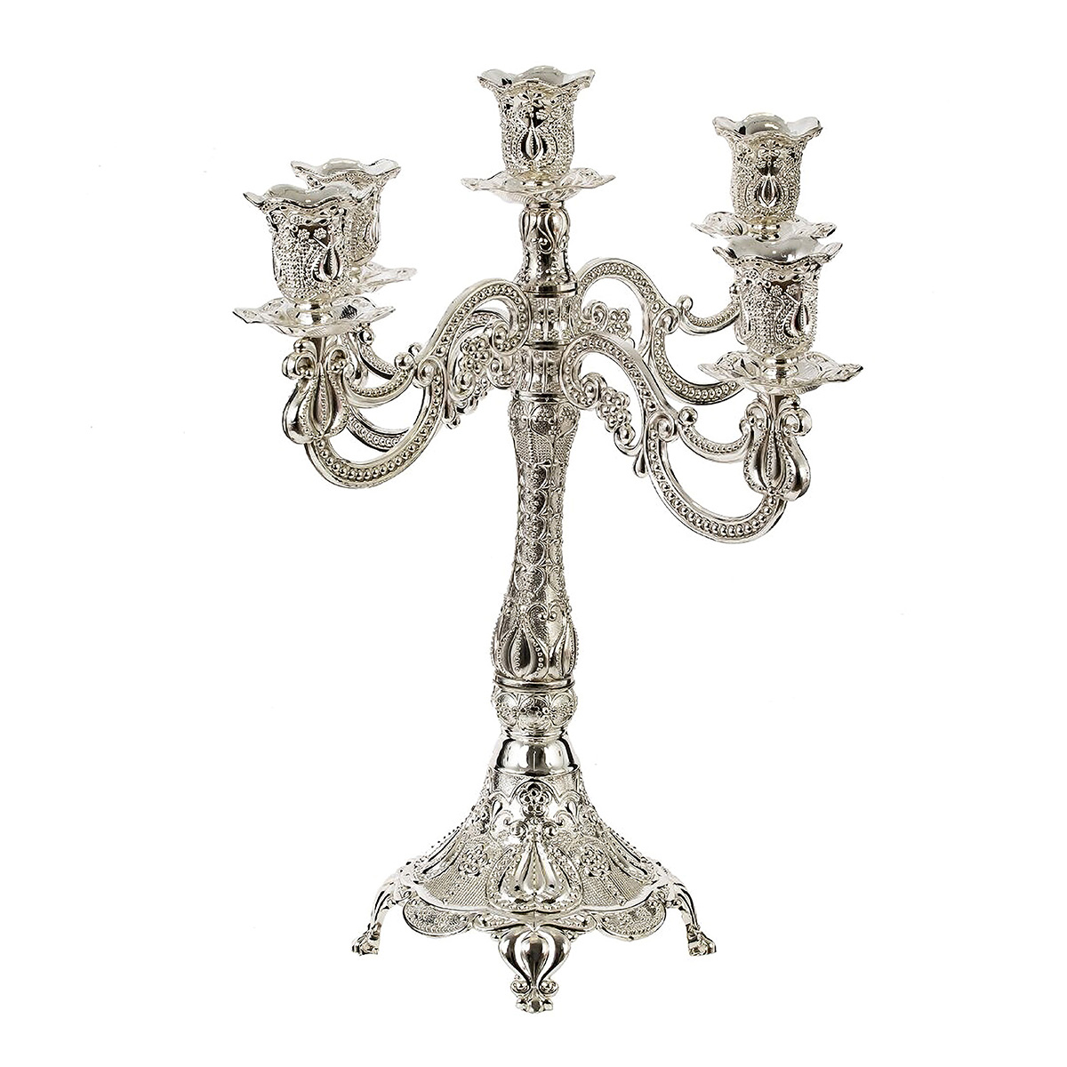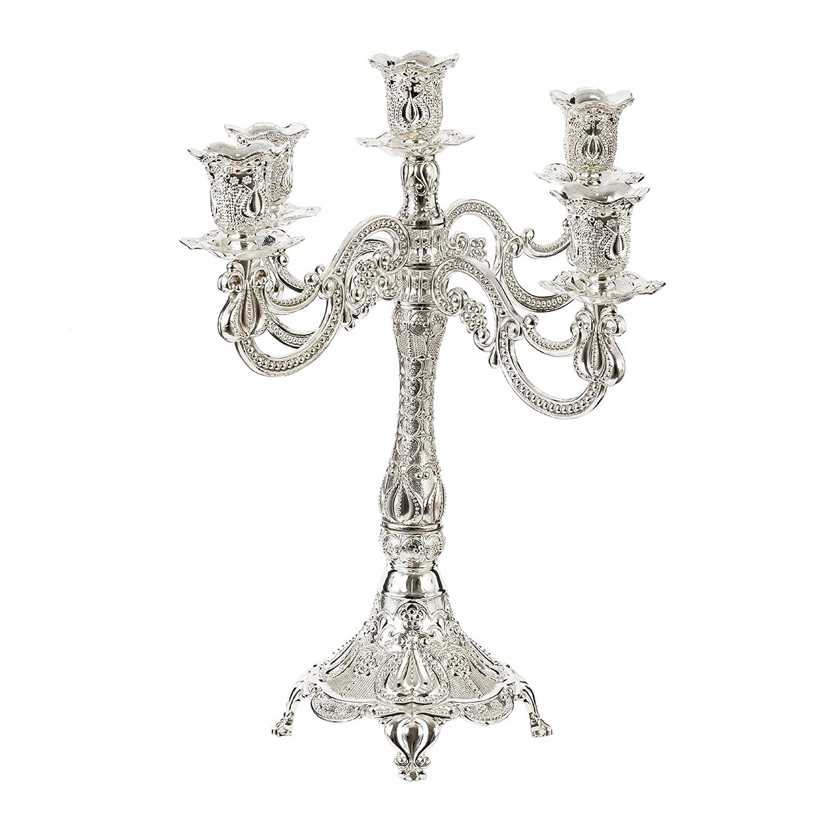 814534Подсвечник для 5-ти свечей, L26 W26 H30,5 смПодсвечник в виде канделябра для пяти свечей – это яркий элемент декора, который привнесет в ваш интерьер изысканность и уют. Изготовленный из качественного металла, он обладает не только стальным блеском, но и прочностью, что гарантирует долговечное использование. Его размеры делают его заметным и эффектным элементом на любом столе, камине или полке. Серебряный цвет подсвечника придает ему элегантность и шик, делая его идеальным дополнением для классических и современных интерьеров. Покрытие великолепно отражает свет и создает атмосферу тепла и уюта. Канделябр станет центральной фигурой на праздничном столе, украсит романтический ужин или добавит нотку роскоши в ваше повседневное пространство. Для свечей, диаметром 2,5 см.