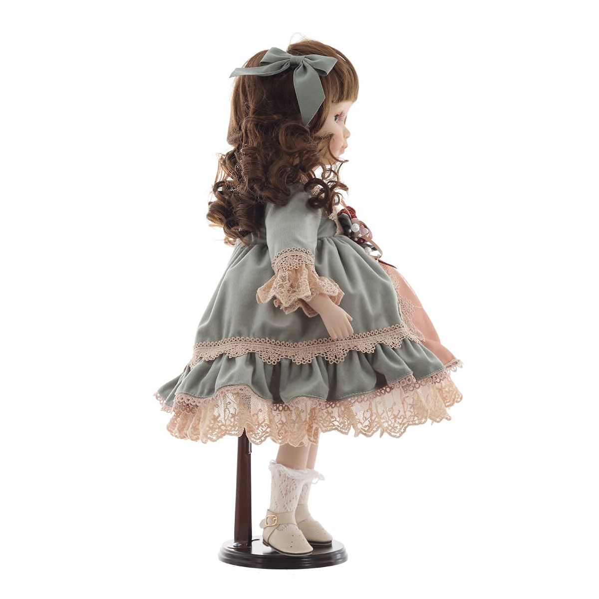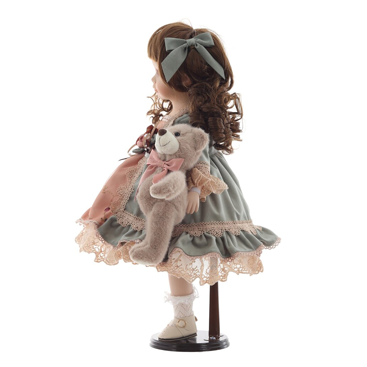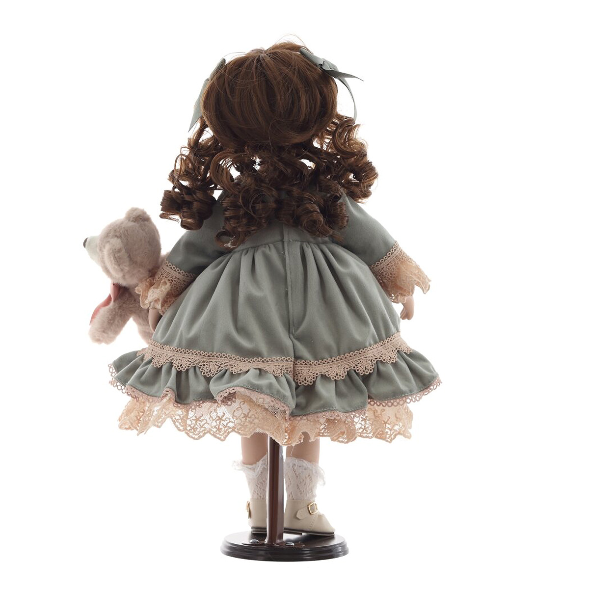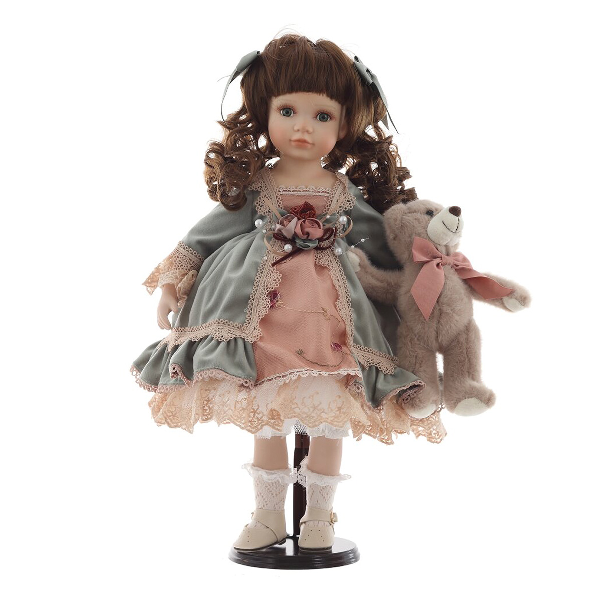 817767Кукла "Александра", L21 W11 H45 смЭлегантная коллекционная кукла с изящными чертами лица и выразительными глазами станет прекрасным украшением интерьера или ценной частью вашей коллекции. Кукла одета в роскошное платье нежных оттенков с кружевами и декоративными элементами. Её каштановые, кудрявые волосы аккуратно уложены и украшены атласными лентами. В руках кукла держит милого плюшевого мишку с бантиком, который придаёт ей ещё больше очарования. Детально проработанные черты лица, изысканная одежда и аксессуары делают эту куклу идеальным подарком для коллекционеров и ценителей винтажных игрушек. Она стоит на специальной подставке, что позволяет удобно размещать её на полке или в витрине.