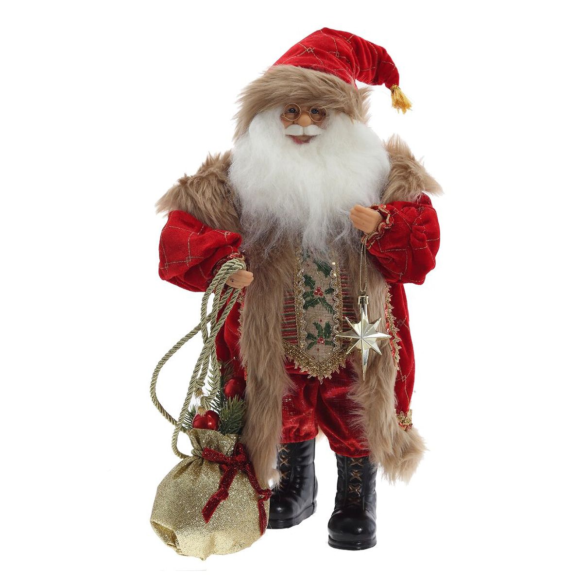 821641Дед Мороз, L27 W20 H64/46 смИнтерьерная фигура Деда Мороза выполнена из сочетания полимерных и текстильных материалов. Лицо, кисти и сапоги сделаны из прочного полимера и аккуратно расписаны, на переносице — миниатюрные очки. Костюм сшит из мягкого бархатистого текстиля с вышивкой и золотистой тесьмой, края отделаны искусственным мехом. Красный колпак дополняет образ. В руках — подвеска?звезда и верёвочный шнур от мешка из мерцающей ткани, украшенного еловыми веточками и ягодами. Пышная белая борода и детализированный декор создают праздничное настроение; изделие устойчиво и подходит для оформления дома, офиса или витрины.