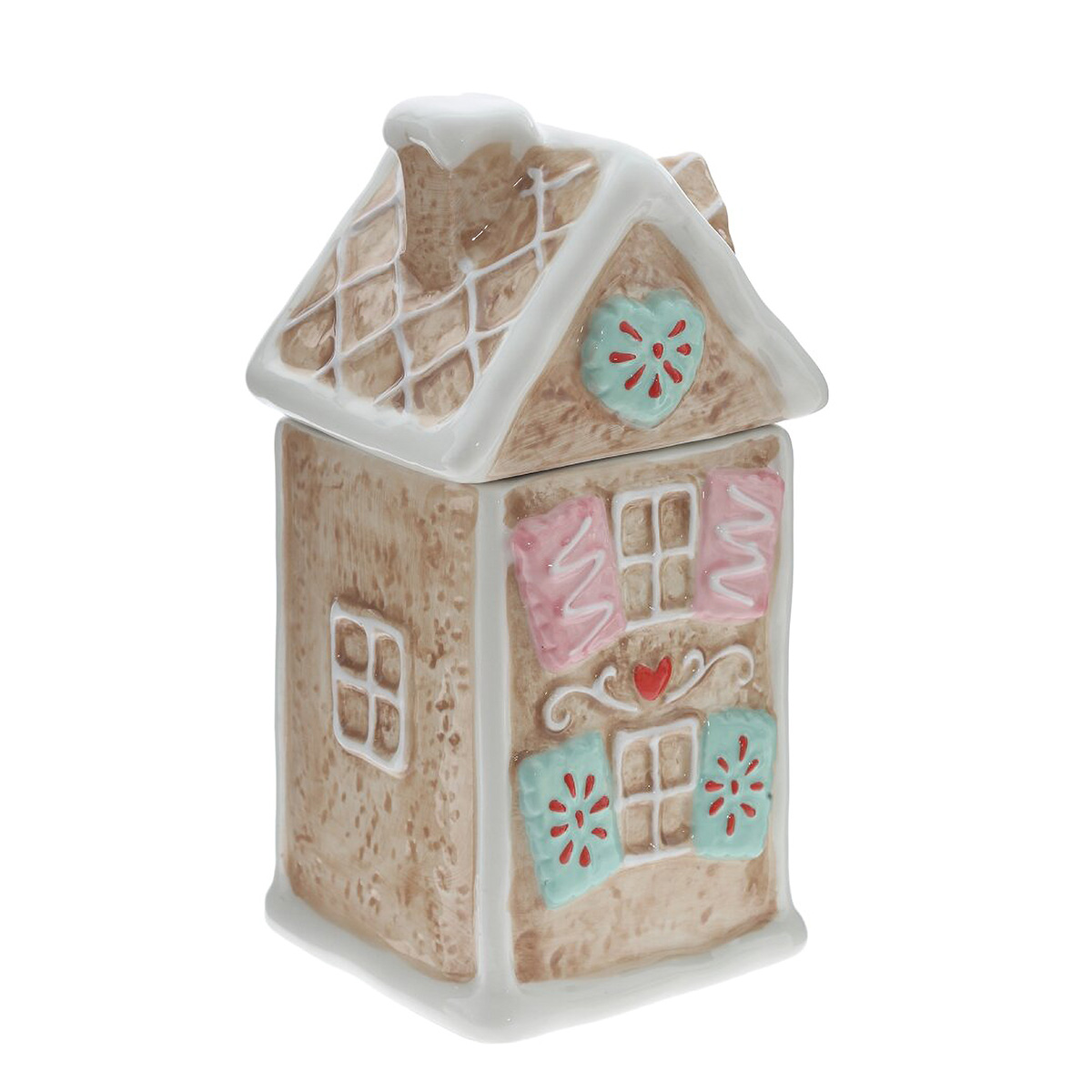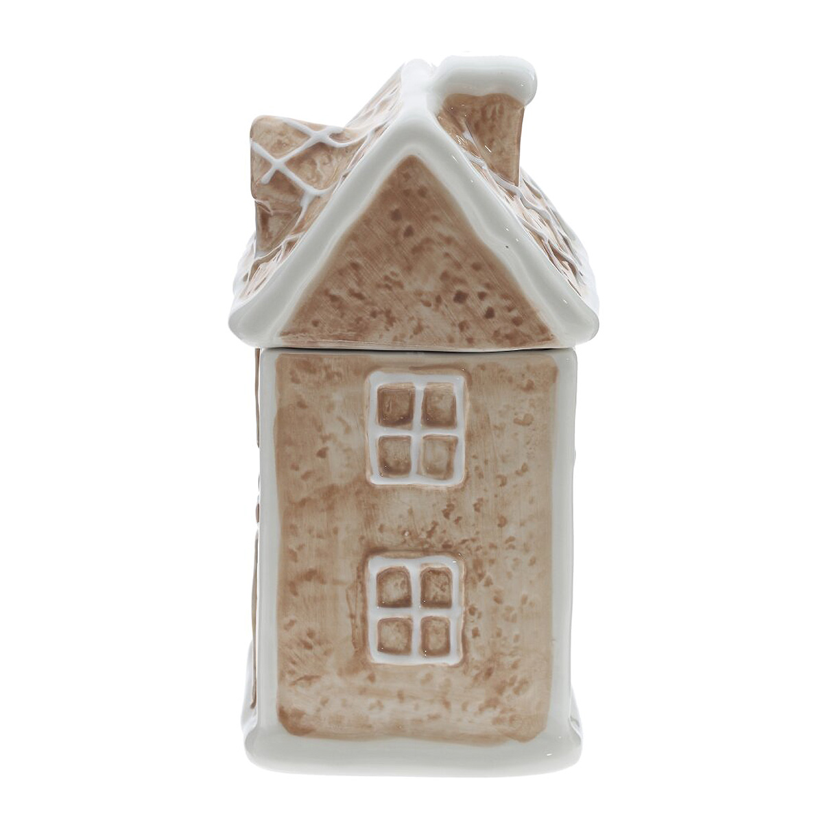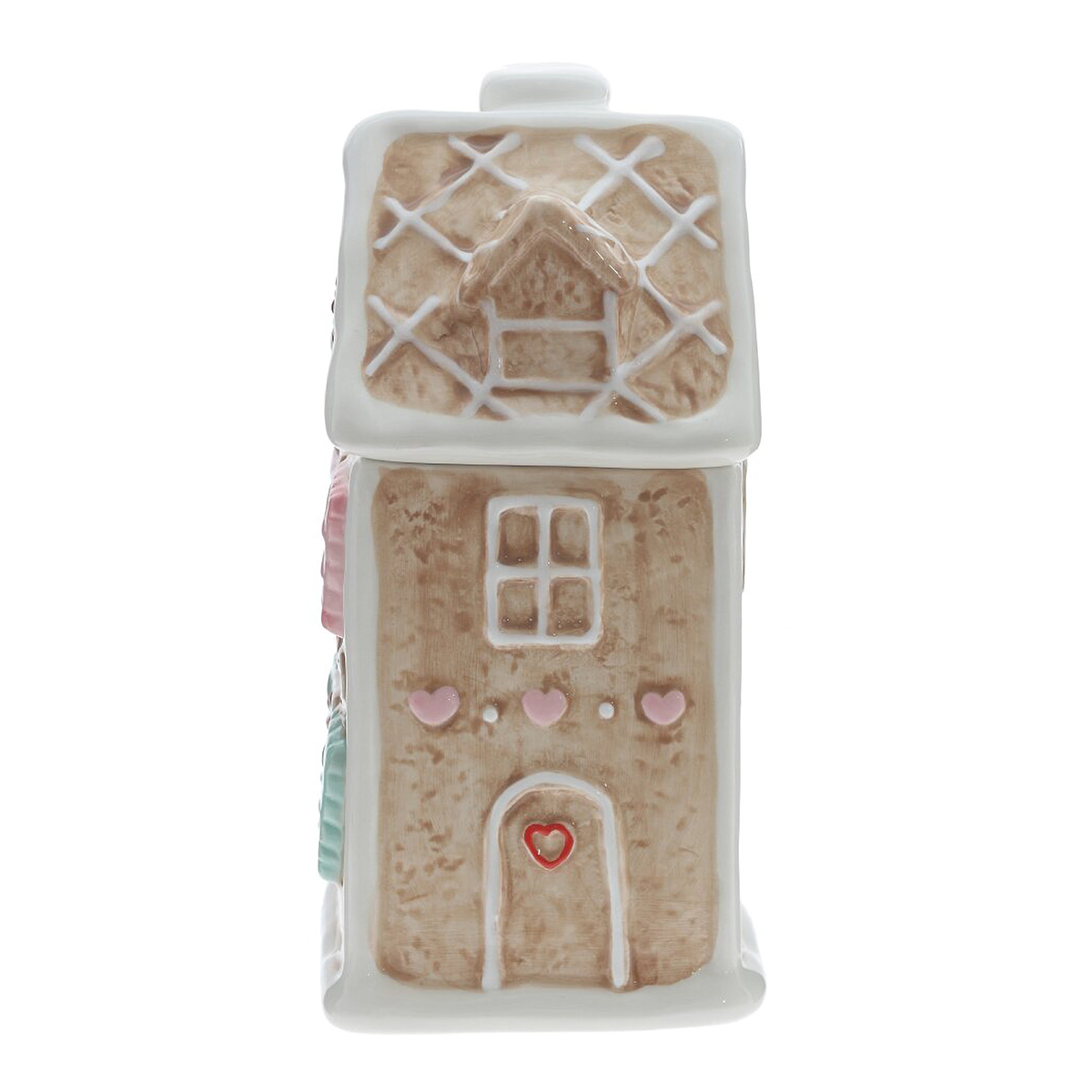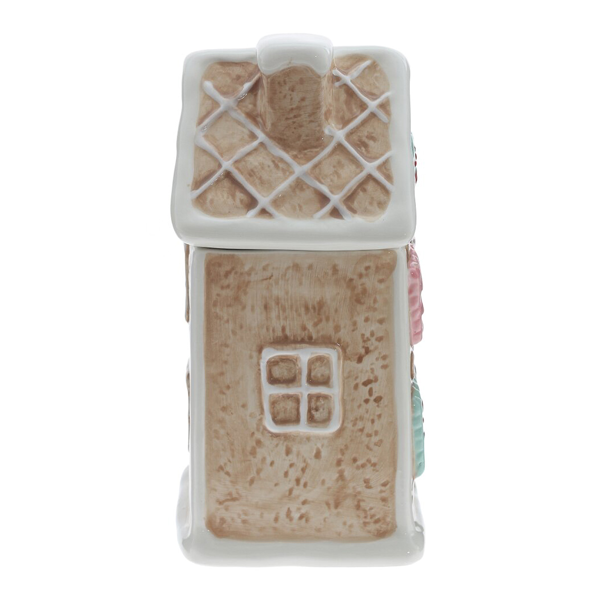 821759Конфетница "Пряник", 1000 мл, L11 W10 H23 смКерамическая конфетница в виде пряничного домика — это не просто посуда, а настоящее праздничное украшение для вашего дома. Изделие выполнено в форме уютного домика и декорировано яркой глазурью, имитирующей сладкую отделку: снежные крыши и глазурные узоры. Такая конфетница создаёт атмосферу уюта и сказки, особенно в зимние праздники. Она идеально подойдёт для хранения конфет, печенья, пряников и других сладостей, радуя как детей, так и взрослых. Качественная керамика обеспечивает прочность и долговечность, а необычный дизайн делает её отличным выбором для украшения новогоднего стола или в качестве оригинального подарка на Рождество.