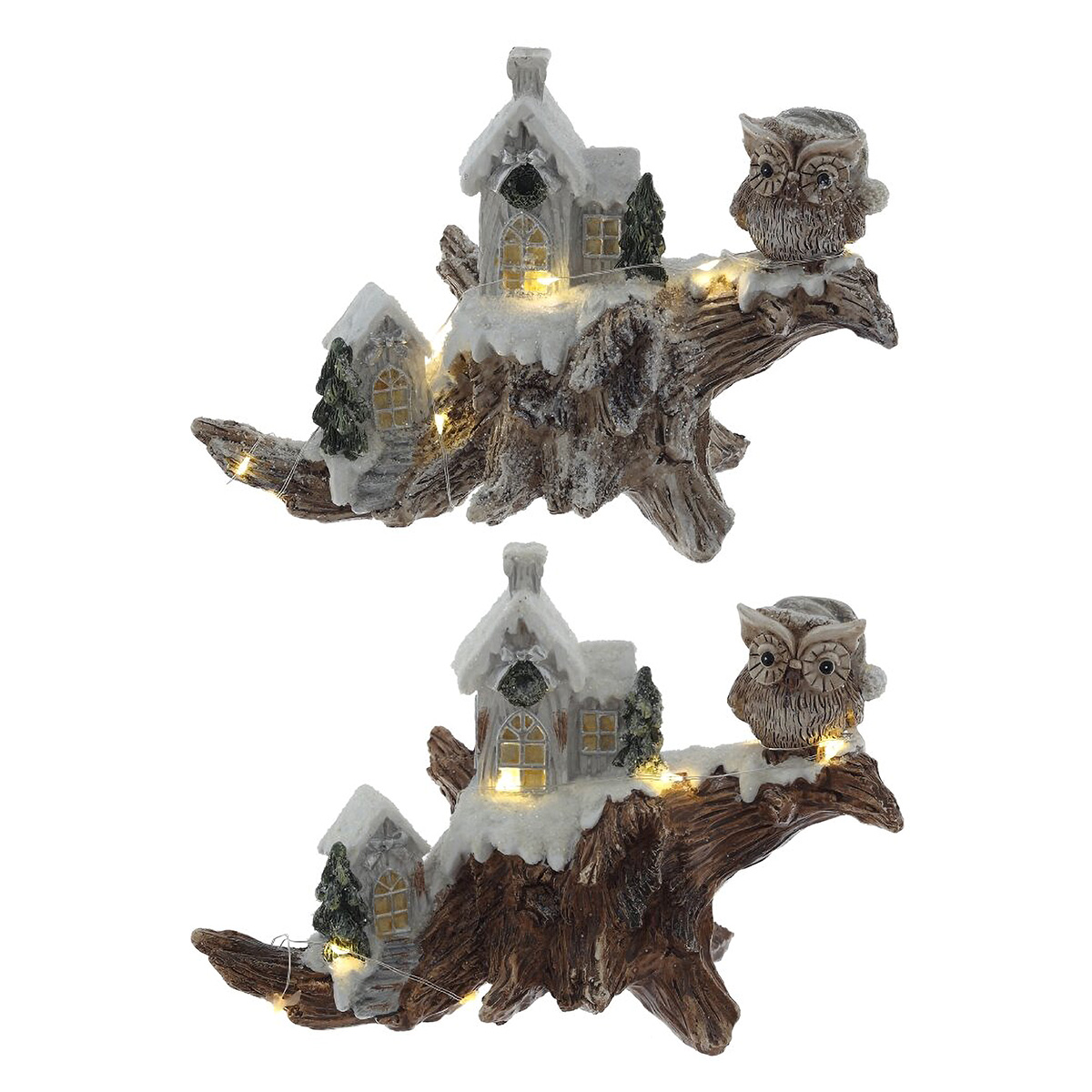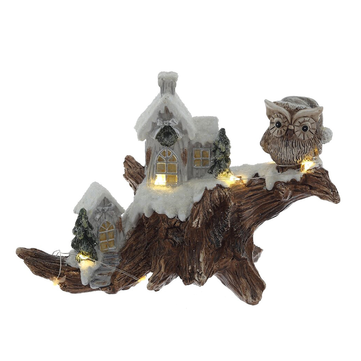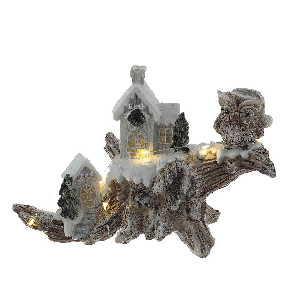 822546Фигурка декоративная "Зимняя композиция" с подсветкой [LR44x2,прилаг], L2, L20,5 W9 H14 см, 2в.Декоративная фигурка «Зимняя композиция» с подсветкой выполнена из полимерных материалов и передает атмосферу зимней сказки: на фактурной «коряге» разместились два заснеженных домика, хвойные деревца и внимательная сова. Теплые огоньки в окнах и тонкая светодиодная нить создают мягкое, уютное сияние. Изделие отлично смотрится на камине, полке или праздничном столе, подойдет для новогодней композиции и вечернего декора. Питание от 2 батареек LR44, экономичные светодиоды, аккуратная ручная роспись и искристый «снег». Прекрасная идея для подарка и создания домашнего уюта. Представлено в двух вариантах.