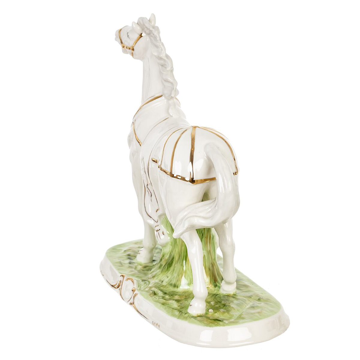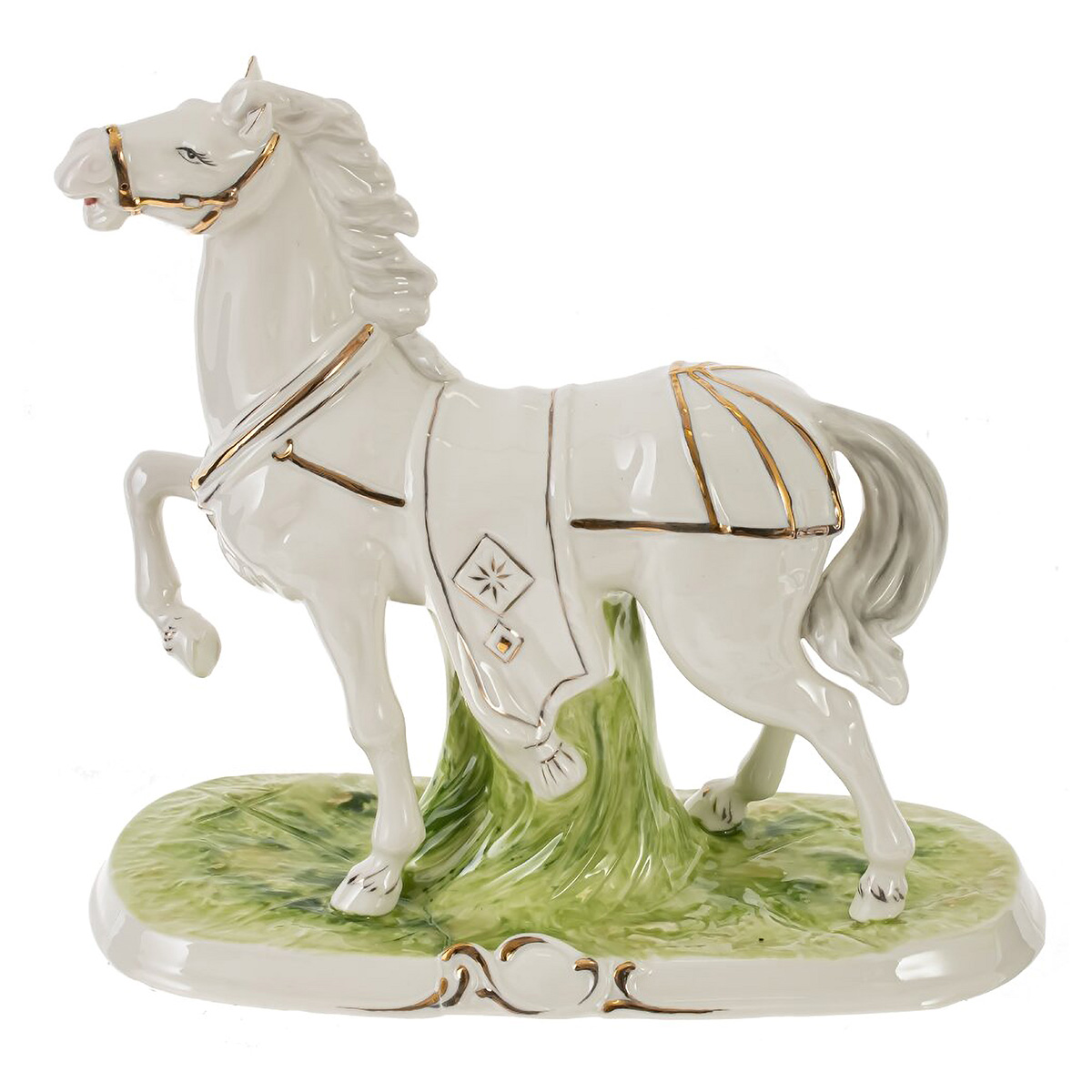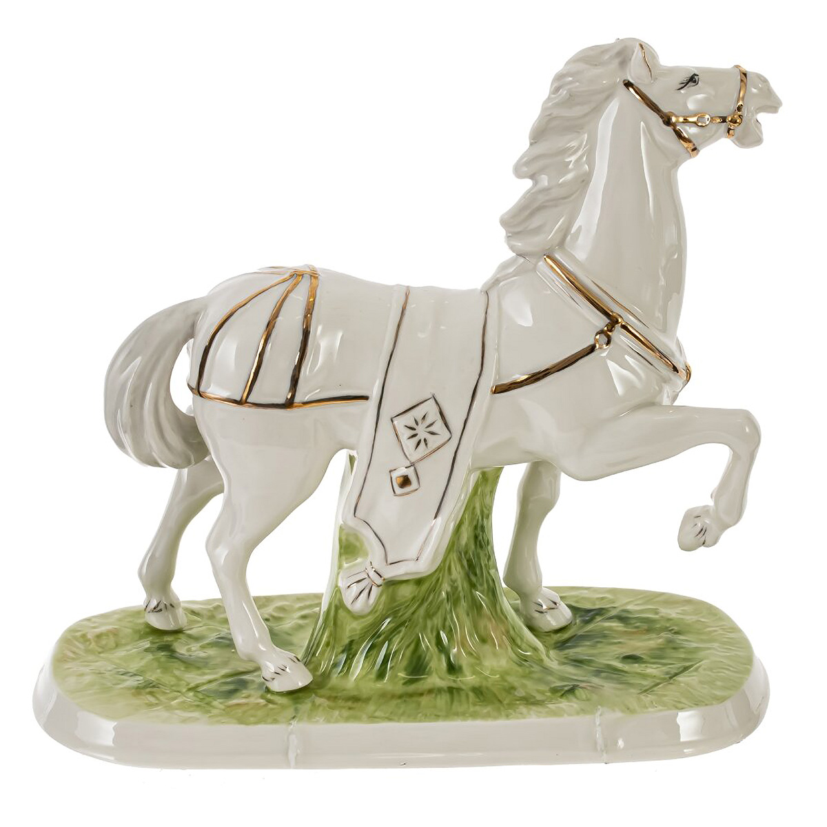 822596Фигурка декоративная "Лошадь", L23 W10 H22 смДекоративная фигурка «Лошадь» из гладкого фарфора — элегантный акцент для дома и офиса. Белый конь в динамичной стойке с приподнятой ногой и развевающейся гривой установлен на подставке, стилизованной под зелёную траву. Уздечка и элементы попоны подчеркнуты тонкими золотистыми линиями и лаконичным орнаментом. Глянцевая глазурь красиво отражает свет, подчеркивая плавность форм. Лошадь символизирует силу, удачу и стремление к успеху, поэтому фигурка станет выразительным символом года, уместным подарком коллегам и близким. Устойчивая база и нейтральная цветовая гамма легко впишутся в любой интерьер и дополнят фарфоровую коллекцию.