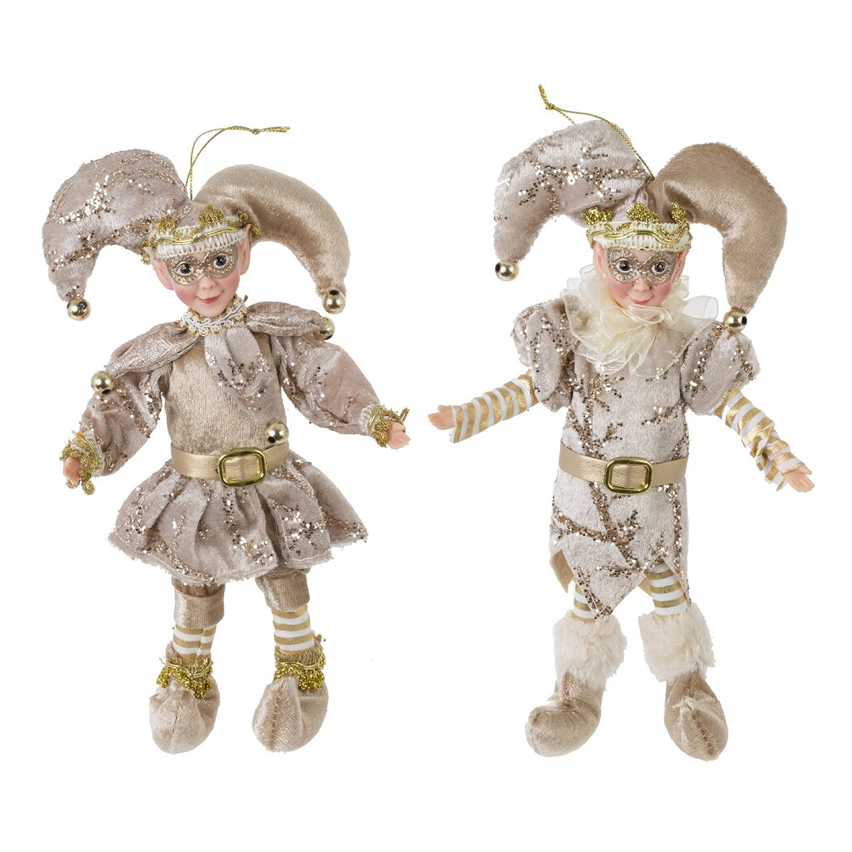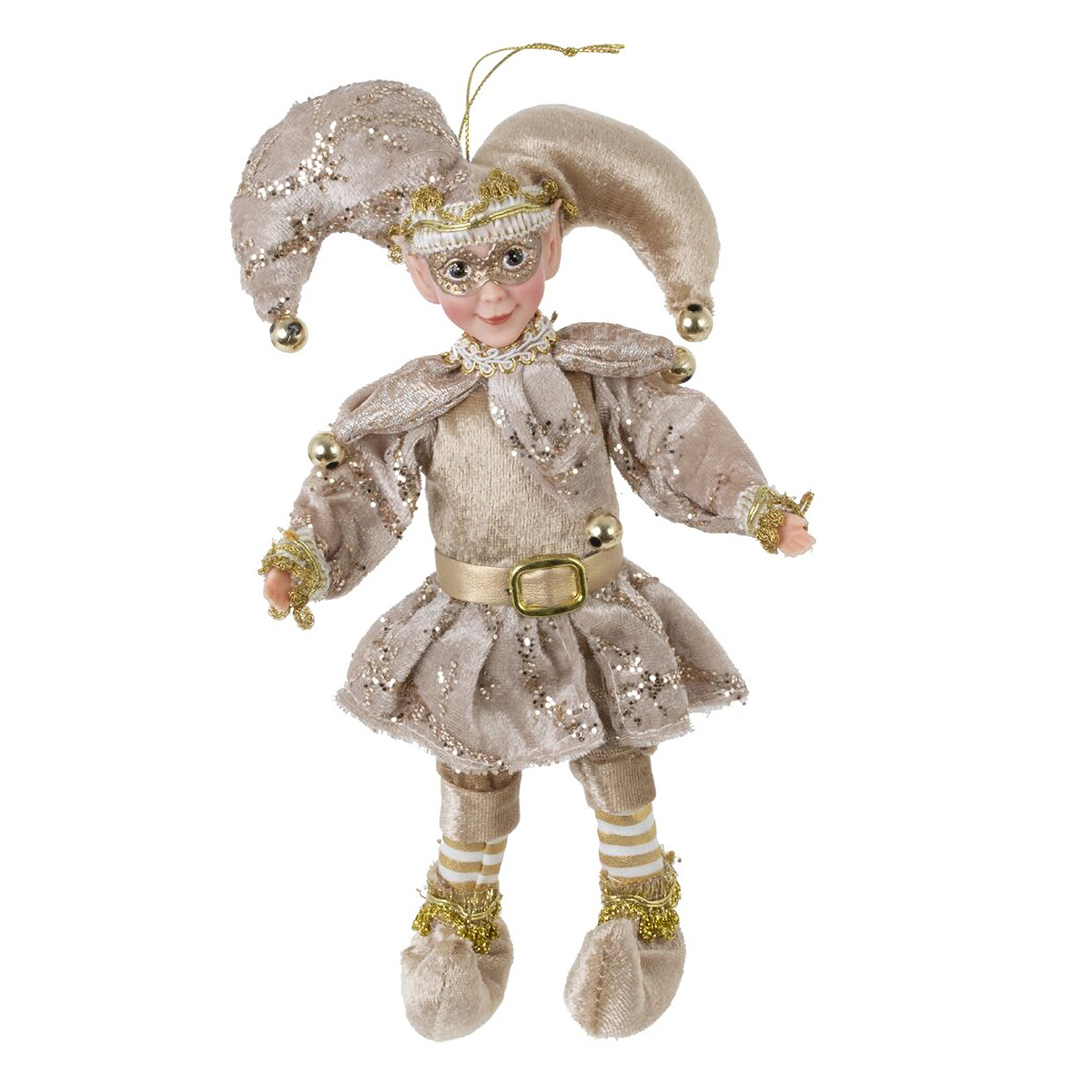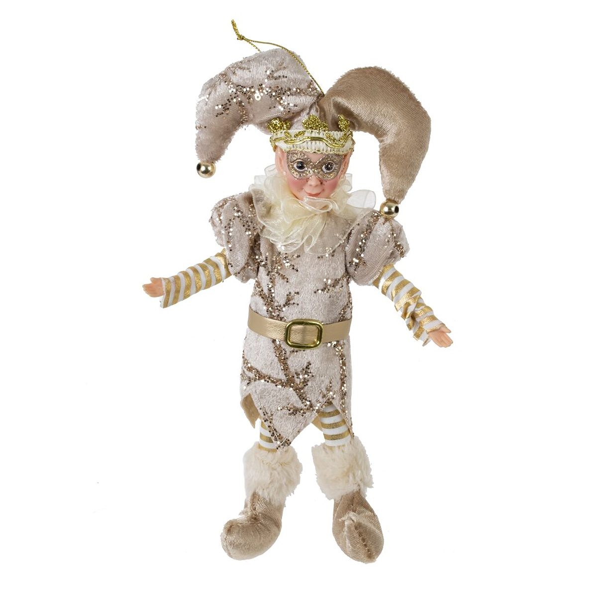 822903Игрушка набивная подвесная "Эльф", L13 W5 H26 см, 2в.Набивная игрушка «Эльф» — эффектное новогоднее украшение в бело?золотой гамме. Мягкое текстильное тело дополнено пластиковой милой мордашкой и сияющими деталями. Эльф одет в бархатистый костюм с блестящими завитками, пышными рукавами и поясом с пряжкой, на шее нежная фатиновая манишка. Двурогий колпак украшен золотистыми бубенчиками, на голове блестит мини?корона. Удлинённые ножки завершают пушистые сапожки. Сверху есть прозрачная петелька для подвеса на ёлку, венок или камин. Лёгкая и приятная на ощупь игрушка создаёт атмосферу зимней сказки и станет прекрасным подарком или акцентом праздничного декора. Представлено в двух вариантах.