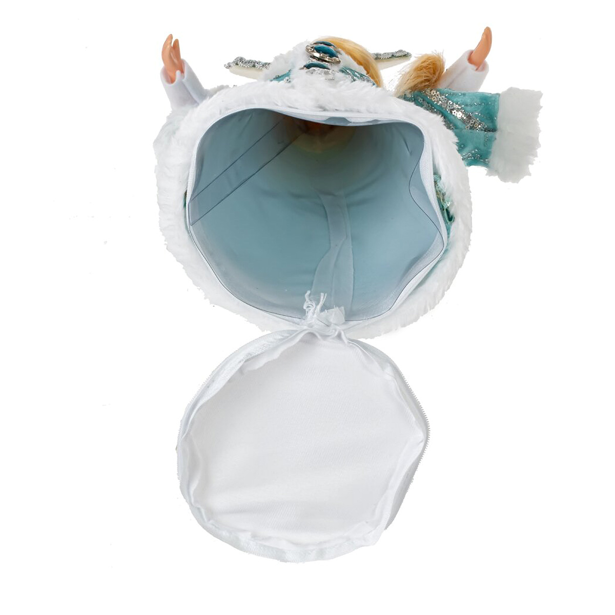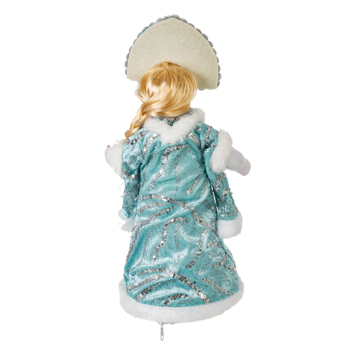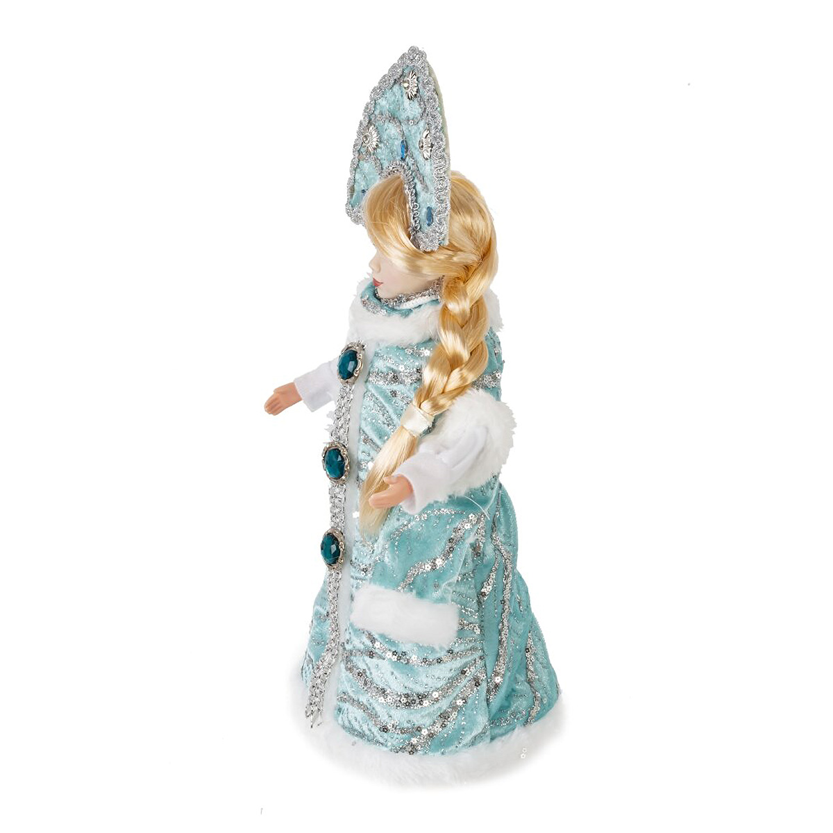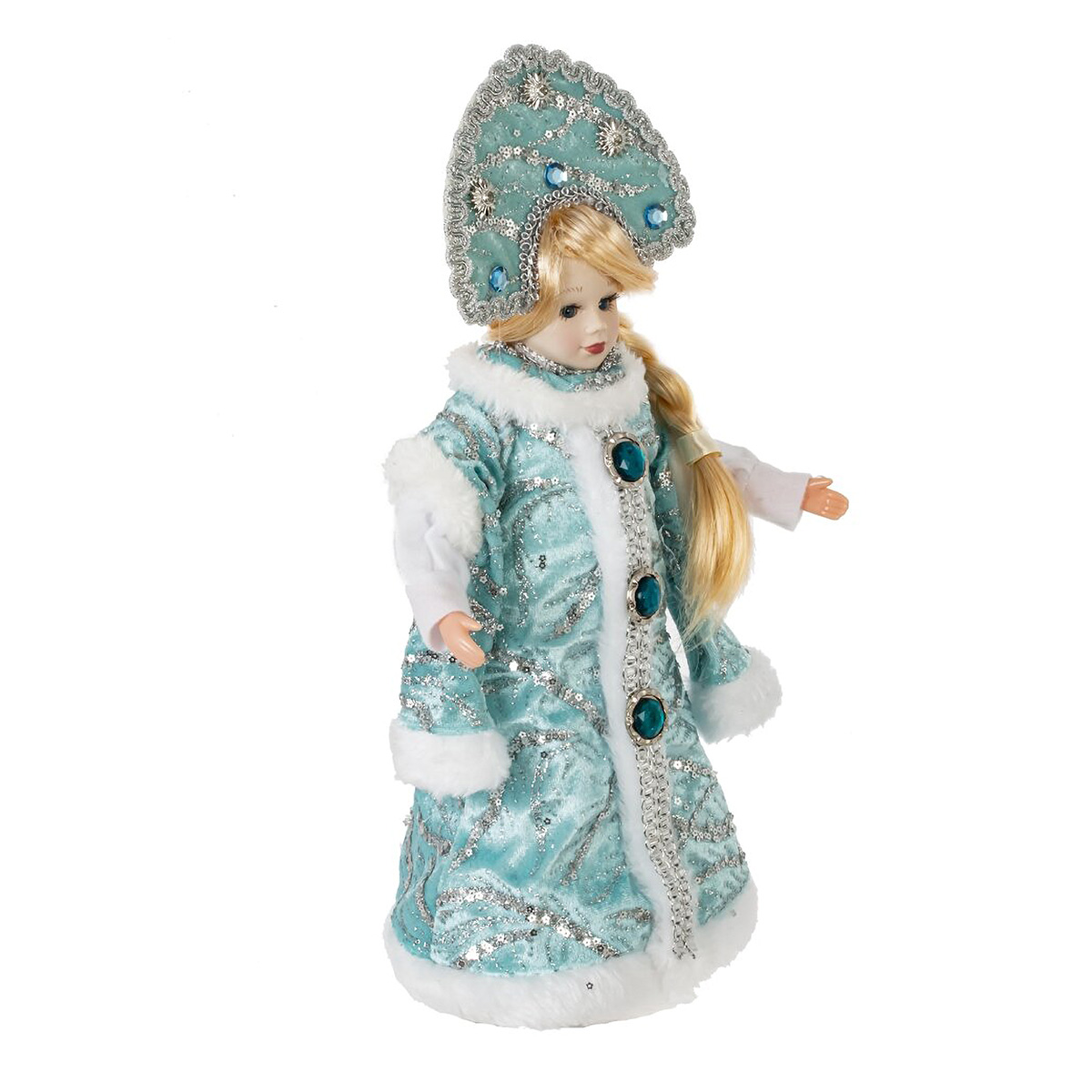 822911Снегурочка с ёмкостью для конфет, L16 W14 H36 смЭлегантная фигурка Снегурочки с ёмкостью для конфет станет центром новогоднего декора. Личико и ладони выполнены из фарфора, что придаёт образу изящность и коллекционную ценность. Богатый голубой кафтан из текстильных материалов украшен серебристой вышивкой, меховой опушкой и крупными бирюзовыми камнями. На голове — нарядный кокошник с пайетками и тесьмой, коса из полимерных материалов выглядит аккуратно и устойчиво держит форму. В основании скрыт контейнер, куда можно сложить шоколадные конфеты, карамель или небольшие печенья. Изделие сочетает фарфор, текстиль и полимерные элементы, поэтому смотрится празднично, сохраняя при этом практичность: Снегурочка одновременно украшает интерьер, служит мини-сверкницей для угощений и станет отличным подарком к Новому году.