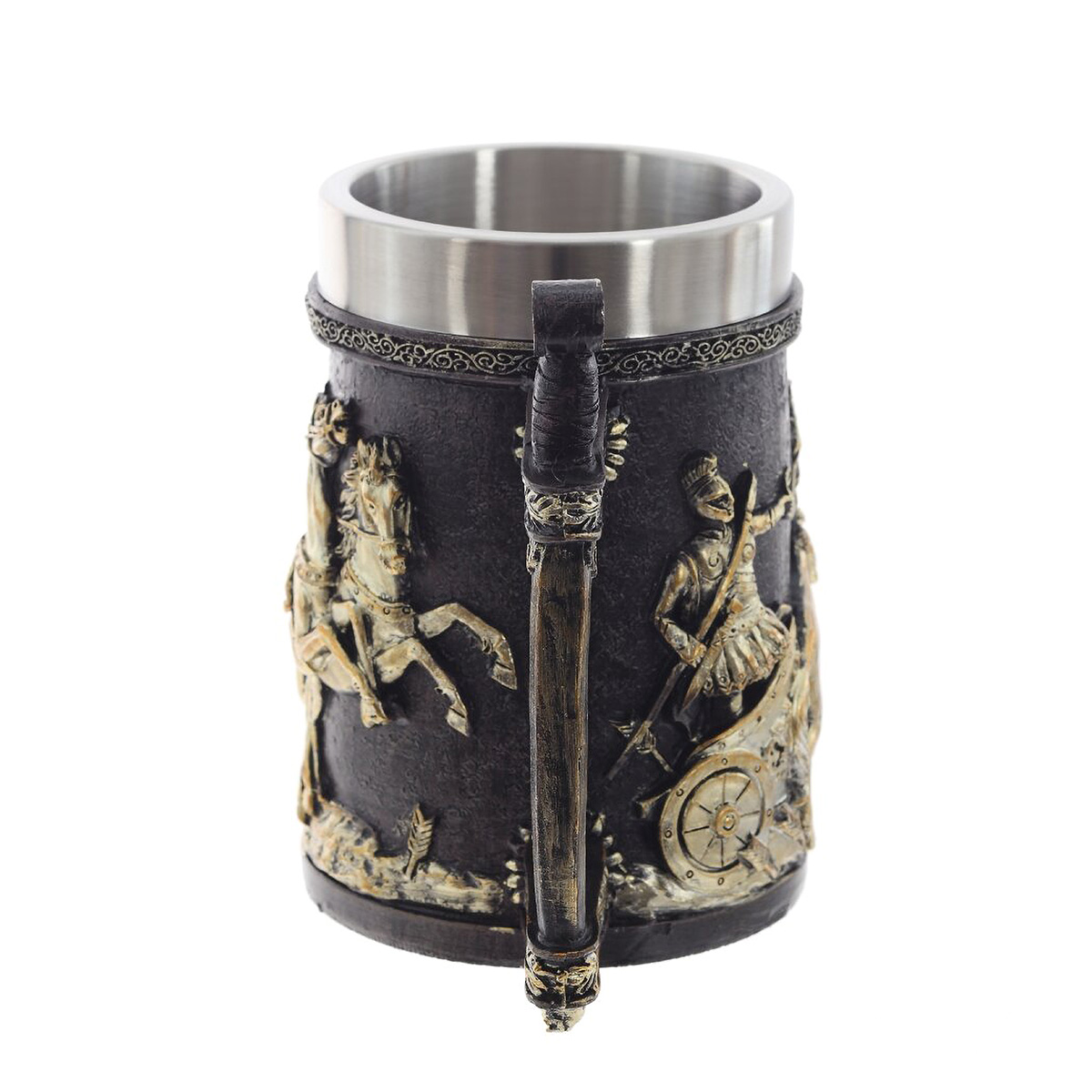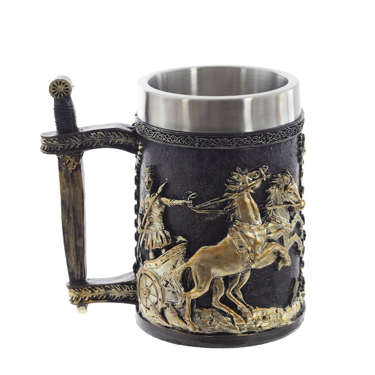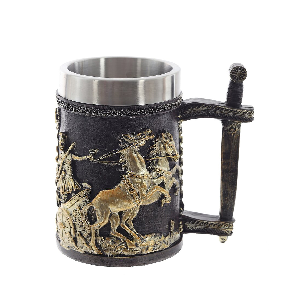 823580Кружка "Лошадь", 560 мл, L15,5 W10,5 H14,5 смЭффектная кружка «Лошадь» объёмом 560 мл сочетает практичность и коллекционный характер. Внутренняя чаша выполнена из коррозионностойкой стали: не ржавеет, не впитывает запахи и легко очищается. Наружная часть из прочных полимерных материалов оформлена богатым рельефом с динамичной сценой скакунов и колесницы, подчеркнутой благородным золотистым патинированием. Устойчивое широкое дно и массивная рукоять в форме меча обеспечивают удобный хват. Подходит для горячих и холодных напитков, станет эффектным подарком любителям истории и лошадей. Для сохранения декора рекомендуется бережное ручное мытьё.