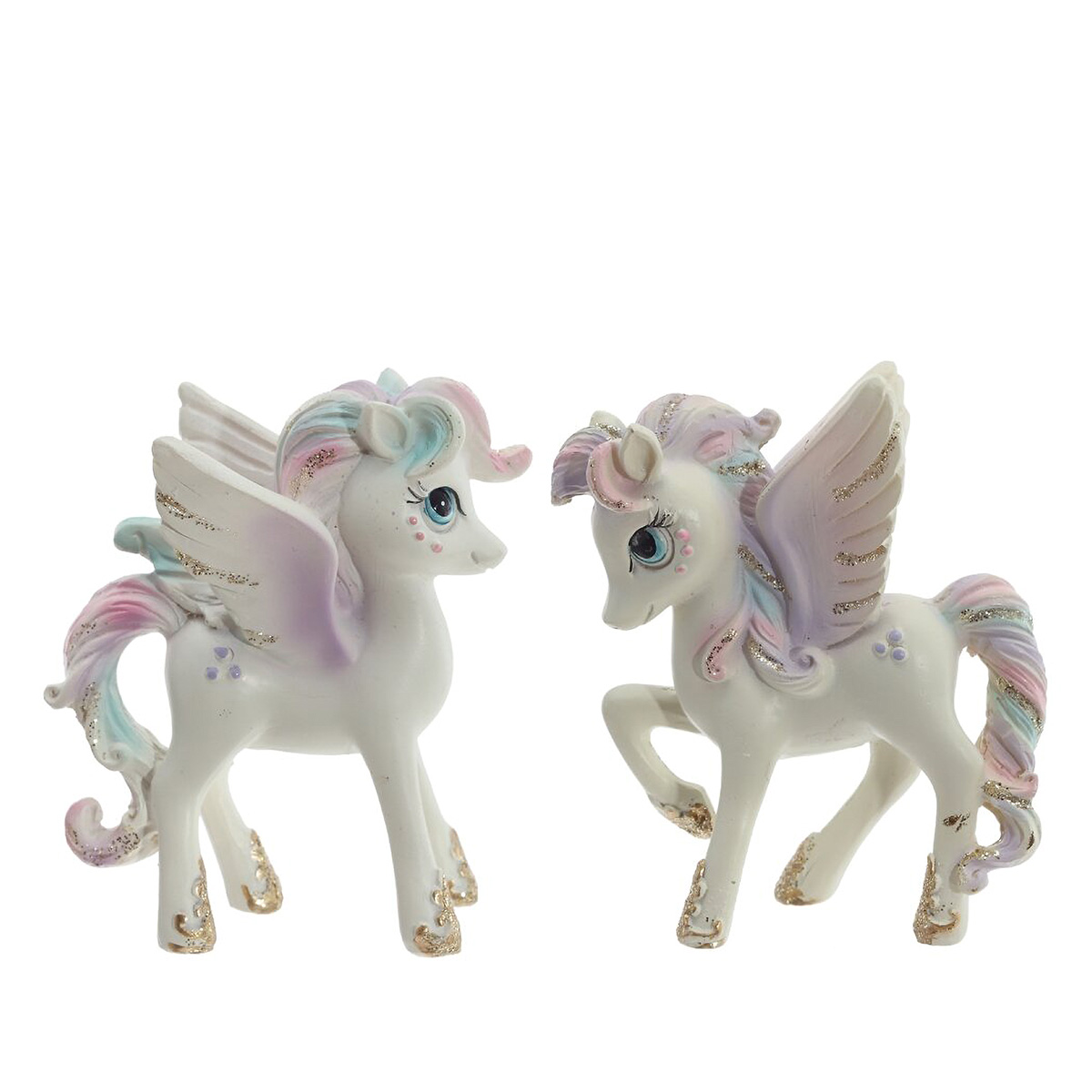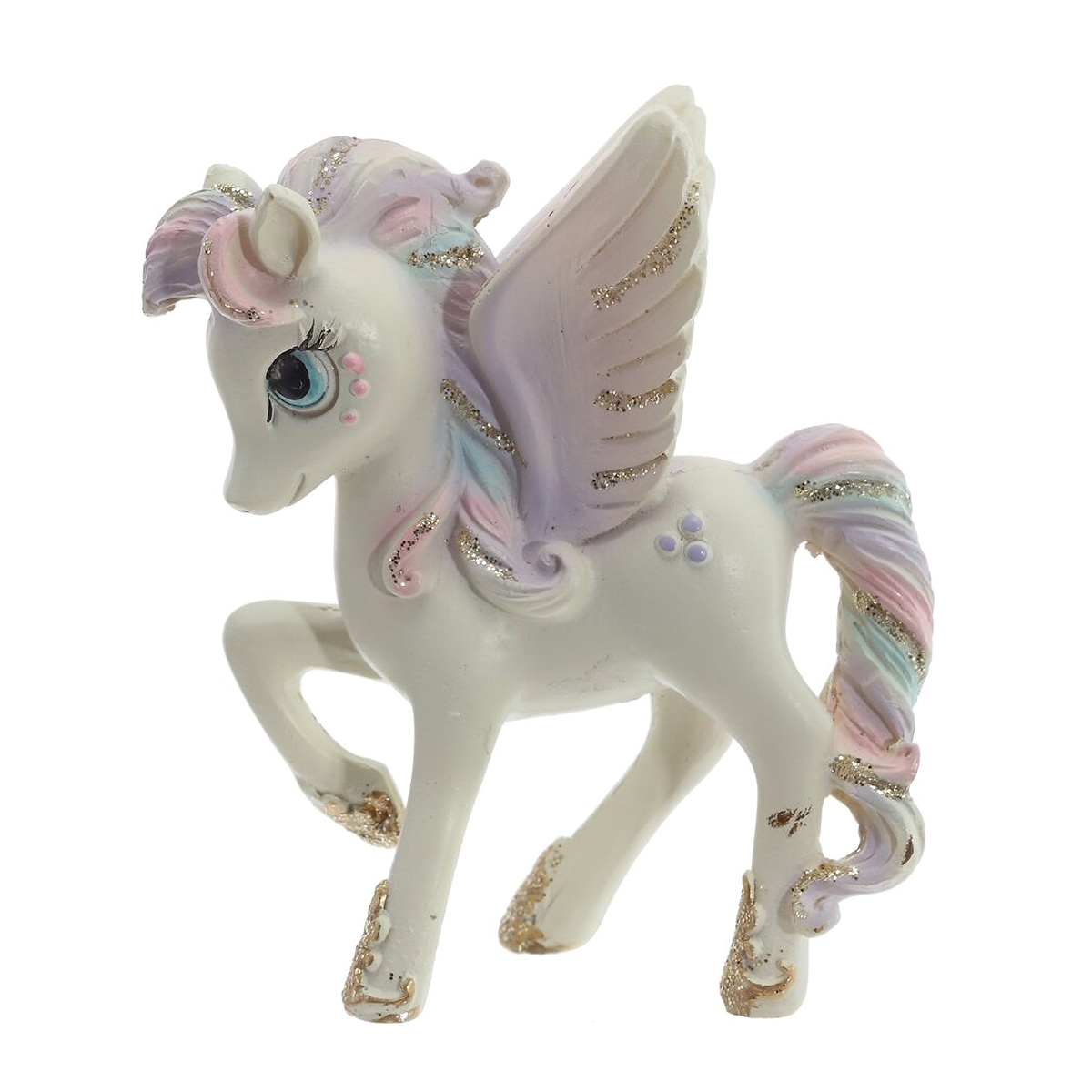 824211Фигурка декоративная "Пегас", L7,5 W3,5 H8 см, 2в.Декоративная фигурка из полимерных материалов в виде милого крылатого пони. Основа молочно-белая, грива и хвост выполнены в нежных пастельных оттенках розового, лавандового и голубого, с мерцающими вкраплениями блёсток. Крылья рельефные, с золотистыми акцентами; копытца и локоны также украшены глиттером. Пони стоит в игривой позе с приподнятой передней ножкой, большие голубые глаза придают образу выразительность. Лёгкая и прочная, фигурка красиво смотрится на полке, в детской, качестве праздничного или подарочного декора, создавая атмосферу сказки и нежности.